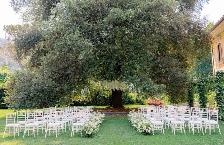 Концепция свадьбы – современная классика с романтичным настроением. Лаконичные основные цвета: белый и зелёный. Сама площадка продиктовала нам романтичное оформление церемонии под раскидистым деревом, к которому вела дорожка, обрамлённая цветами.