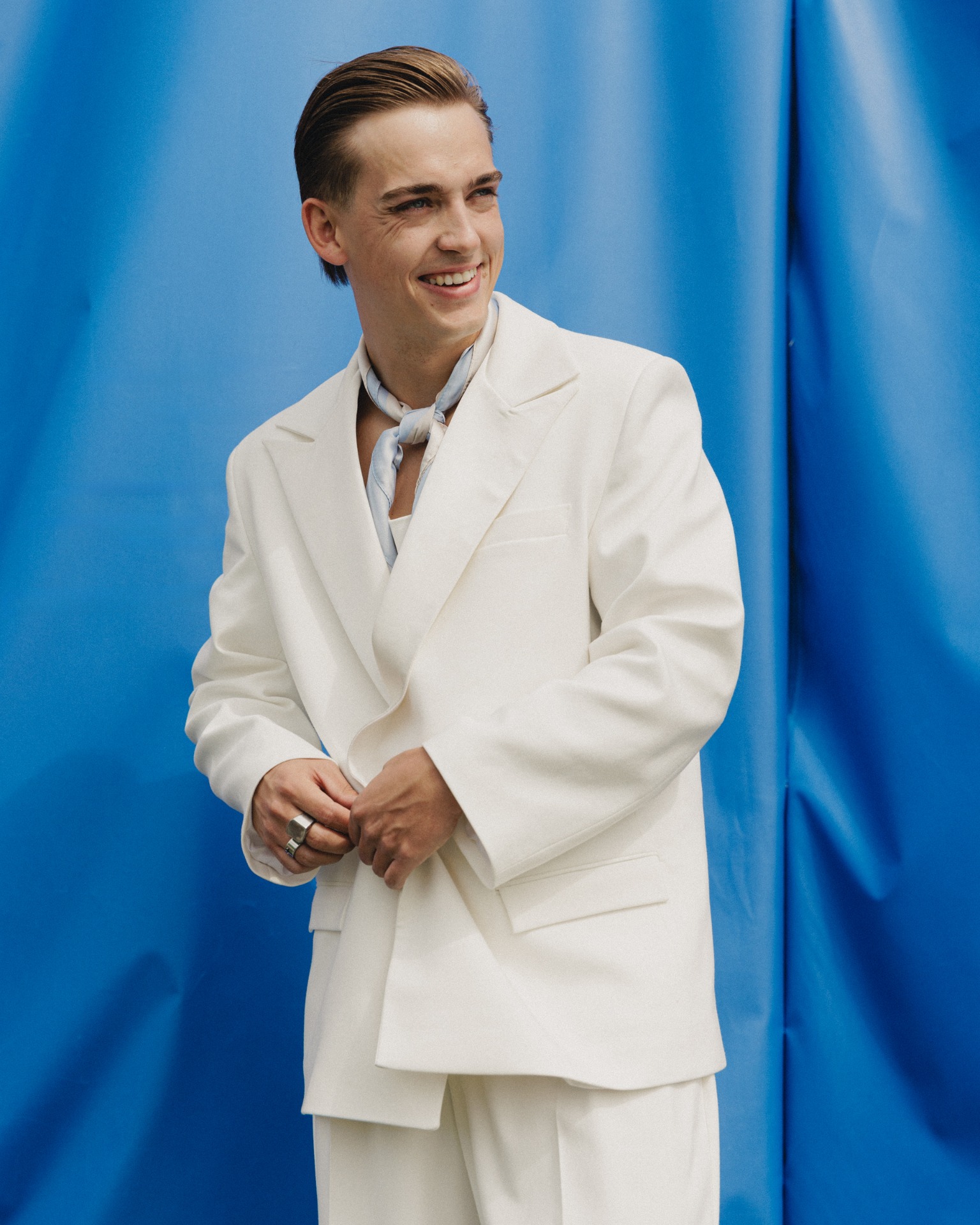 Шёлковый галстук-платок послужит альтернативой классическому варианту и сделает образ интереснее.