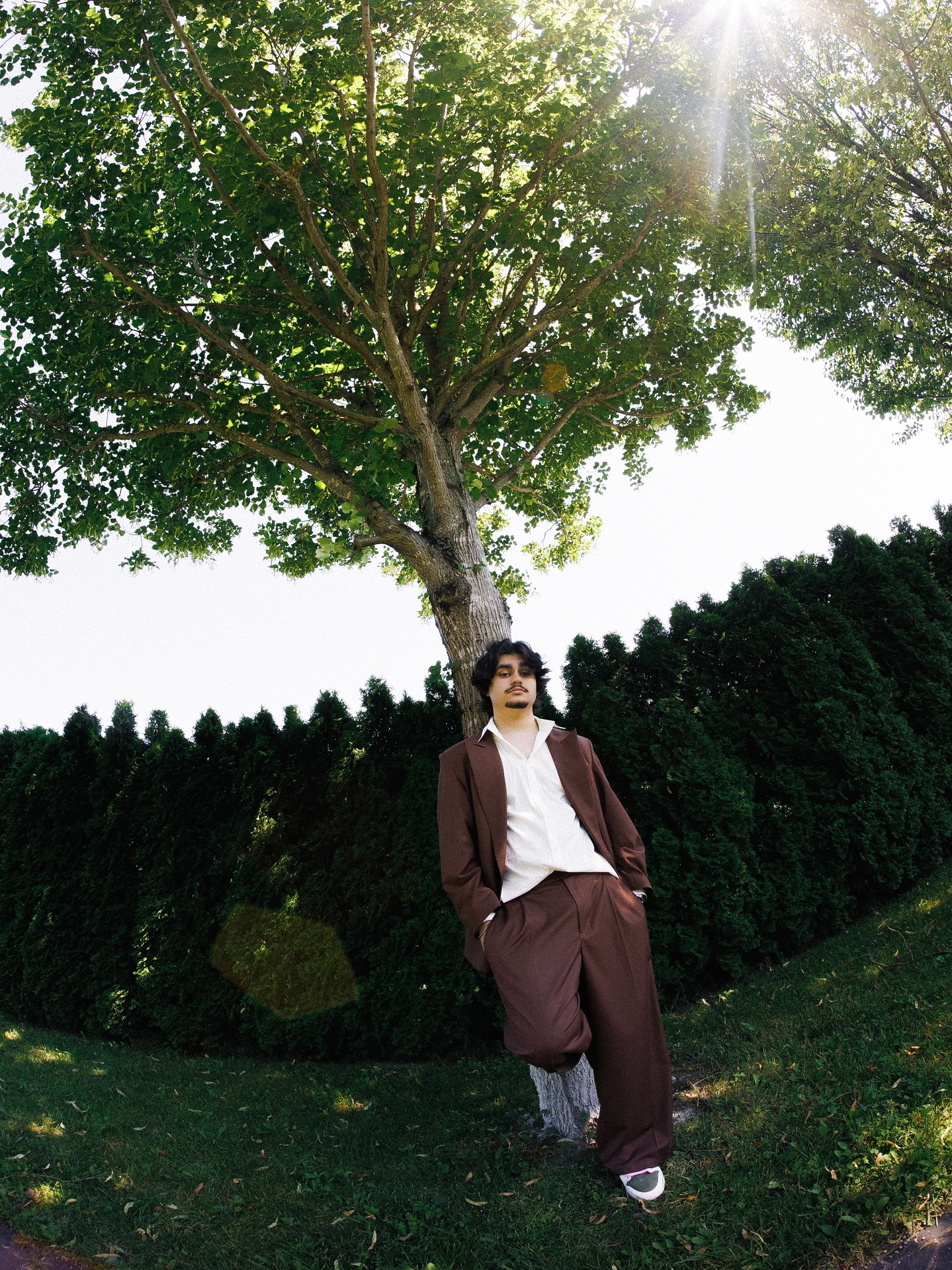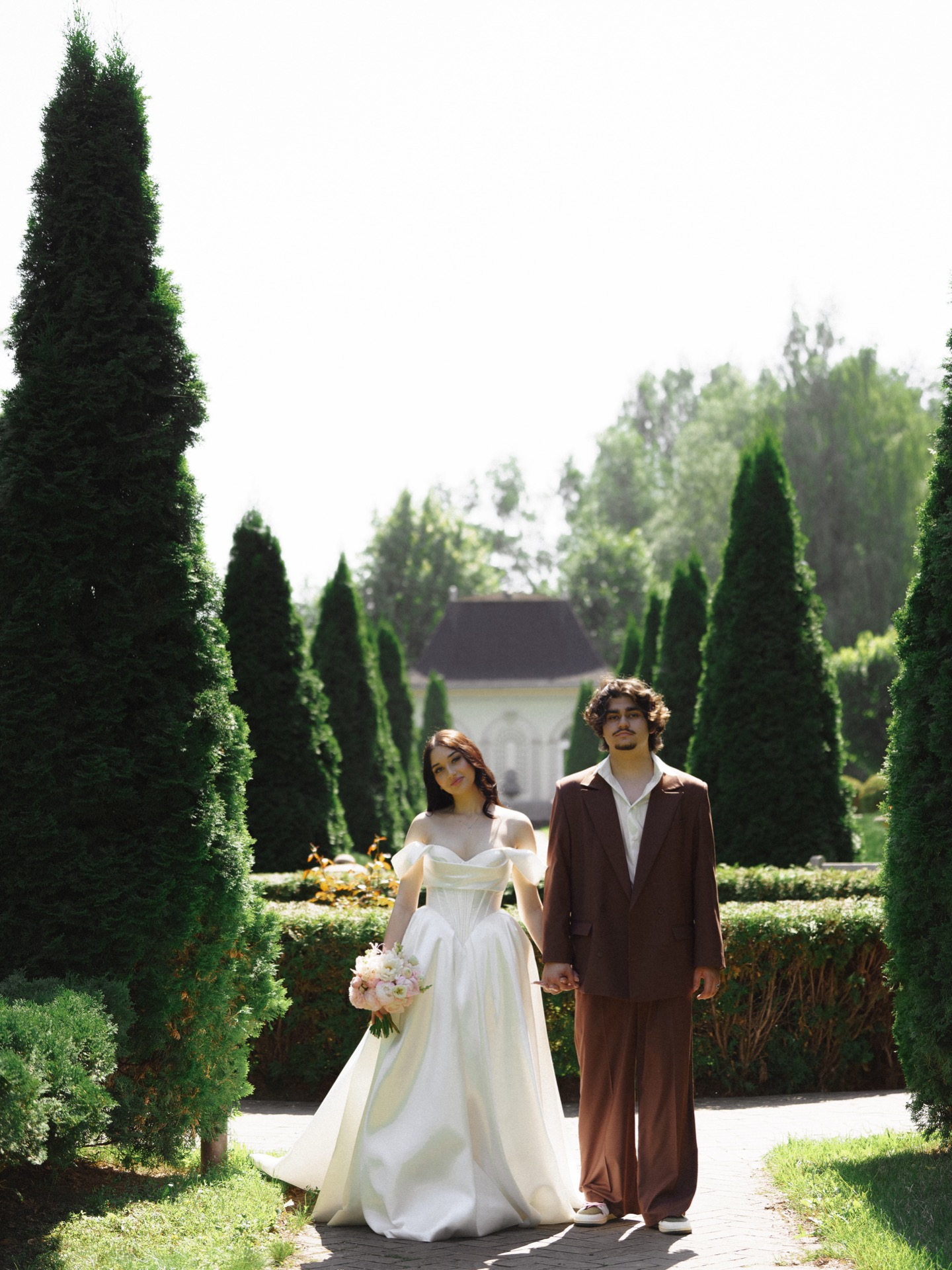 Даниил никогда не любил классику, поэтому в день нашей свадьбы решил не изменять своему стилю и выбрал коричневый костюм oversize. Образ для него сшил дизайнер Artem Midda — получился стильный наряд, который по-настоящему его отражал.