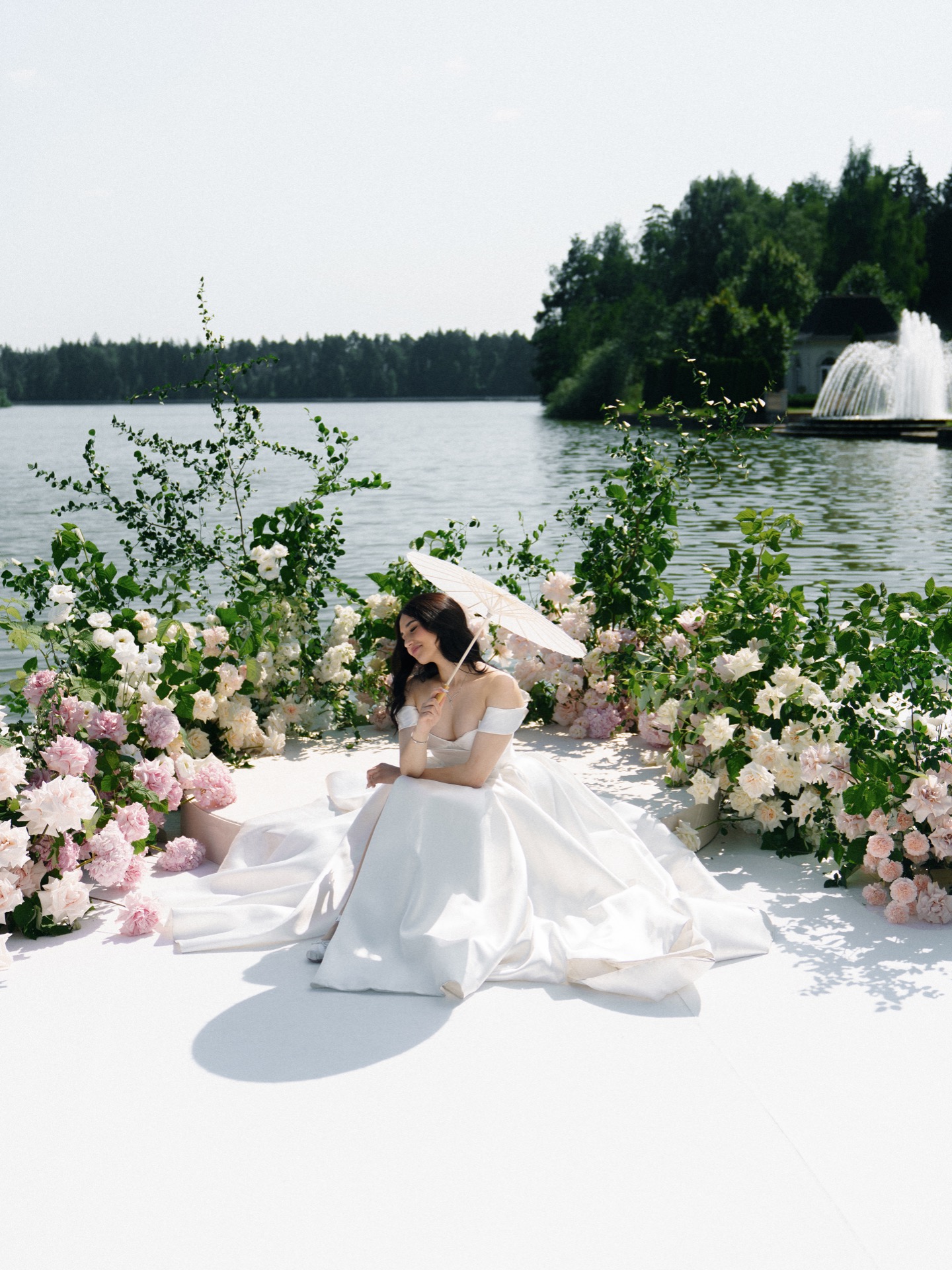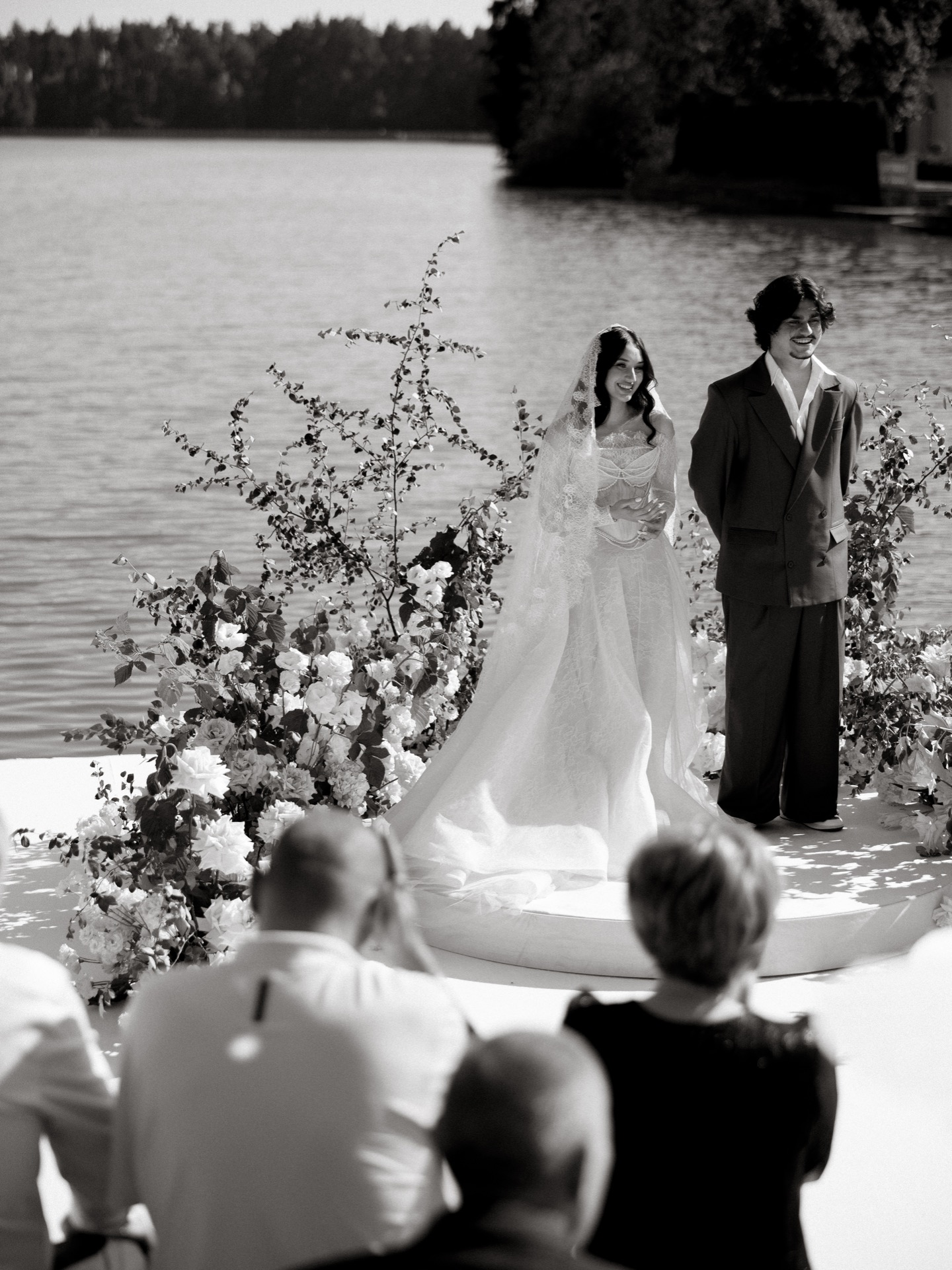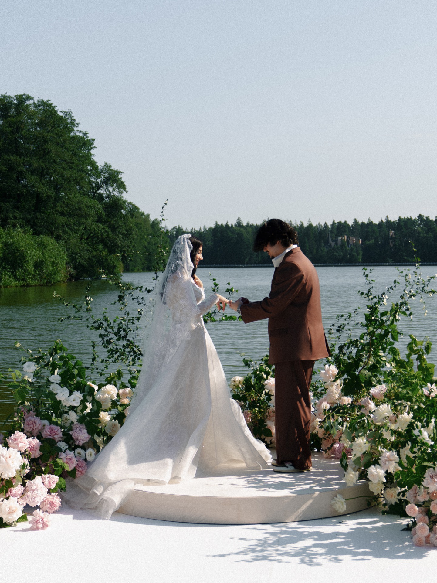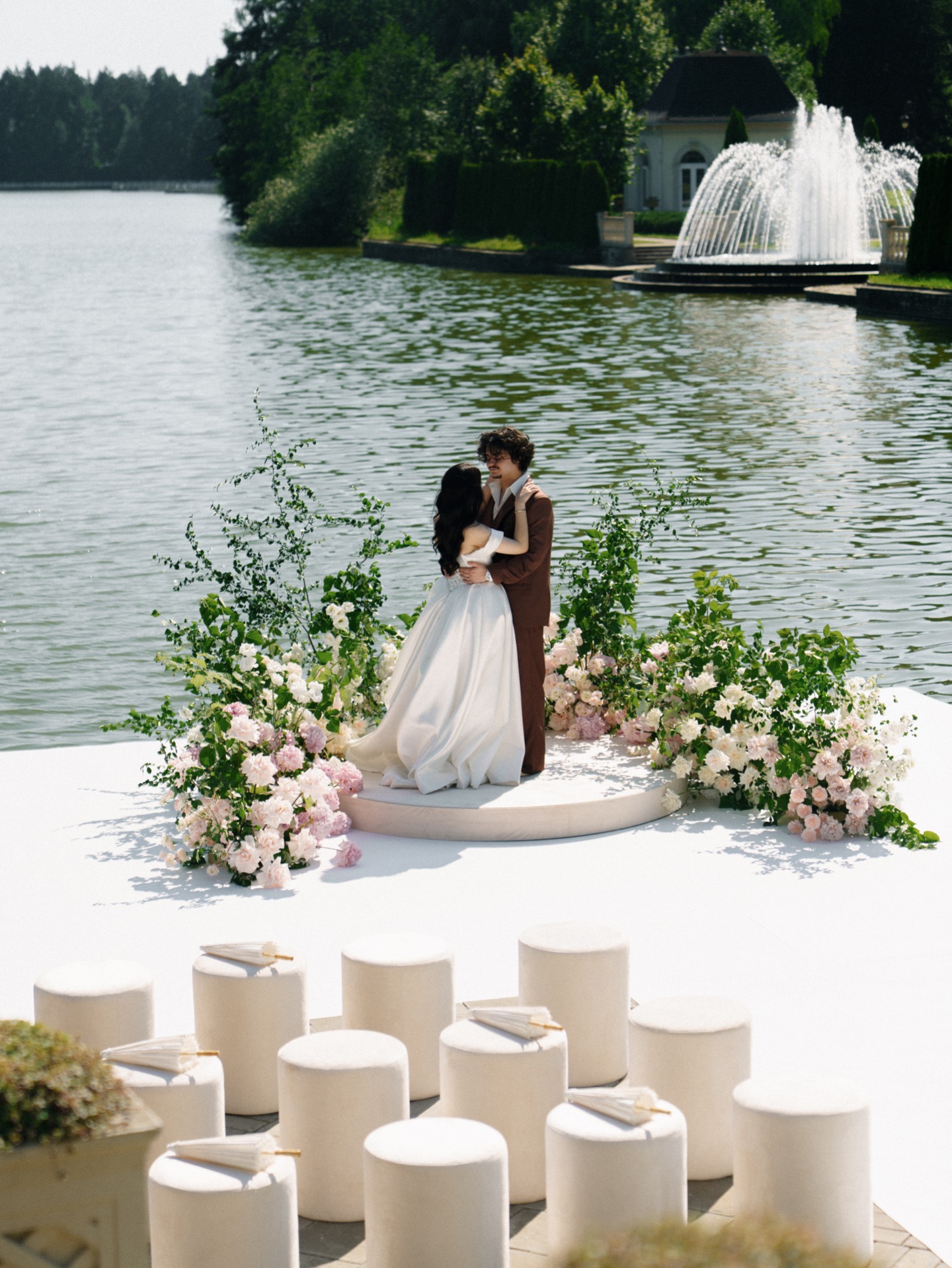 На церемонии мы решили обойтись без арки, поэтому остановили свой выбор на бархатном подиуме и живом озеленении, чтобы не закрывать живописный вид на озеро.
