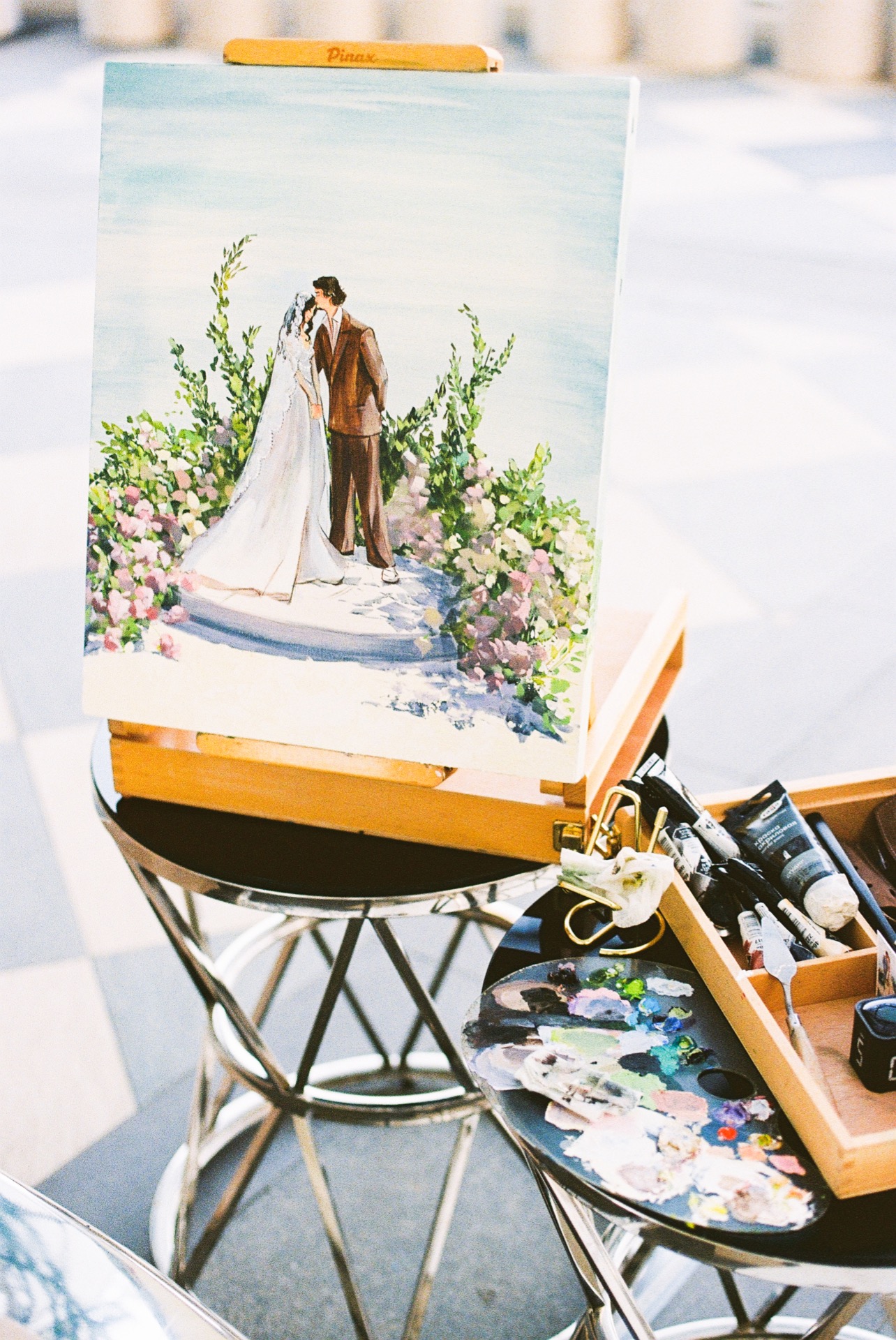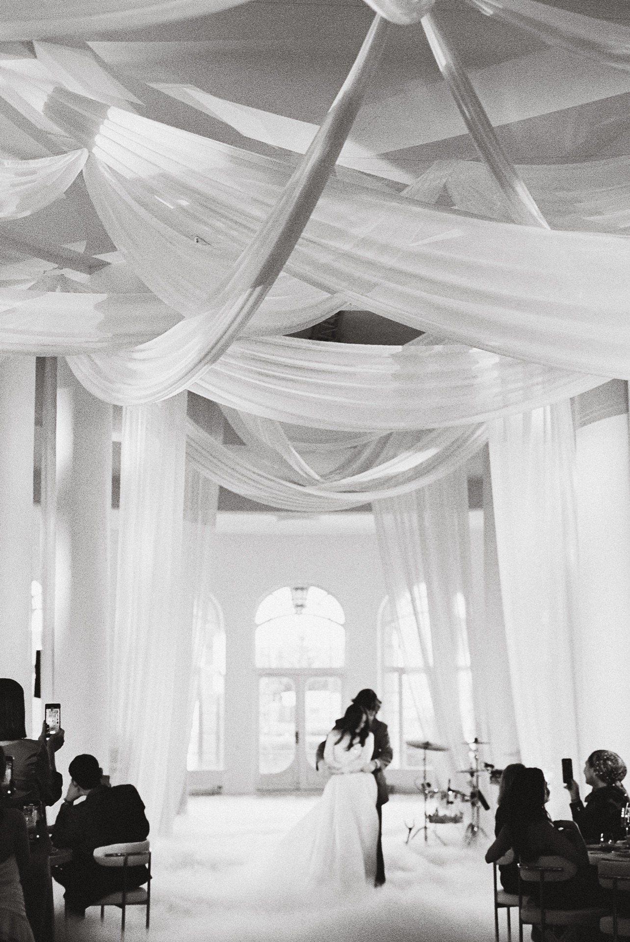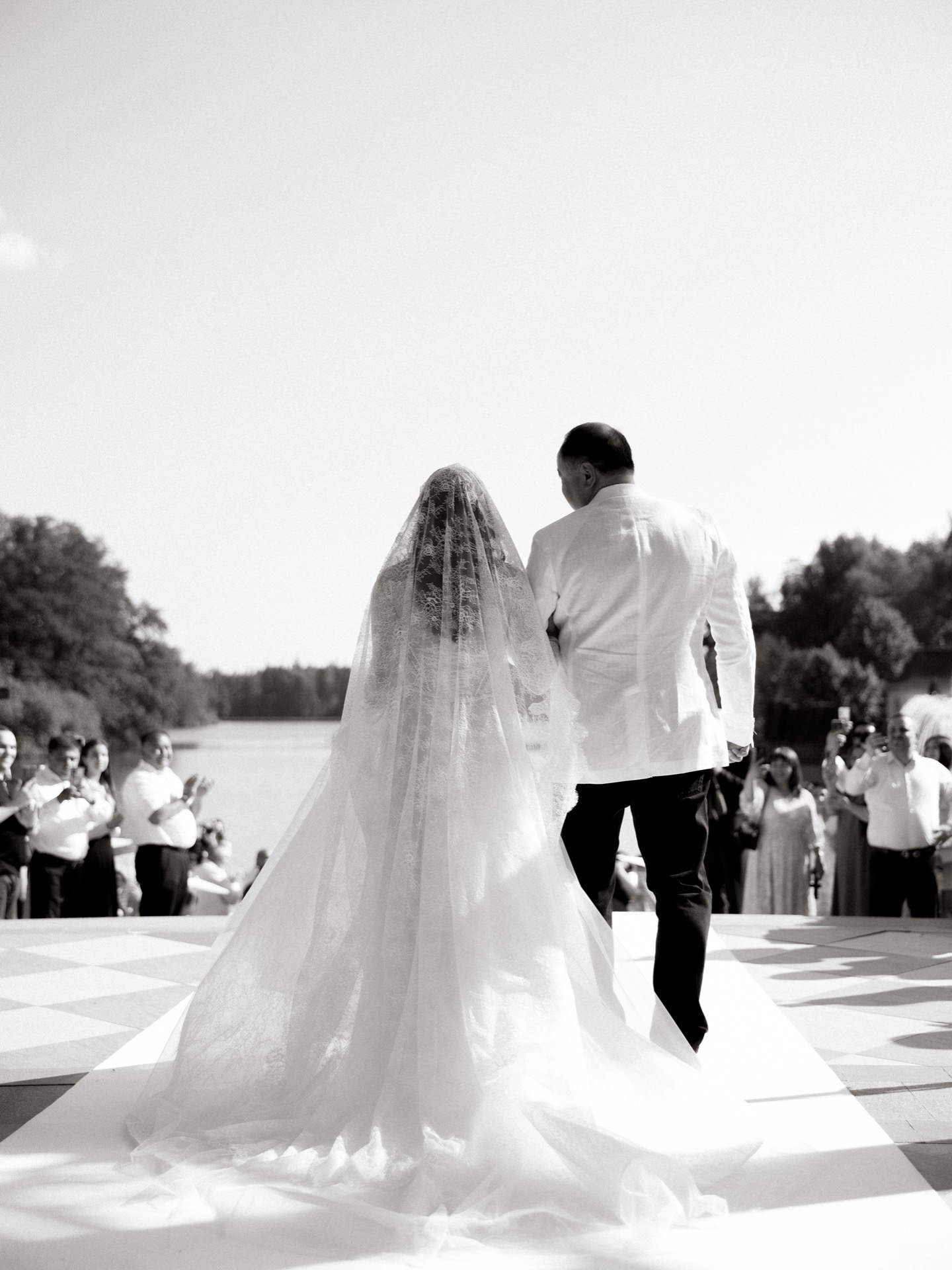 Церемония стала самым трогательным акцентом. К алтарю меня вёл папа, и этот момент я никогда не забуду. Наш ведущий Адис Маммо рассказывал историю нашей пары, а художница в это время писала картину прямо во время церемонии — получилось невероятно красиво и символично. Это стало нашей отсылкой к винтажной эстетике и эпохе балов, когда ещё не существовало фотоаппаратов.