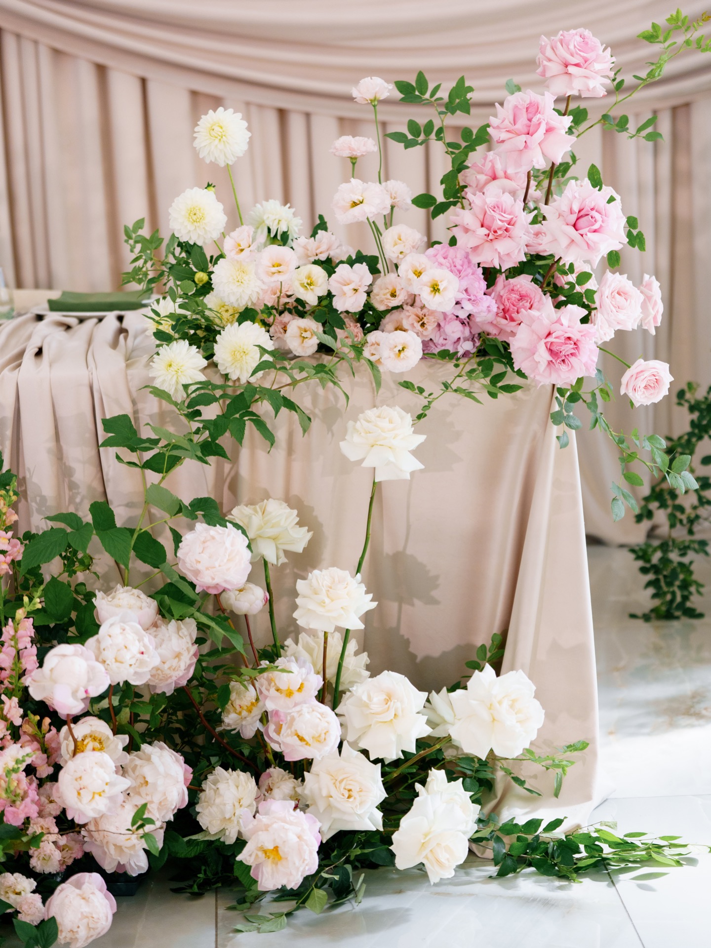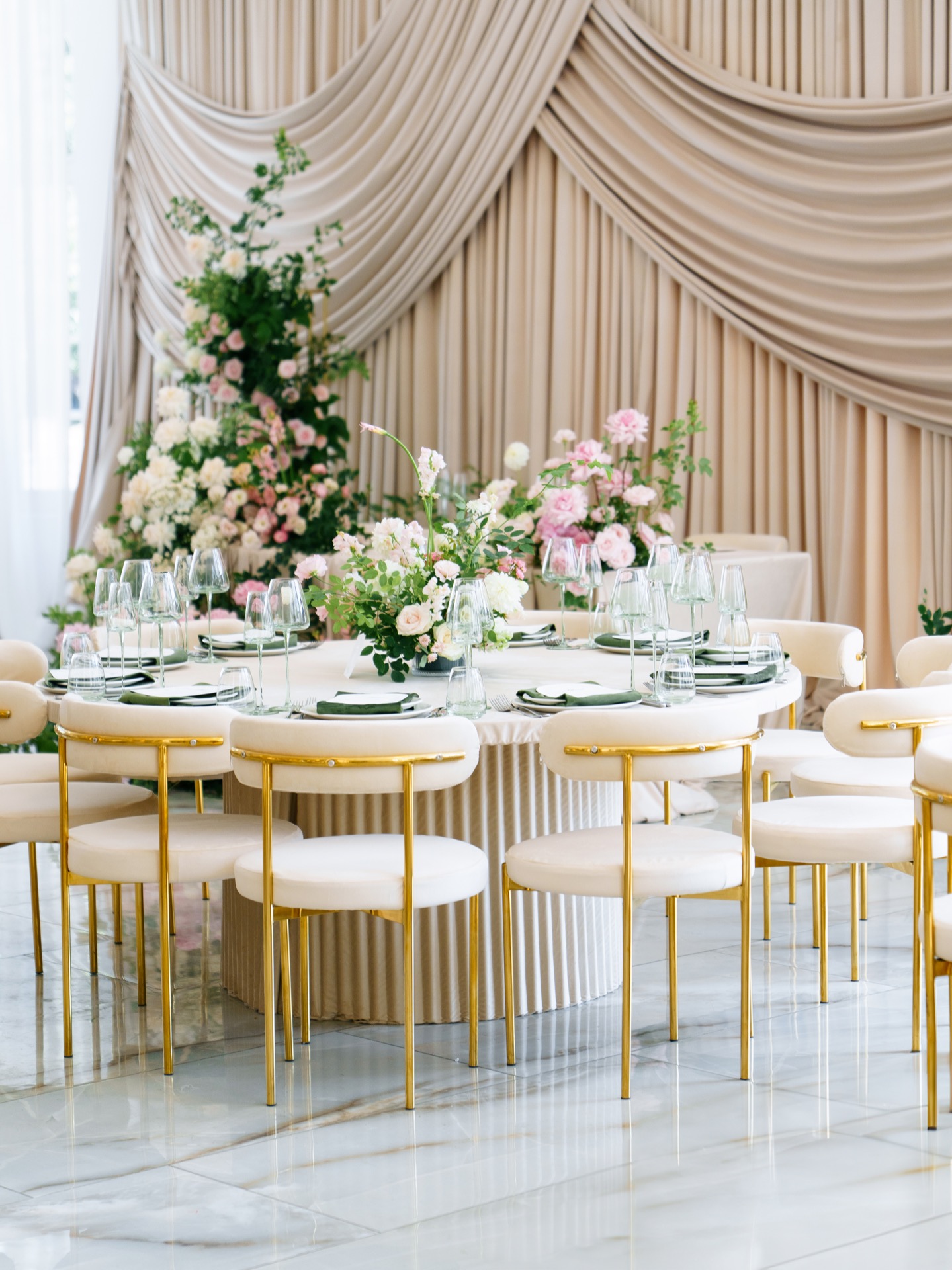 Мы выбрали пастельную палитру, а в качестве декора — драпировки и садовые цветы. Деталям мы уделили особое внимание. Наш декоратор Настя дополнила оформление зелёными бокалами, персонализированными меню с изысканным принтом и изящной сервировкой.