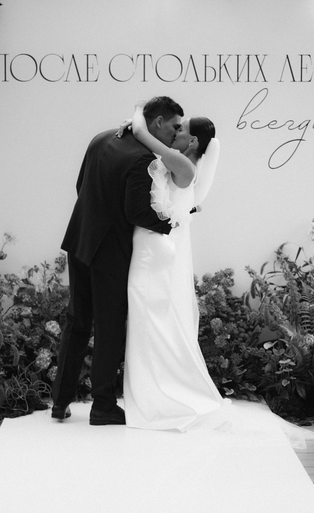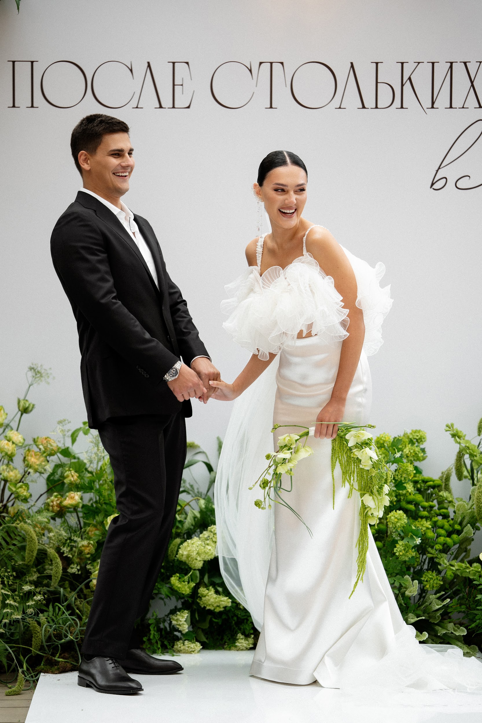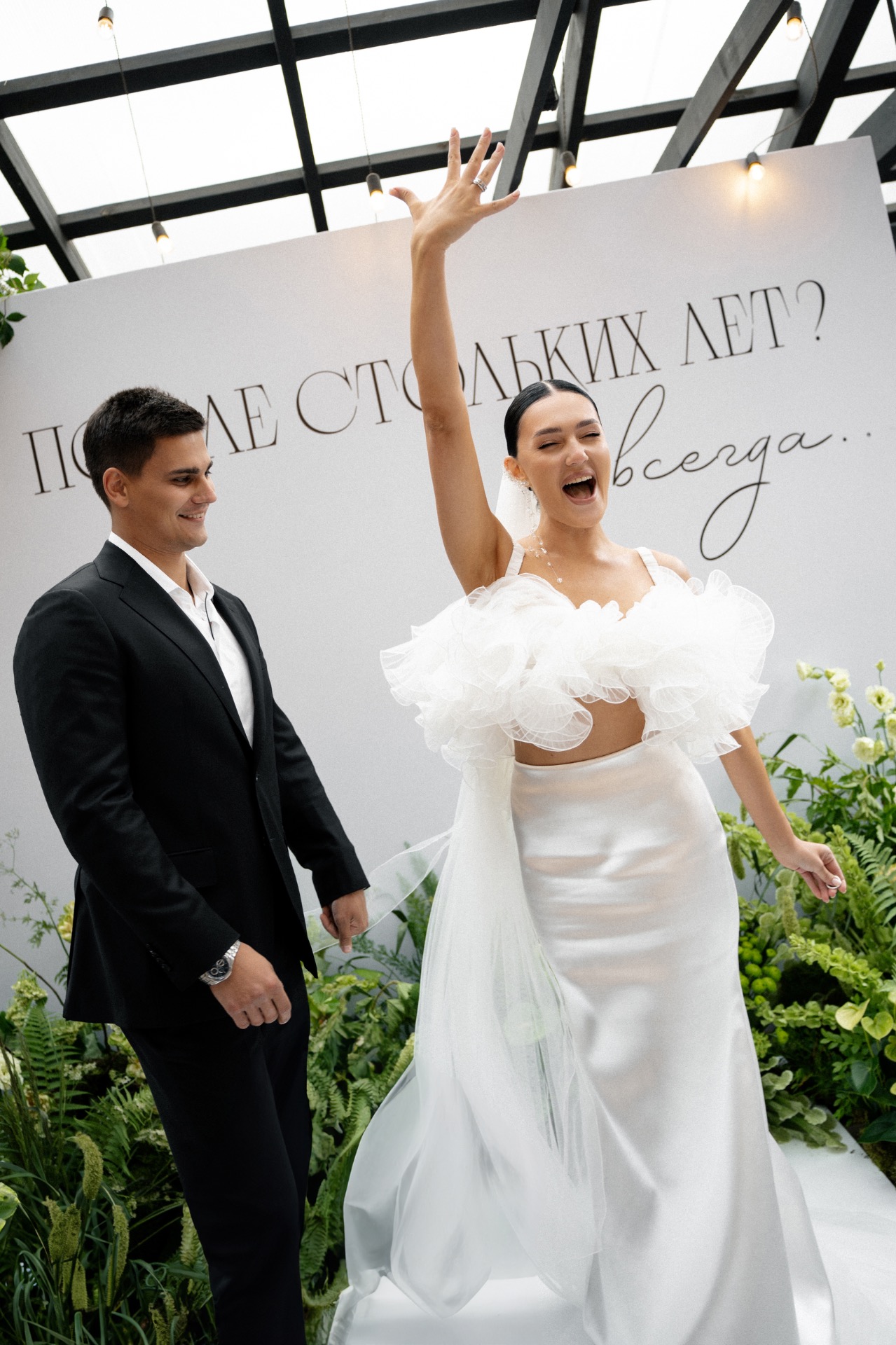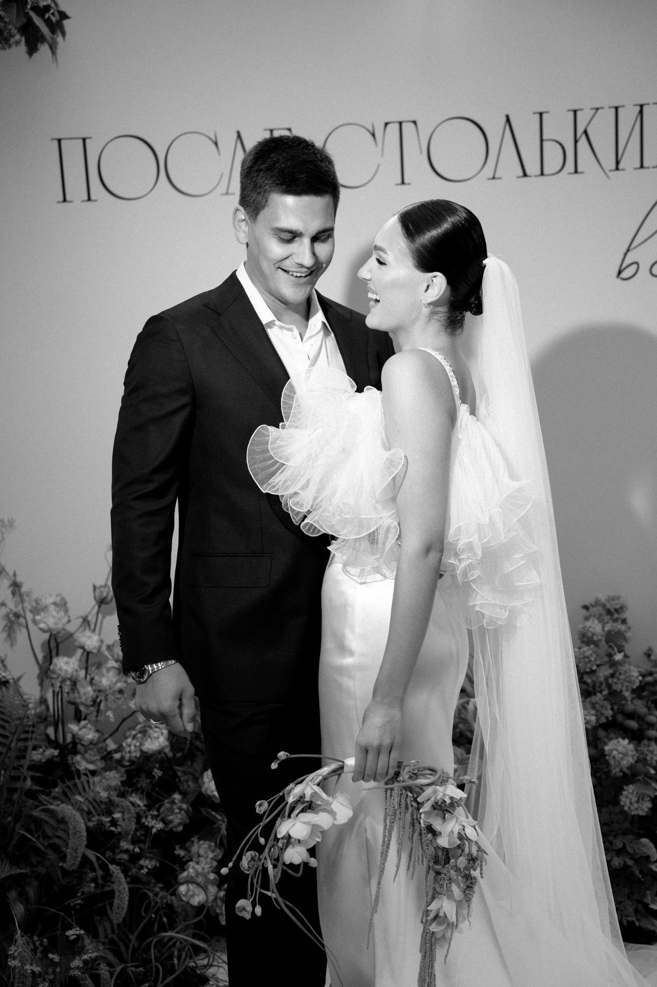 Вся моя жизнь связана с контентом, и я точно знала, что у нас будет очень красиво. Ещё до предложения я представляла, какую свадьбу хочу — сочетание чёрного, белого цветов и живой необычной флористики. Особое внимание мы уделили необычной форме букета — это любовь.