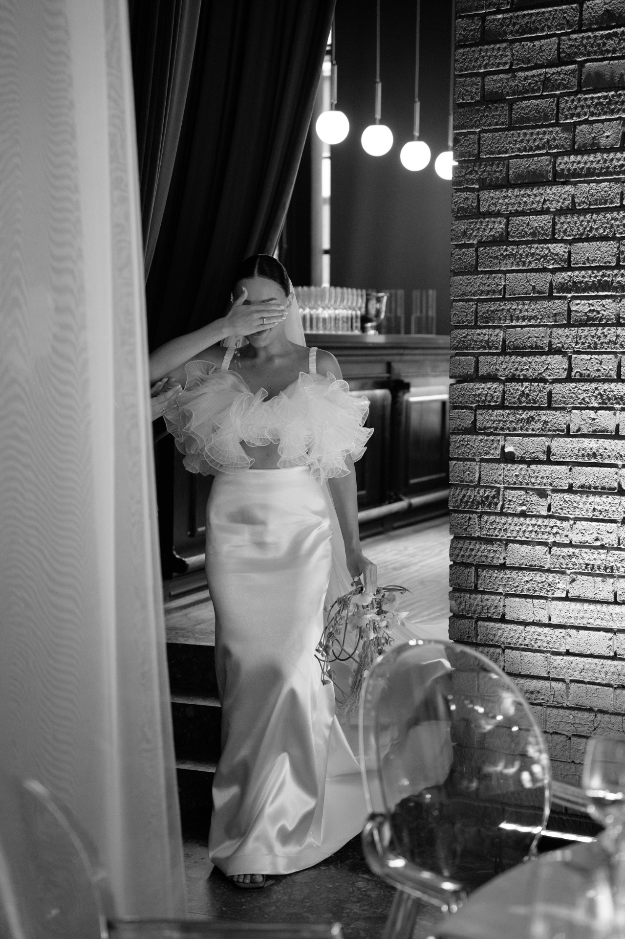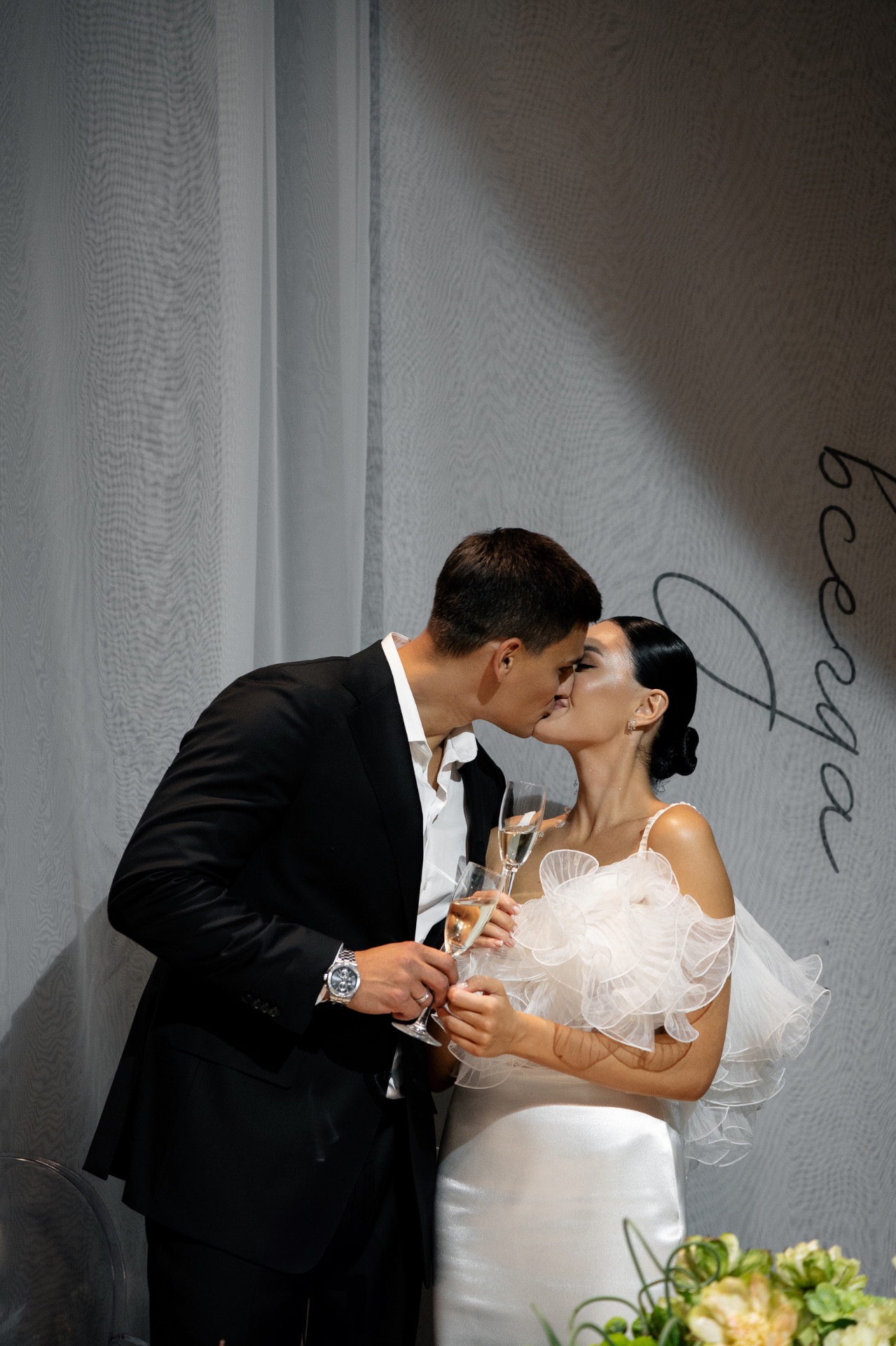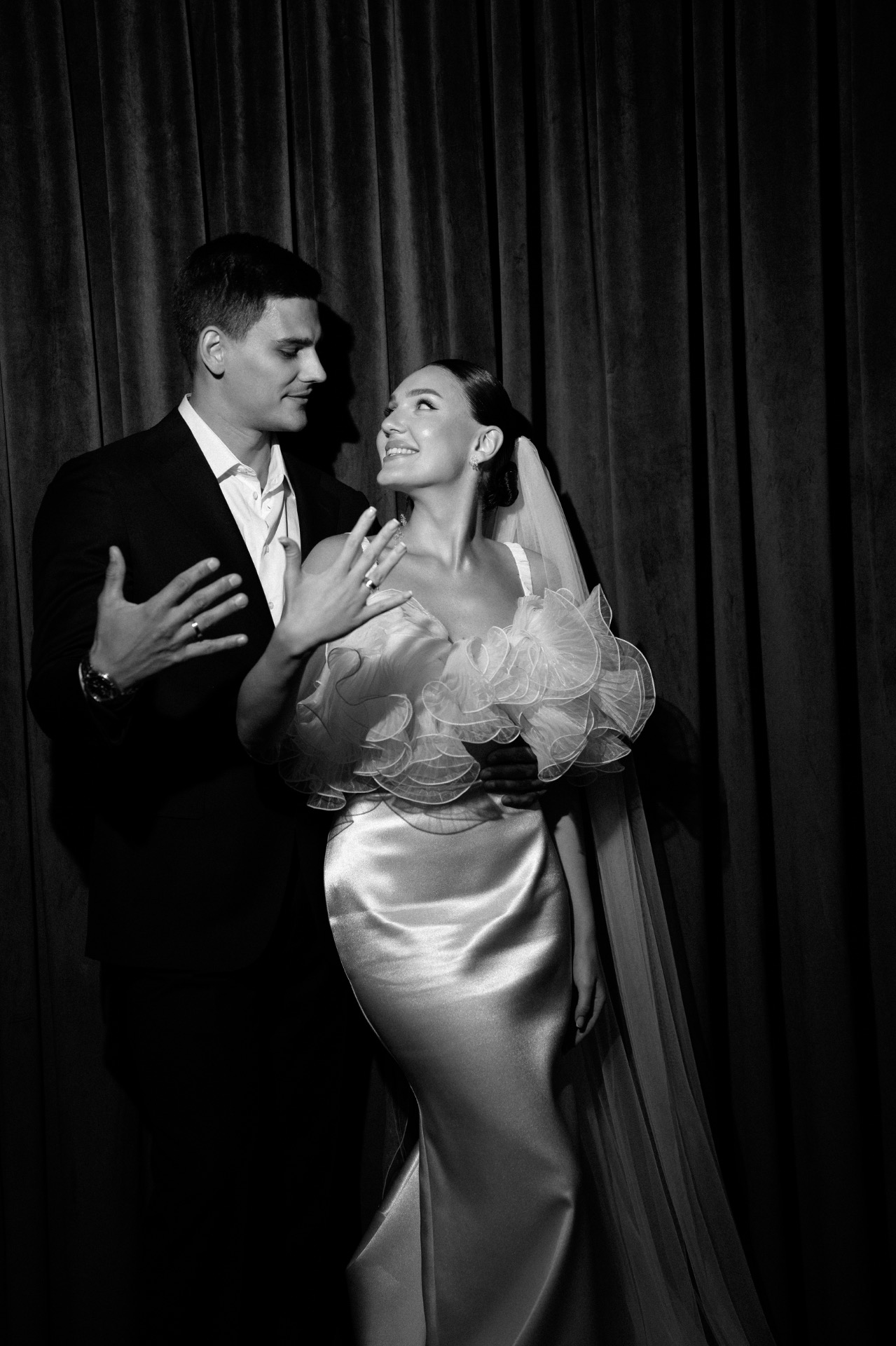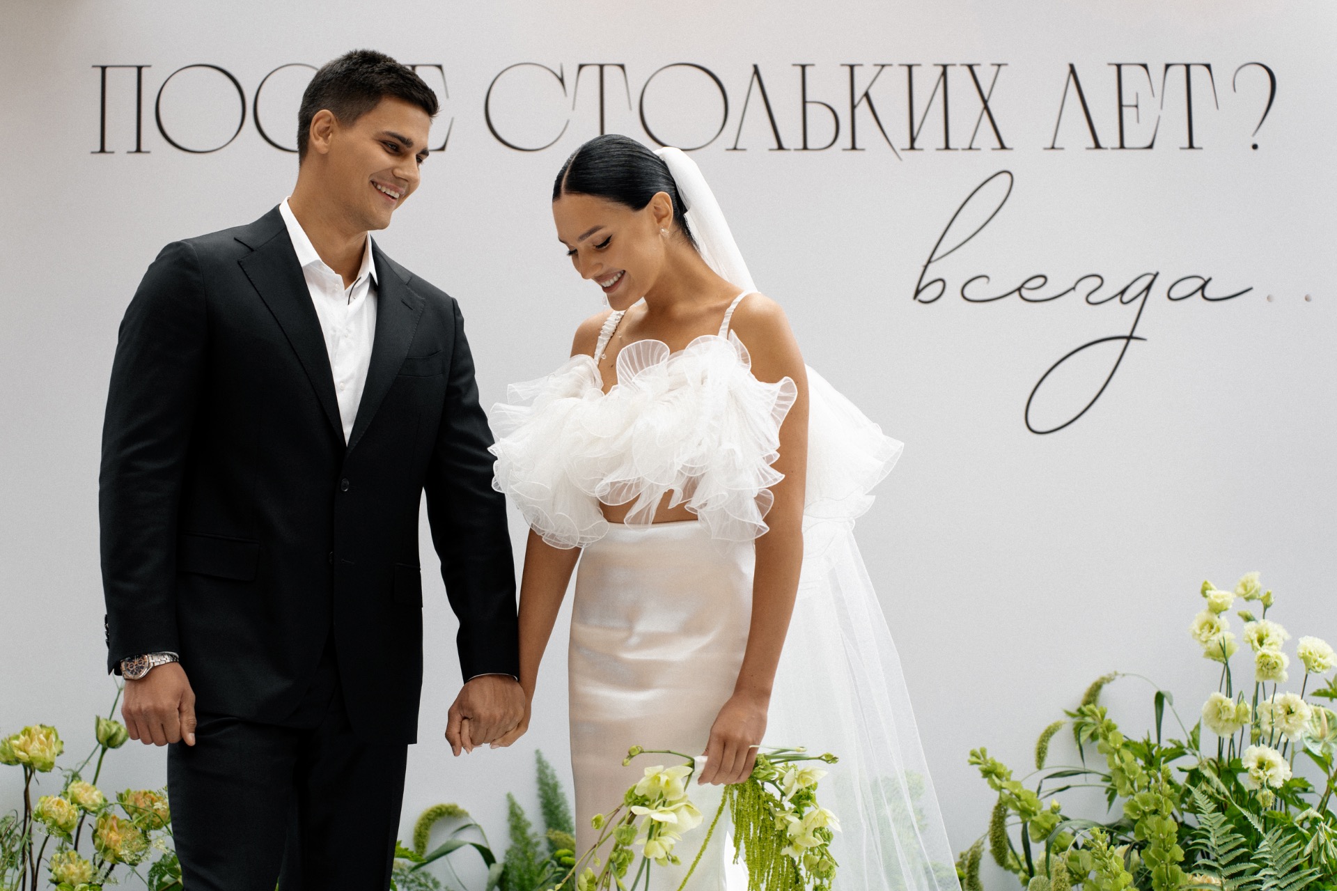 Вся моя жизнь связана с контентом, и я точно знала, что у нас будет очень красиво. Ещё до предложения я представляла, какую свадьбу хочу — сочетание чёрного, белого цветов и живой необычной флористики. Особое внимание мы уделили необычной форме букета — это любовь.