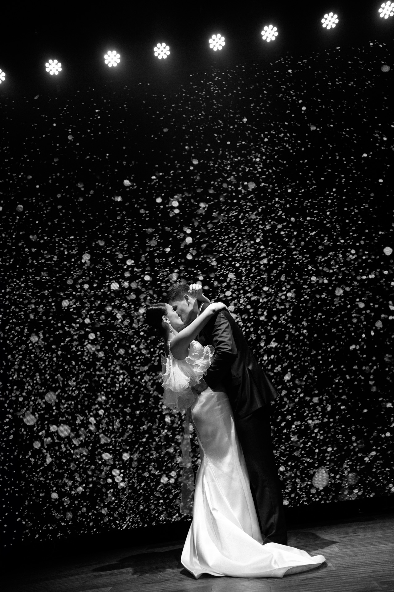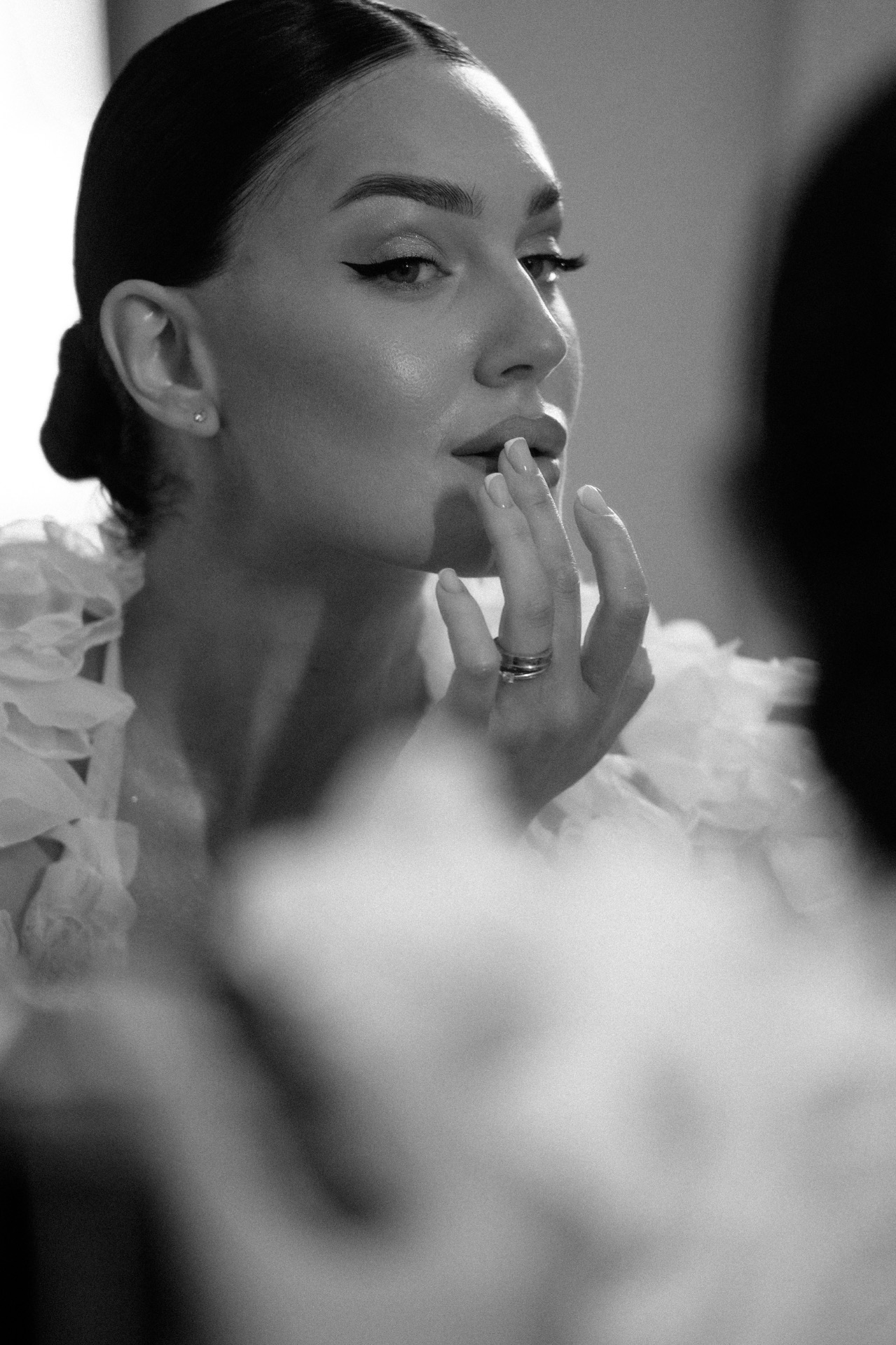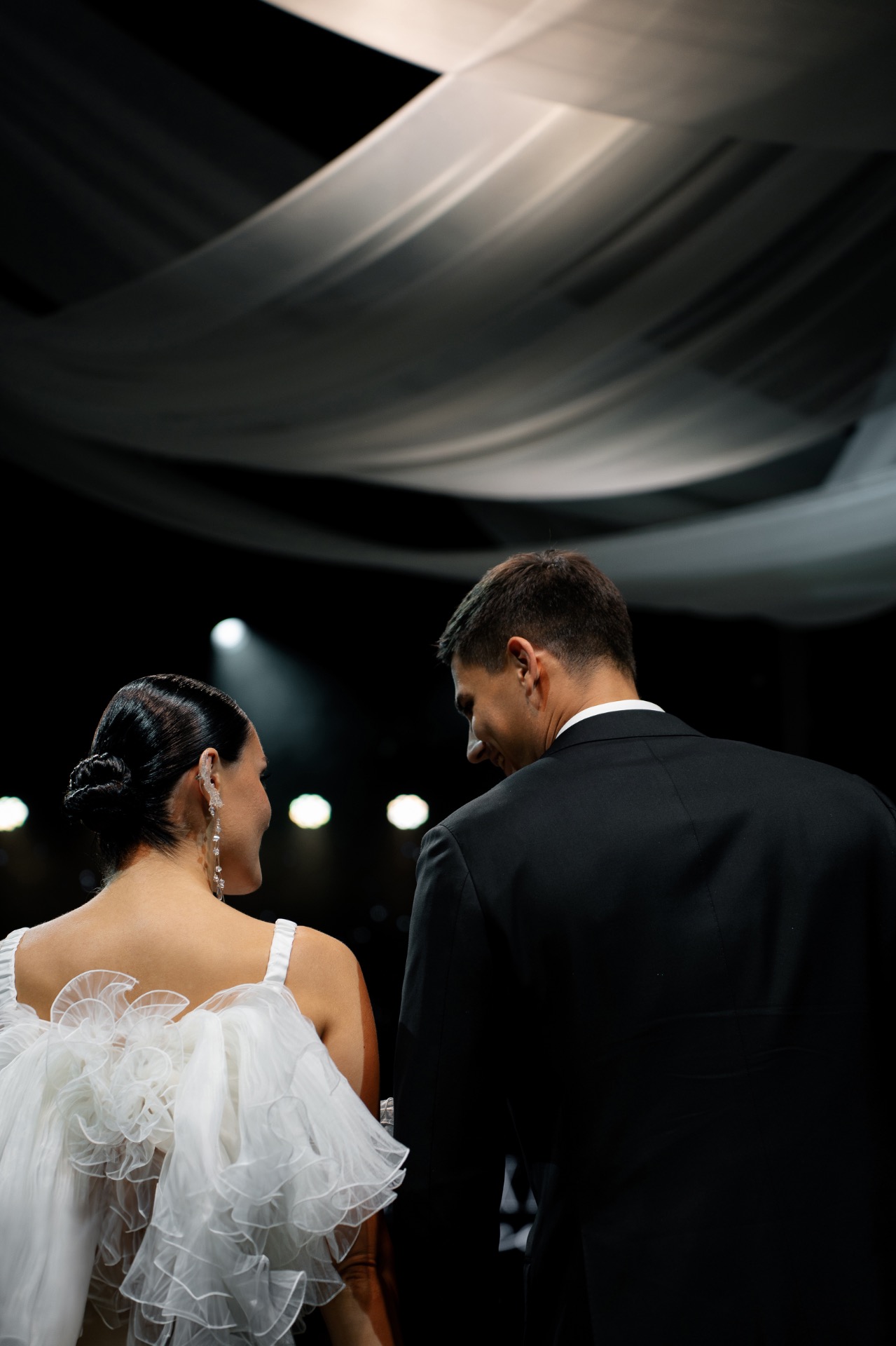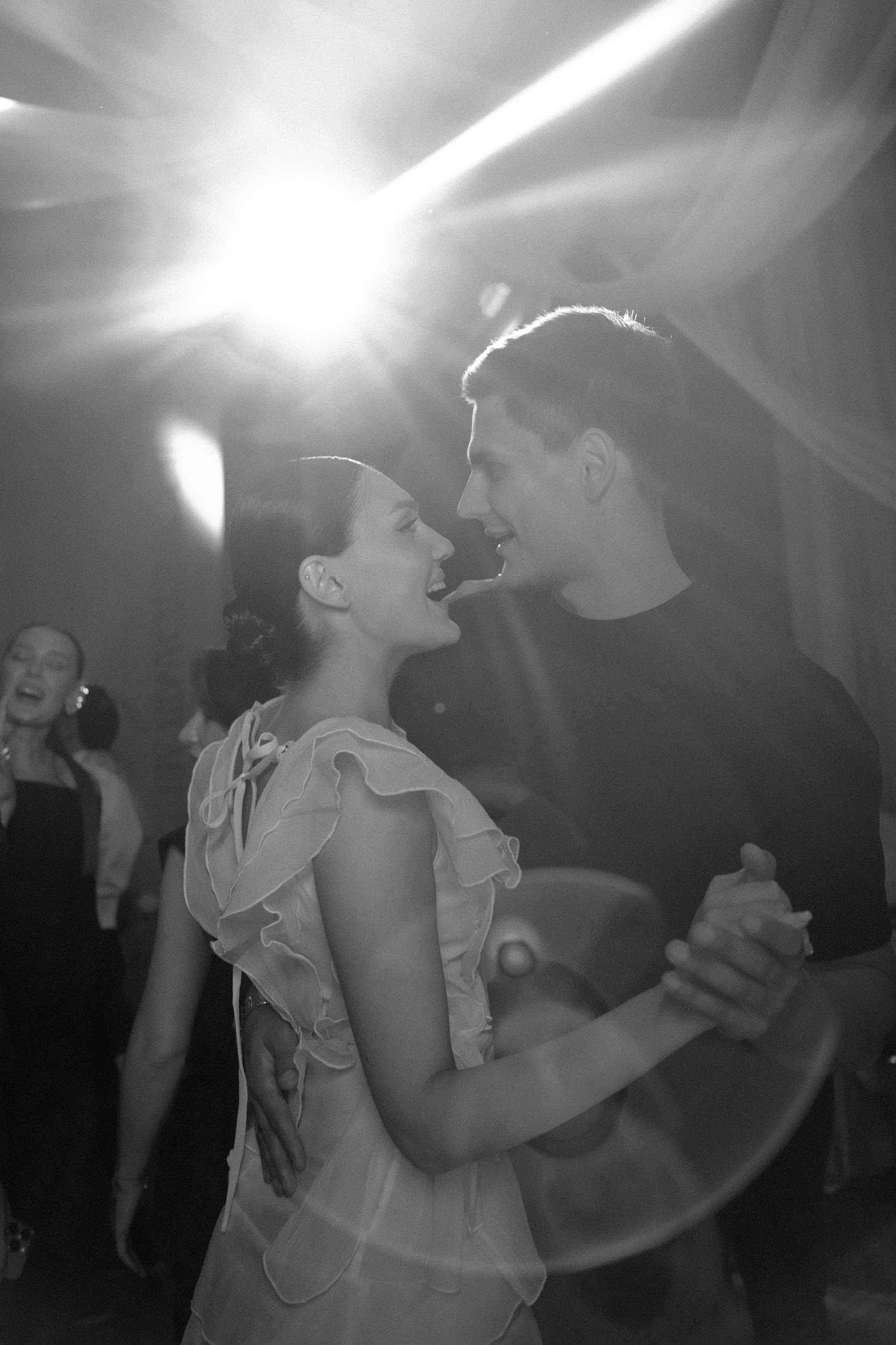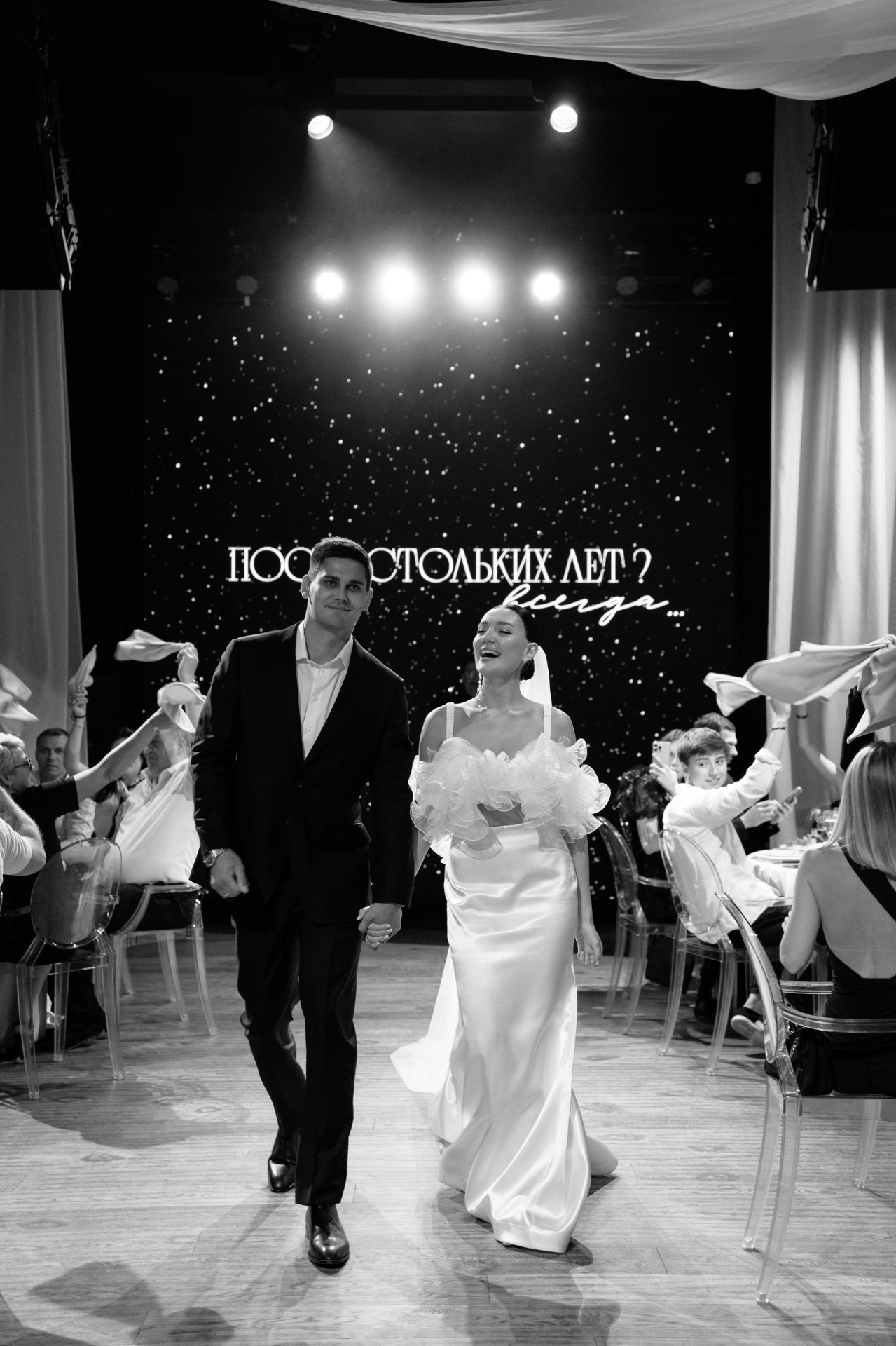На подготовку у нас ушло около девяти месяцев. Считаю, что это оптимальное количество времени, чтобы сделать всё красиво и качественно. Площадку мы выбрали ещё в сентябре и сразу забронировали. Свадьба состоялась 26.06.2025 в Mj Hall. Мы всегда ходим в чёрном, поэтому с дресс-кодом определились сразу — black tie.