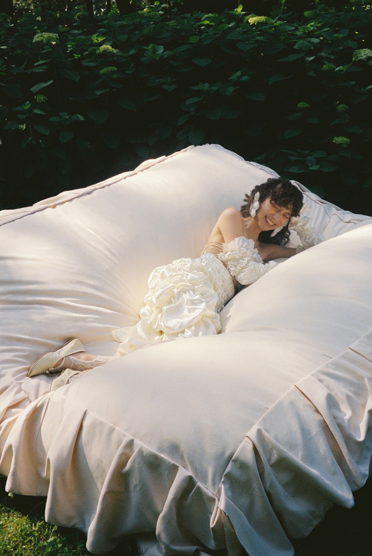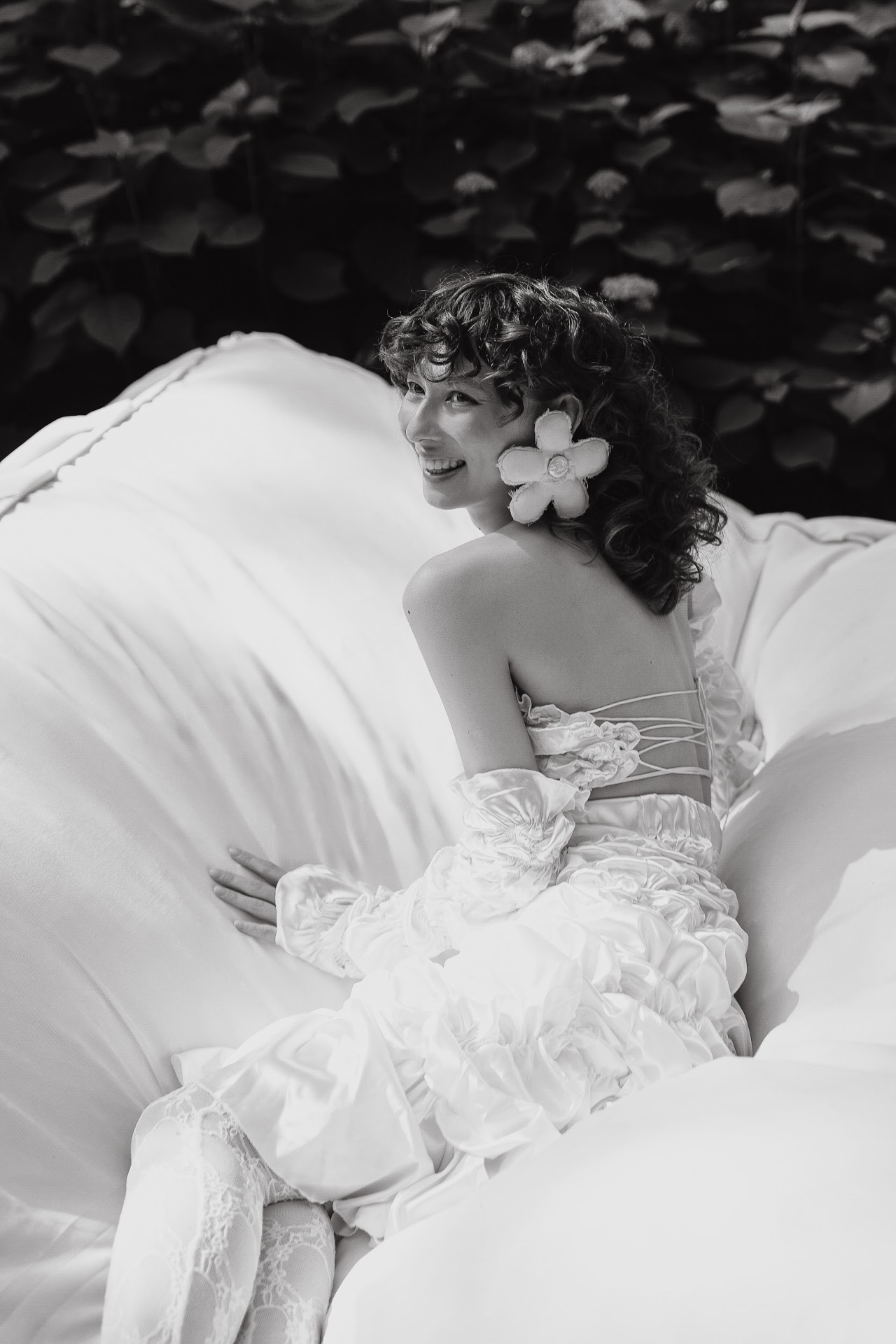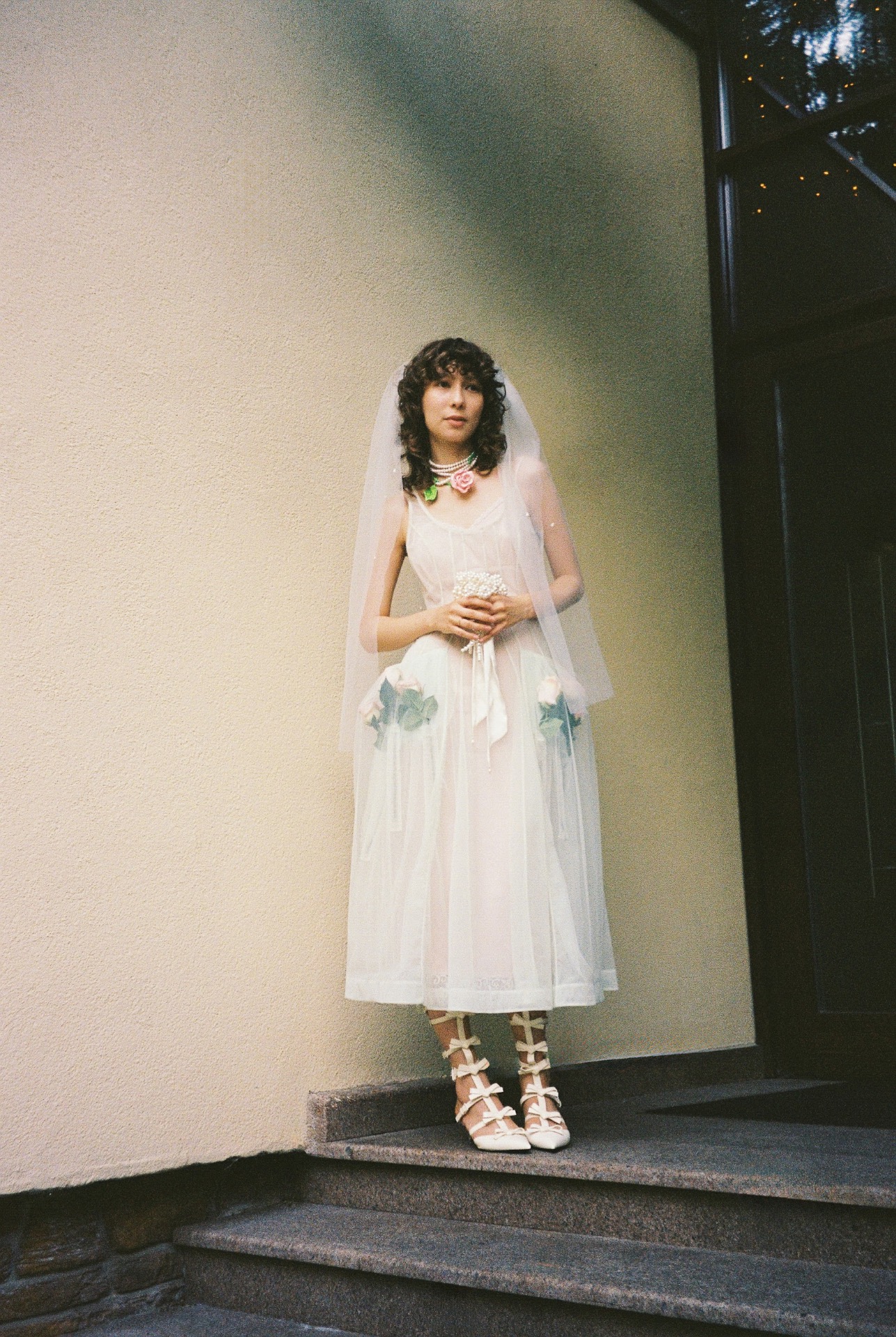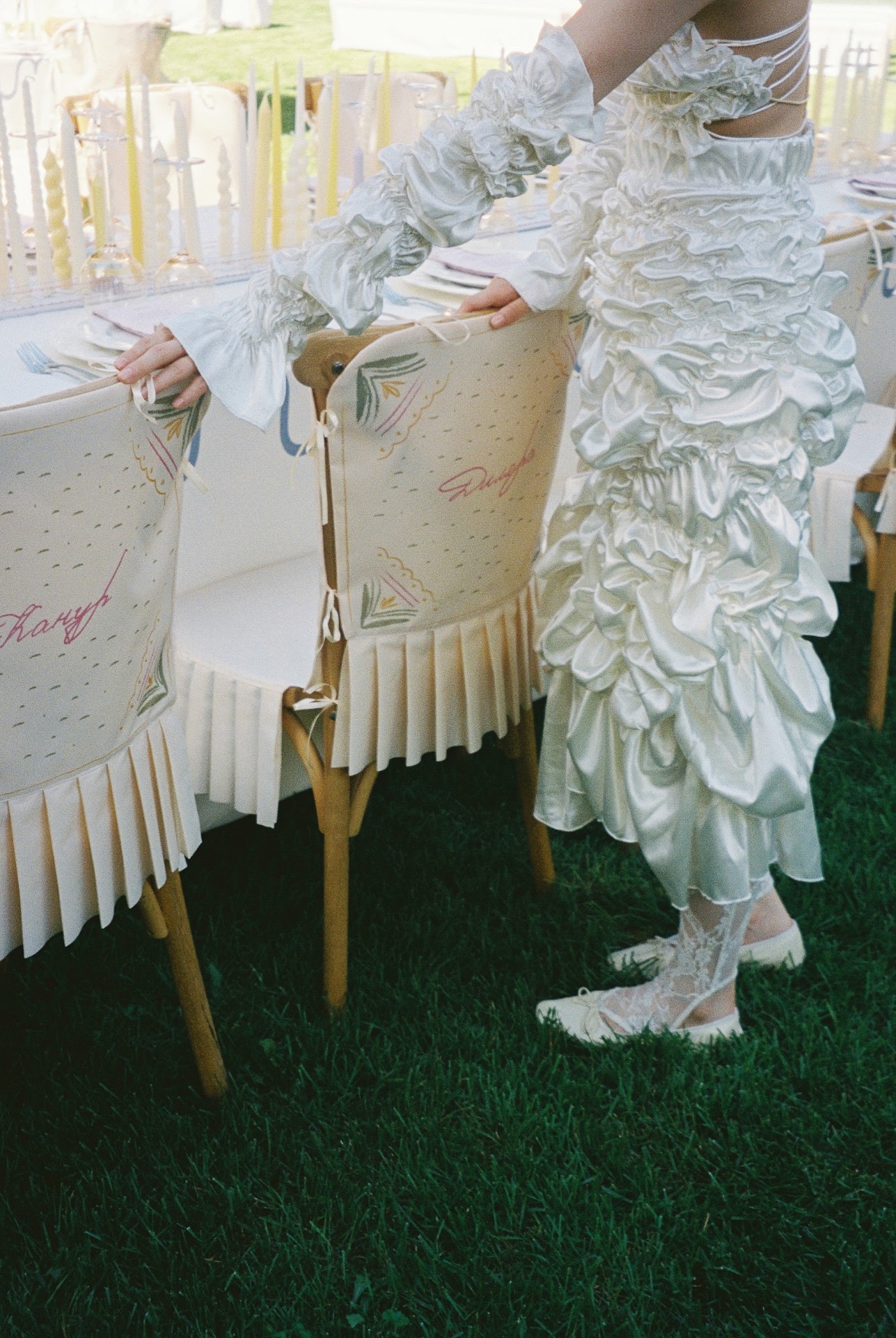 Главное платье для церемонии я нашла больше года назад совершенно случайно. Увидела фото показа Simone Rocha и сразу влюбилась: цветочные мотивы, необычные детали — всё, что так близко моему стилю. Коллекция была распродана, но я случайно наткнулась на это платье в отметках бренда у небольшого магазина в Ирландии и с помощью байера всё-таки достала его. Оно оказалось не белым, а пастельно-зелёным, и именно этот оттенок стал изюминкой, дополнив задуманный образ «цветка» этого дня.