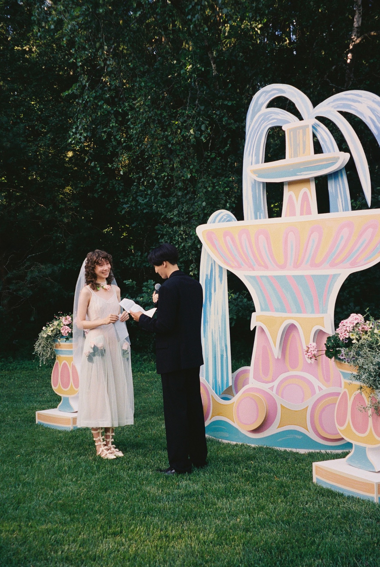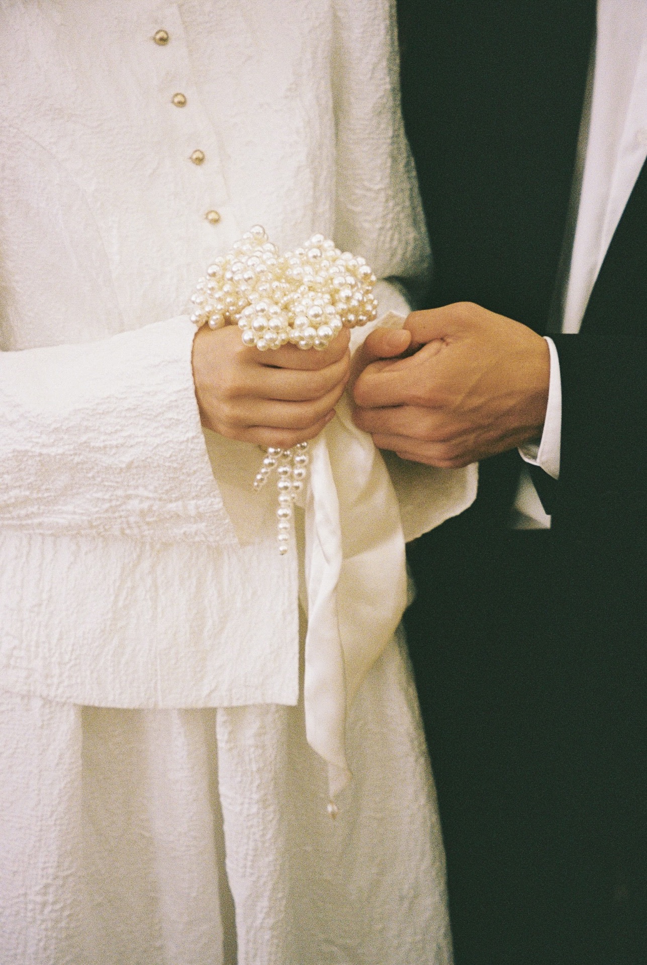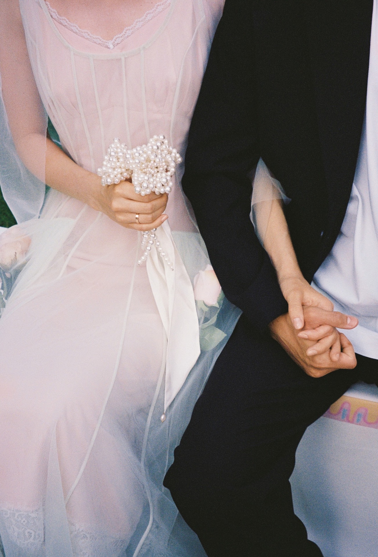 Главное платье для церемонии я нашла больше года назад совершенно случайно. Увидела фото показа Simone Rocha и сразу влюбилась: цветочные мотивы, необычные детали — всё, что так близко моему стилю. Коллекция была распродана, но я случайно наткнулась на это платье в отметках бренда у небольшого магазина в Ирландии и с помощью байера всё-таки достала его. Оно оказалось не белым, а пастельно-зелёным, и именно этот оттенок стал изюминкой, дополнив задуманный образ «цветка» этого дня.