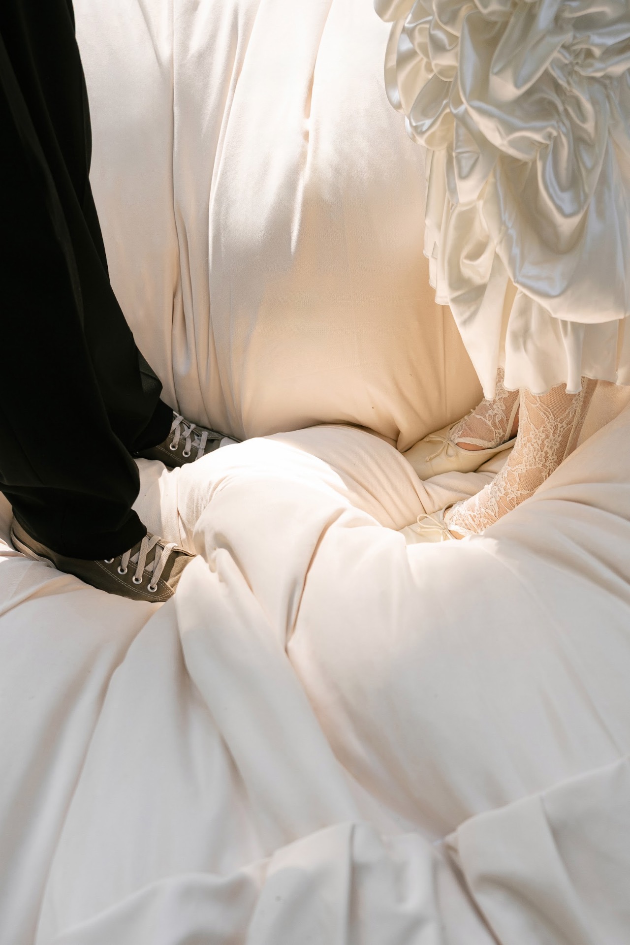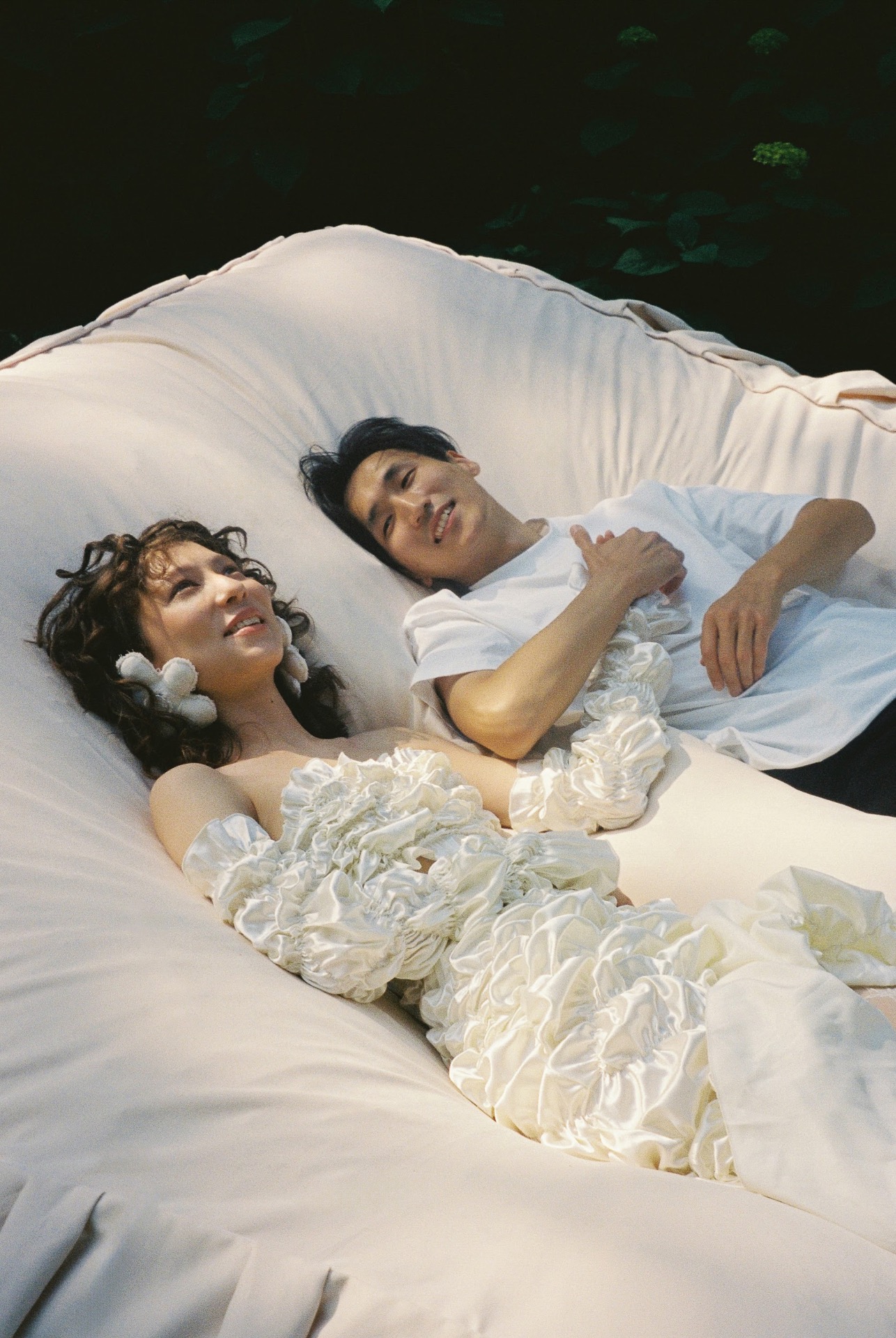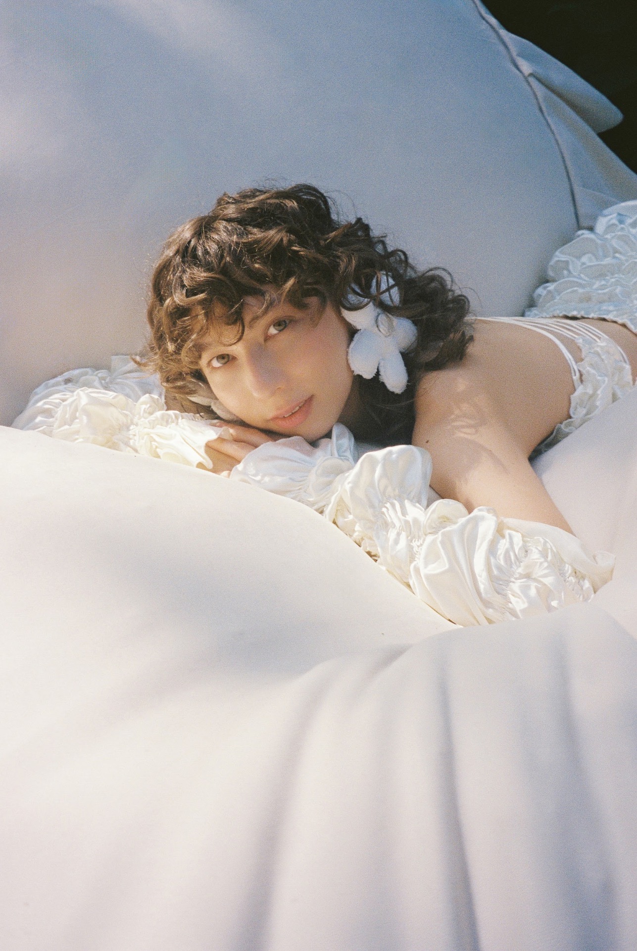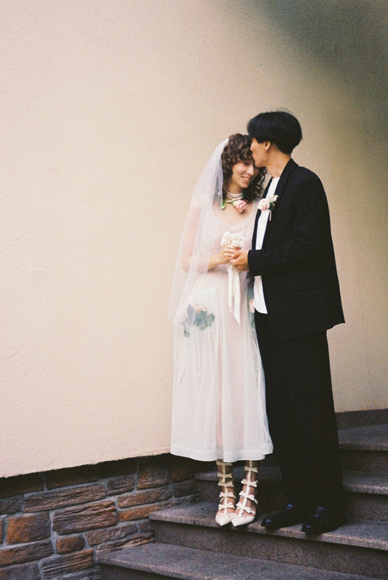 Главное платье для церемонии я нашла больше года назад совершенно случайно. Увидела фото показа Simone Rocha и сразу влюбилась: цветочные мотивы, необычные детали — всё, что так близко моему стилю. Коллекция была распродана, но я случайно наткнулась на это платье в отметках бренда у небольшого магазина в Ирландии и с помощью байера всё-таки достала его. Оно оказалось не белым, а пастельно-зелёным, и именно этот оттенок стал изюминкой, дополнив задуманный образ «цветка» этого дня.
