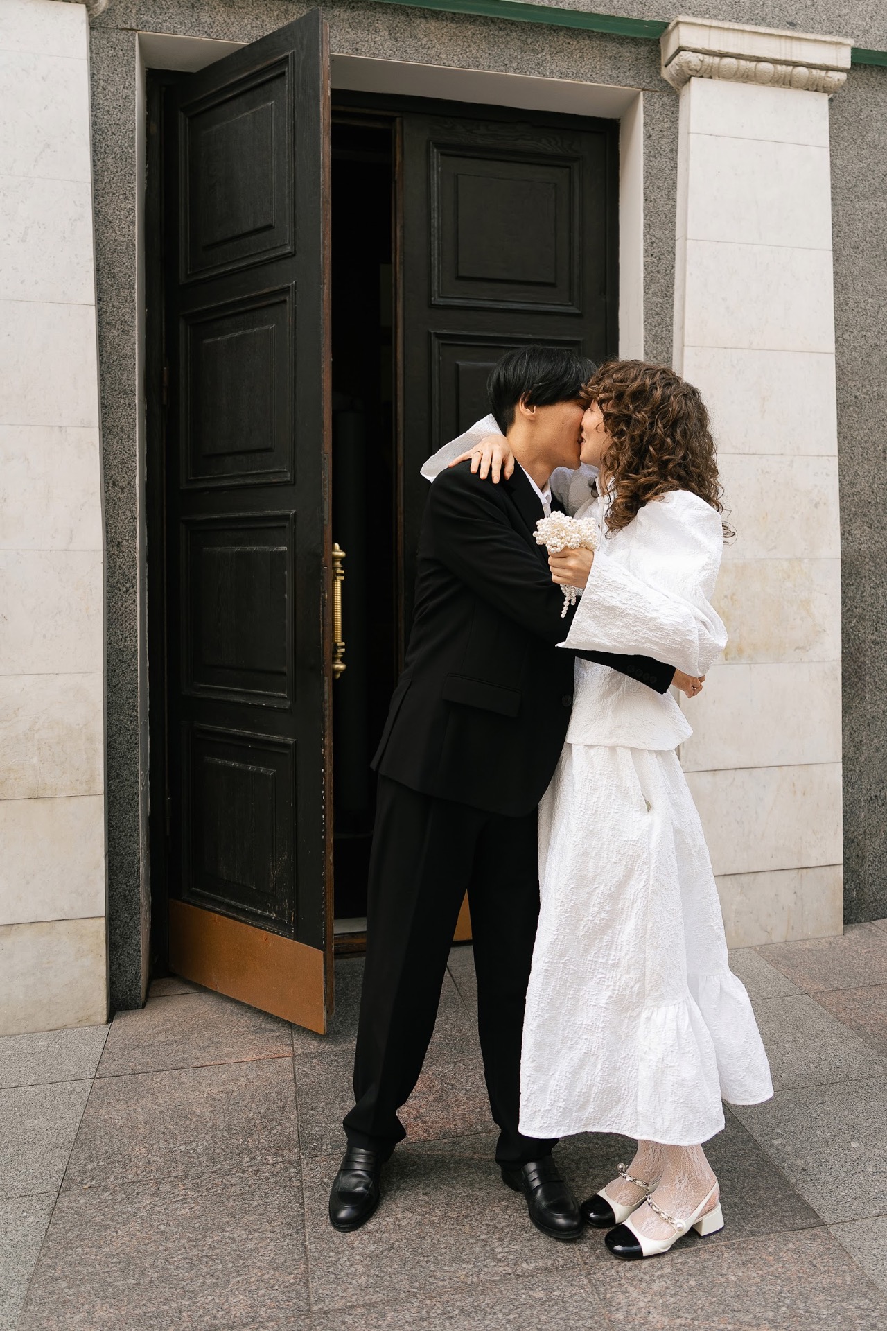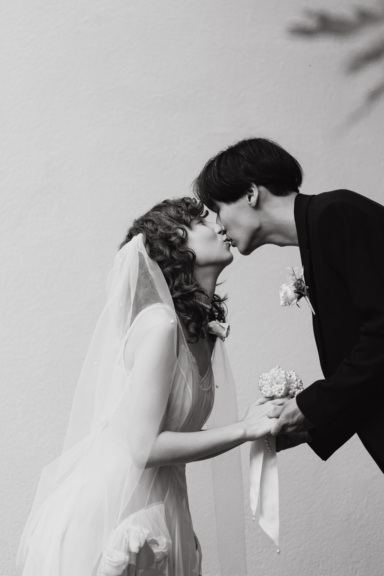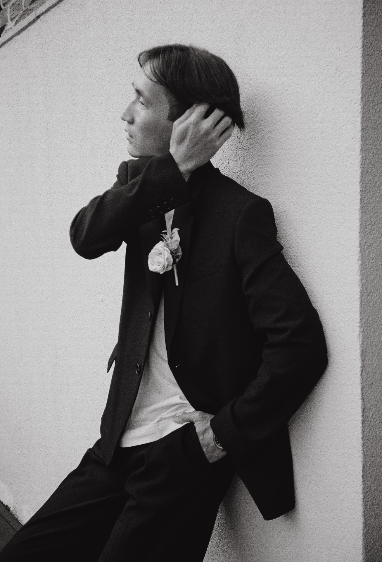 С образом жениха всё было проще. Канур выбрал классический чёрный костюм с прямыми брюками и белой рубашкой — лаконично, стильно, без излишней вычурности. Чтобы образы перекликались, в его кармане была бутоньерка-роза, отсылающая к розам в моём платье.
