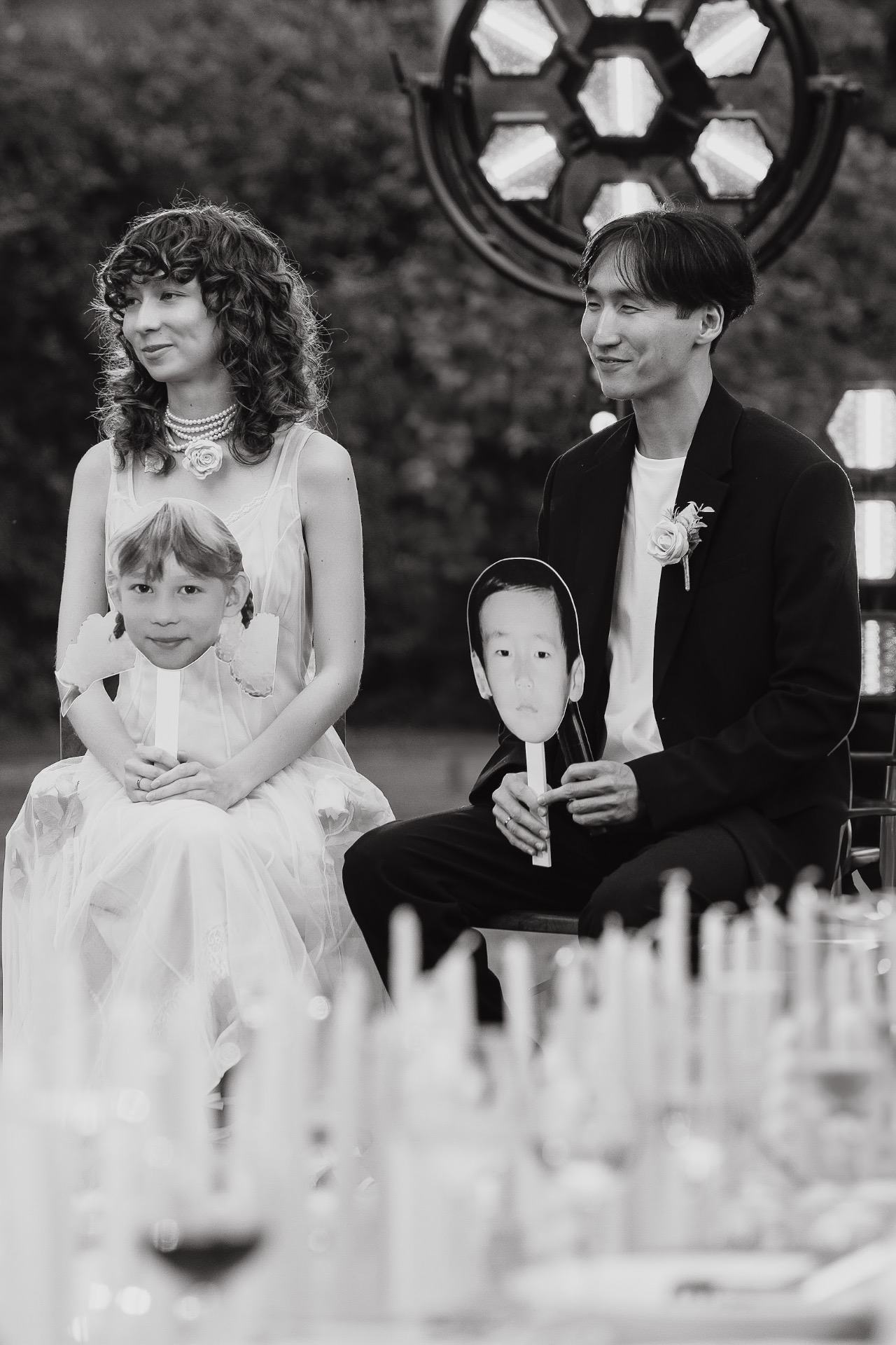 В велком-зоне гостей встречала мини-книга с нашей историей и иллюстрациями в стиле аниме — отсылка к нашей общей любви к этому жанру. В конце вечера каждый мог добавить туда своё фото, став частью нашей истории. Ещё одной деталью стали чехлы на стулья с именами гостей, их можно было забрать на память.