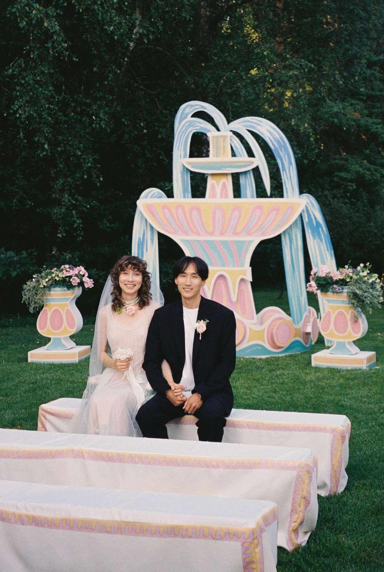 Местом торжества стали «Родники» — идеальная локация по эстетике, комфорту и уединённости. Концепцию и декор мы доверили декораторам и они невероятно точно почувствовали нашу пару — романтичную, мечтательную, с любовью к деталям и цветам. Декор получился как из снов: пастельные оттенки, нежные формы, лёгкая наивность и центральный символ праздника — фонтан в зоне церемонии. Он стал сердцем свадьбы и отражением всей её гармонии и воздушности.