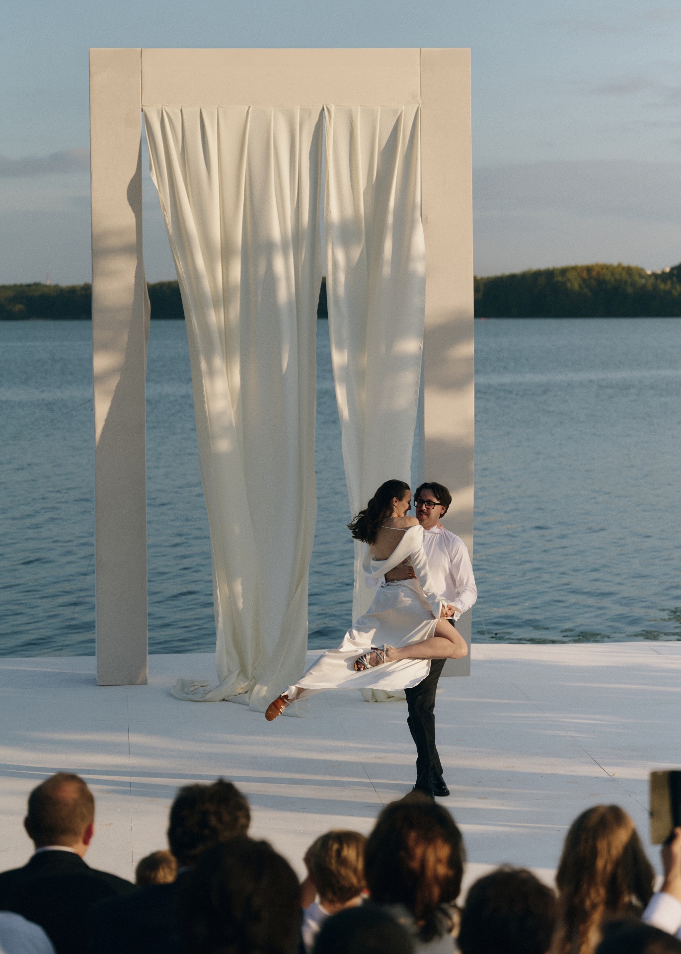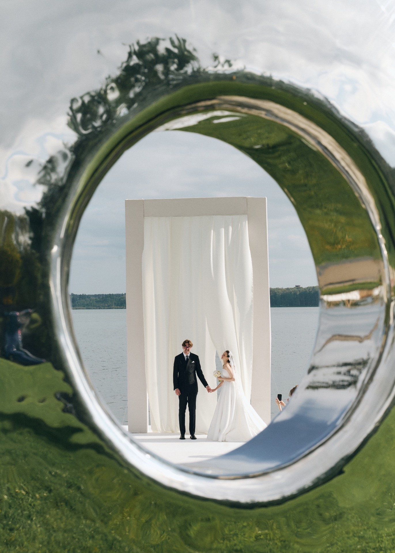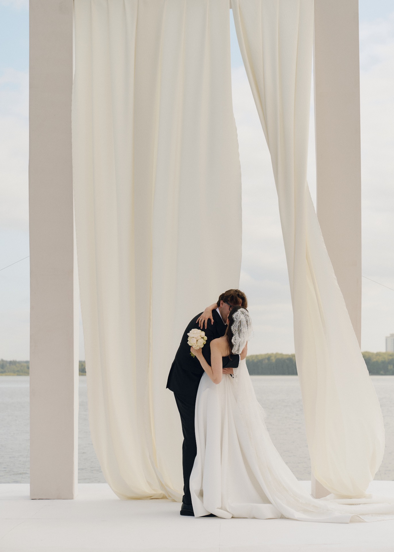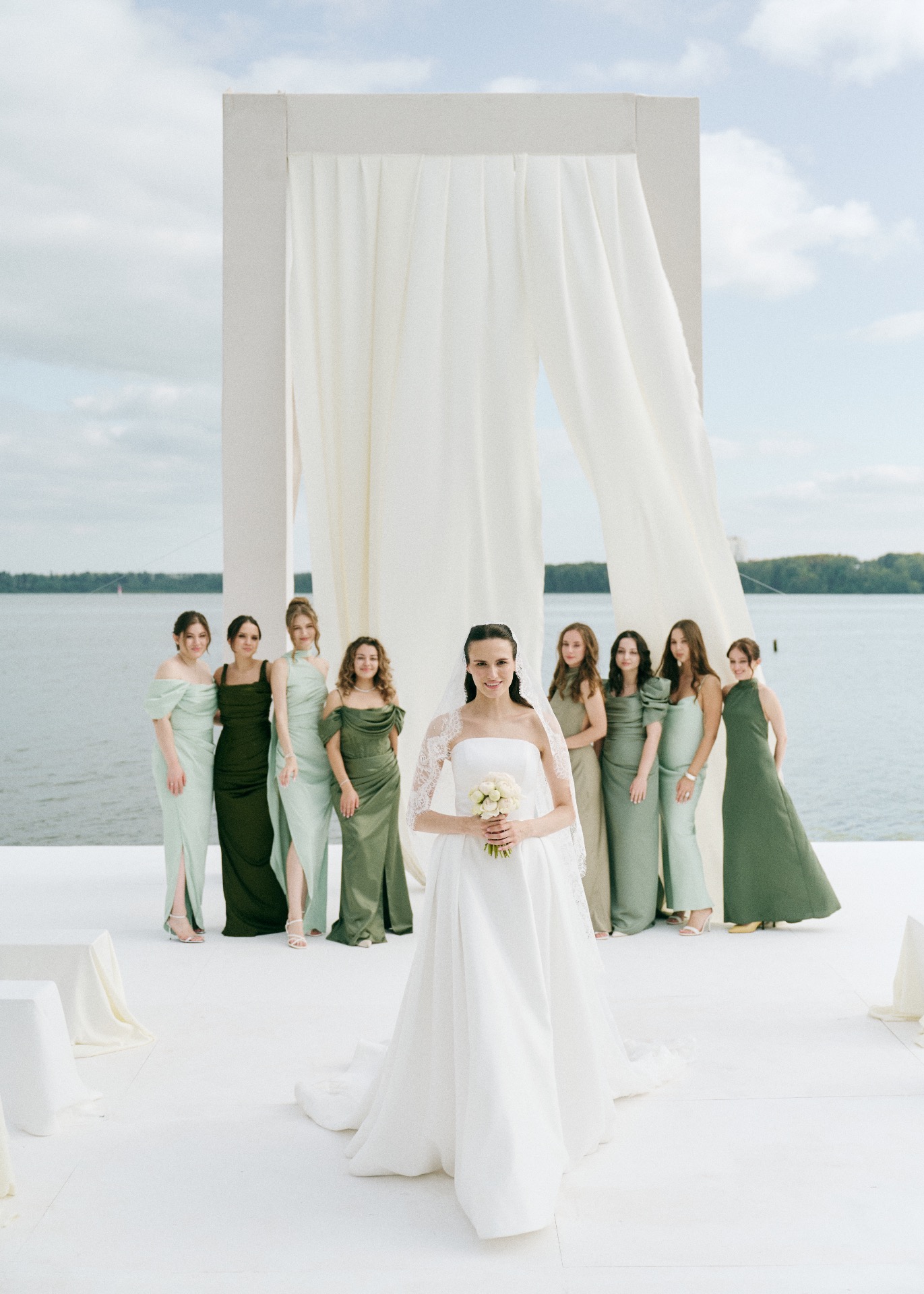 Гиперболизированная арка высотой 5 метров, выверенные линии и белоснежный фон стали формулой «ВАУ» церемонии на нашей свадьбе. Локация церемонии была построена на балансе геометрии и масштаба, в эстетике американского кино.