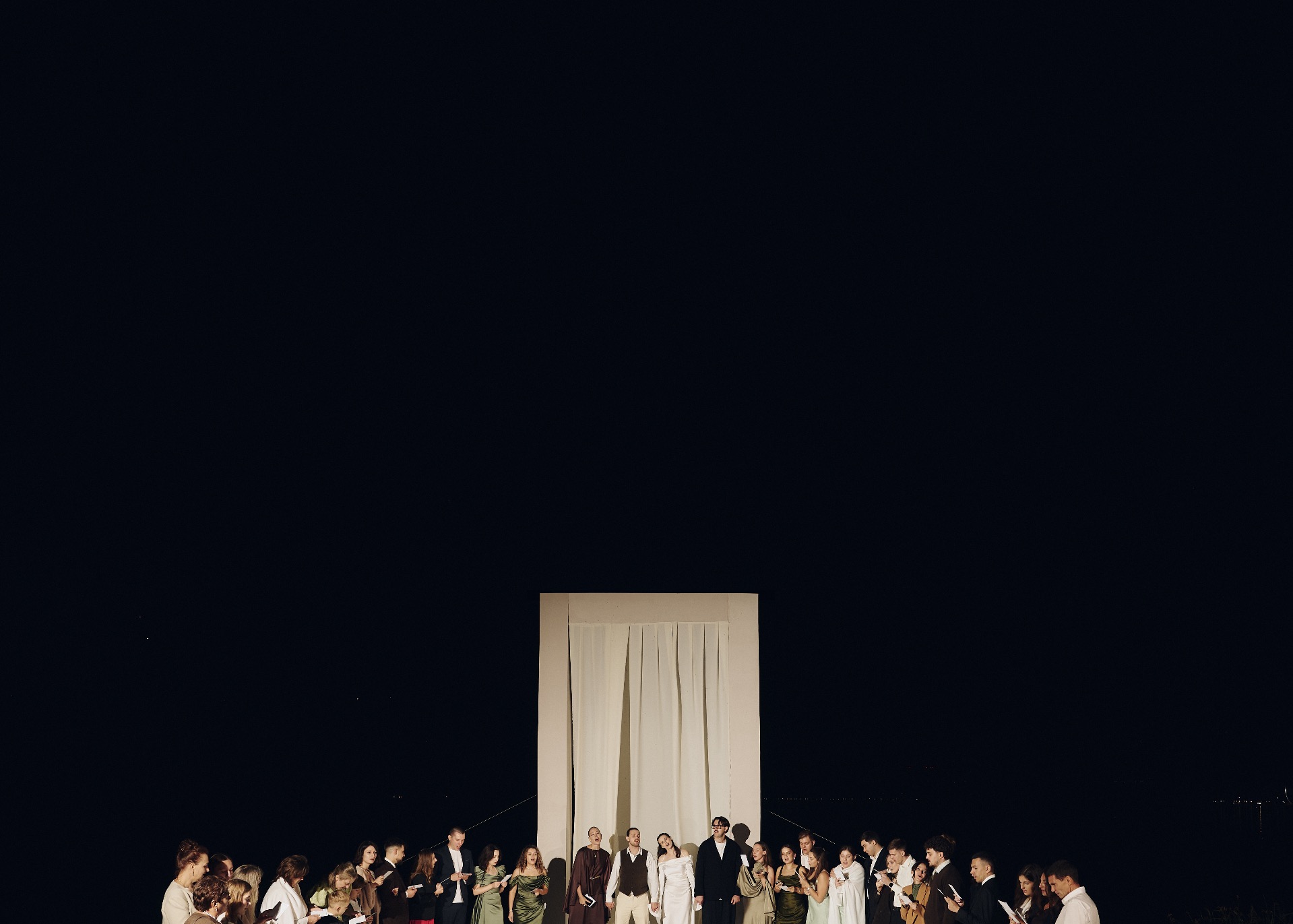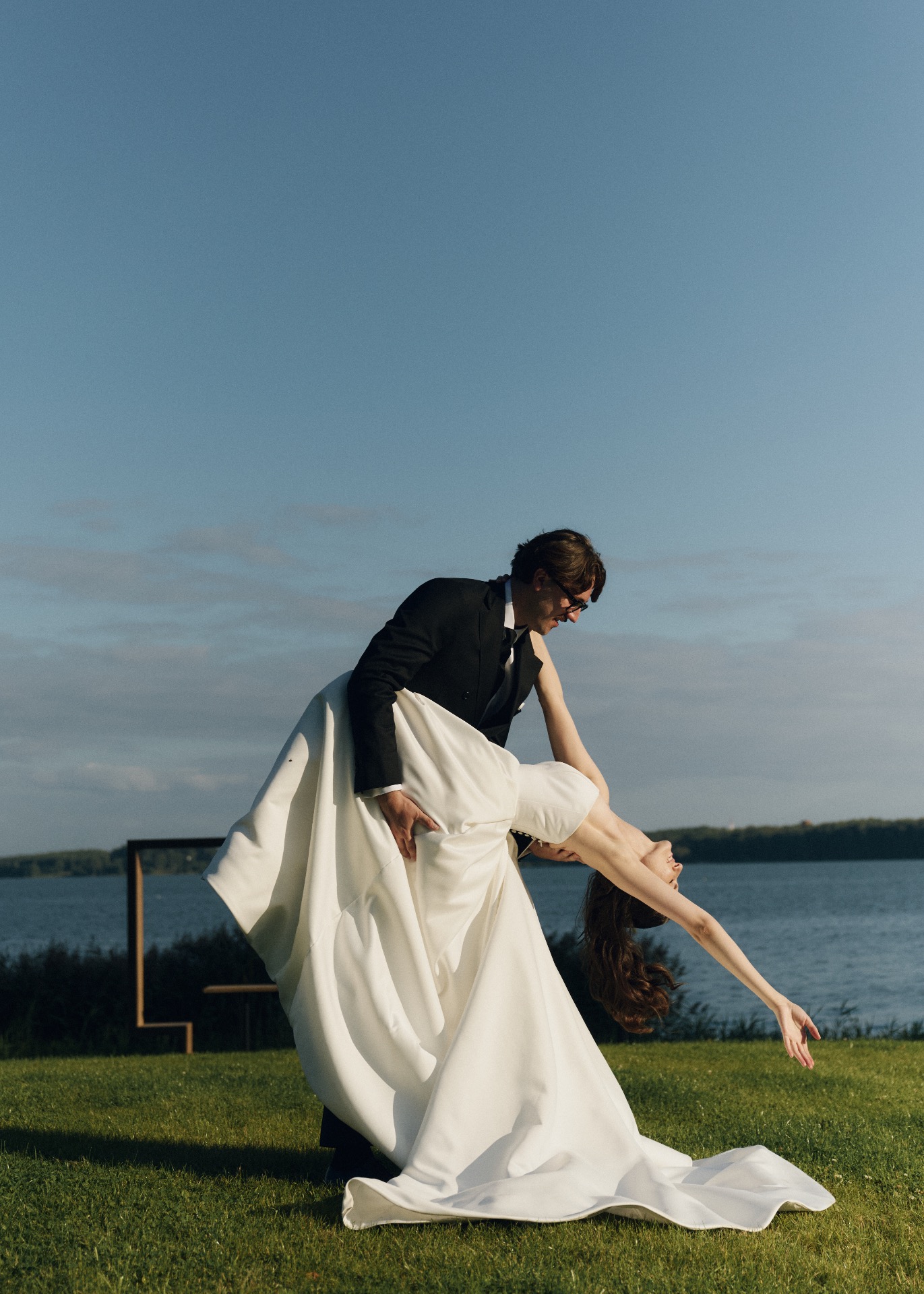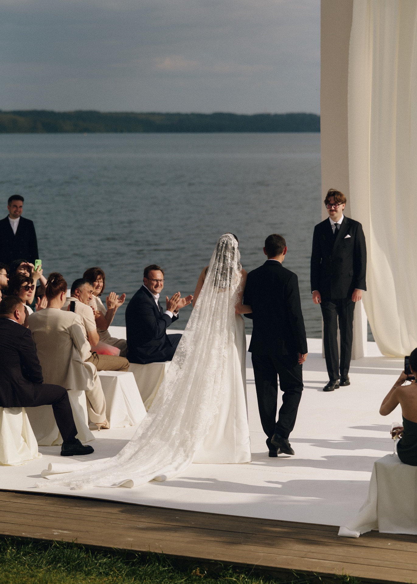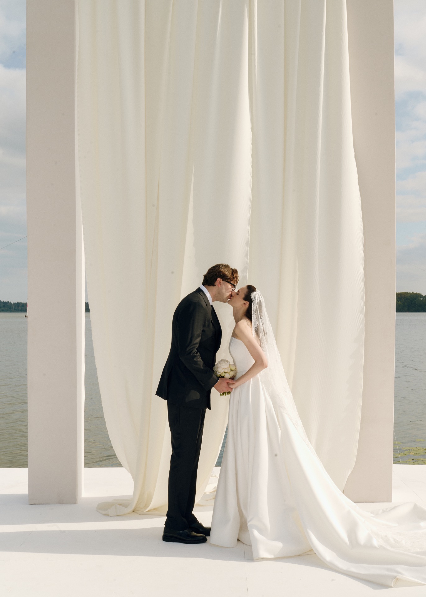 Гиперболизированная арка высотой 5 метров, выверенные линии и белоснежный фон стали формулой «ВАУ» церемонии на нашей свадьбе. Локация церемонии была построена на балансе геометрии и масштаба, в эстетике американского кино.
