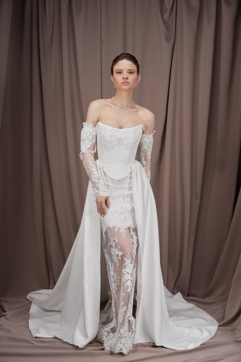 Классический вариант — короткое платье, дополненное съёмной длинной юбкой. Такой образ легко адаптируется под формат: для церемонии — изящный, сдержанный силуэт, для вечерней части — лёгкое и игривое мини, в котором удобно танцевать и быть в движении.