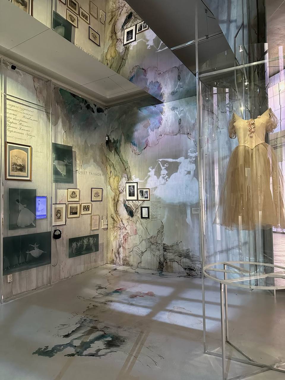 Экспозиция включает гравюры, литографии, фотографии, афиши, документы и мемориальные предметы из коллекции Лакотта и фондов Эрмитажа, Большого театра и музея театрального искусства. А ещё, здесь можно увидеть реконструкцию ежедневного урока Марии Тальони, благодаря которому она могла «парить» на сцене.