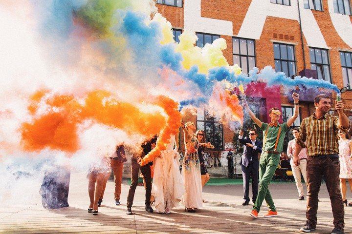Под завершение прогулки на территории дизайн-завода «Флакон» (где и проходило все это действо) устроили треш-фотосессию: раздали гостям лизуны разных цветов, и все одновременно в нас ими бросили. После мы отправились в сторону манежной площади, в ресторан, который находился буквально в двухстах метрах. Это было предусмотрено специально для того, чтобы организовать «свадебное шествие» — в условленном месте нас ждали аниматоры с шариками и специальными вертушками, три ходулиста, танцоры-чирлидерши и музыканты (саксофонистка и гитарист). Все время шествия мы пели песни, а после встречи с аниматорами отправили в небо шарики и провели флешмоб. Танцы и конкурсы продолжились и в ресторане. Венцом веселья стал конец вечера, когда мы измазались свадебным тортом.