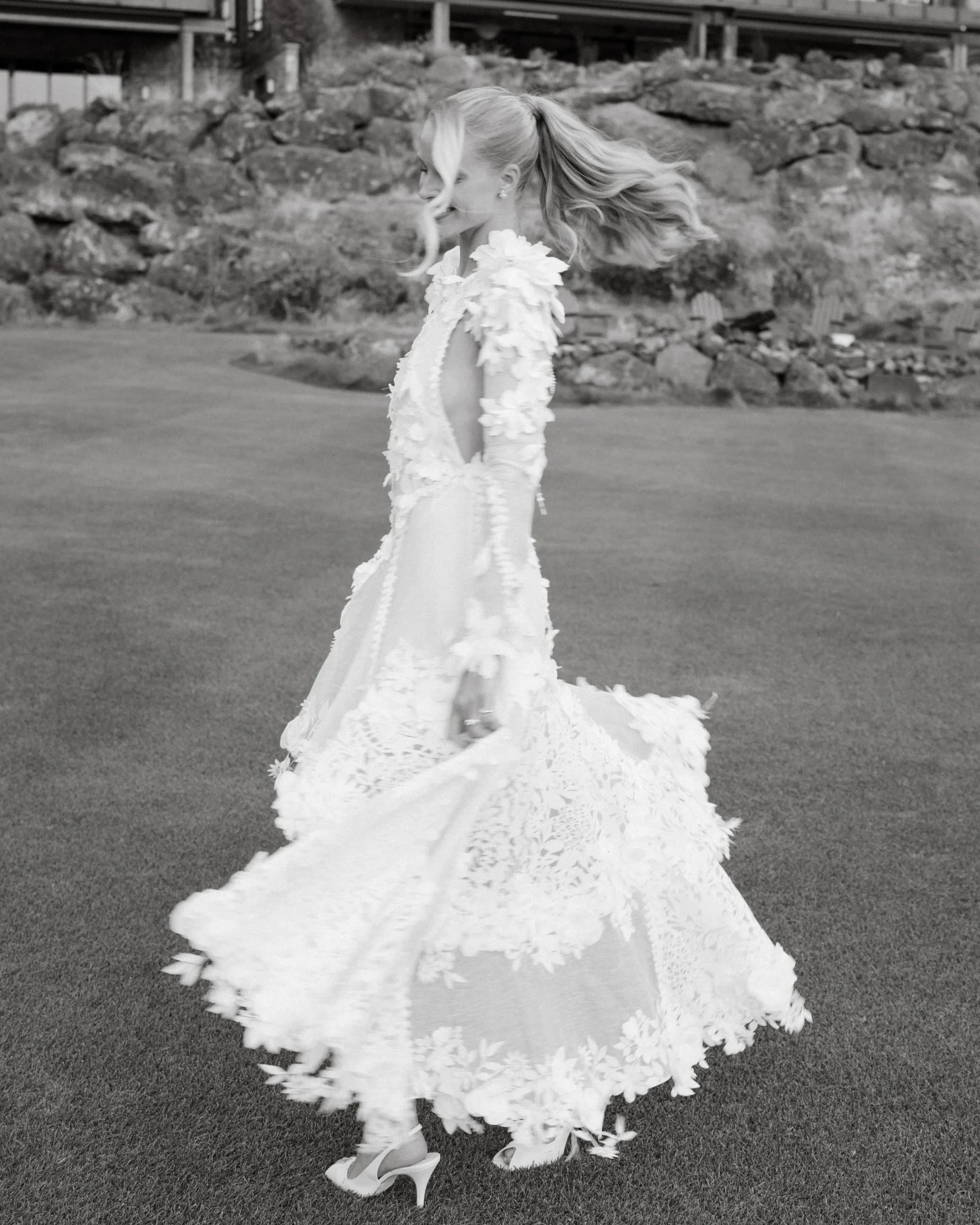 «Для меня платье и дизайнер имели огромное значение. Поскольку мода — часть моей профессии, я знала, что хочу работать с тем человеком, к которому чувствую полное доверие, с кем можно открыто делиться мыслями и ощущениями. С того момента, когда я познакомилась с Даниэллой, я поняла: это она. В качестве аксессуаров мы выбрали серьги пусеты с бриллиантами и жемчужное кольцо от Mackenna Thaler Jewelery», — рассказала невеста.