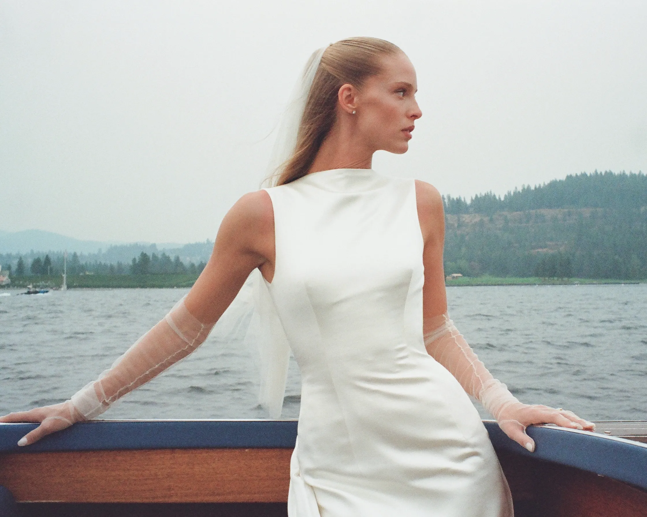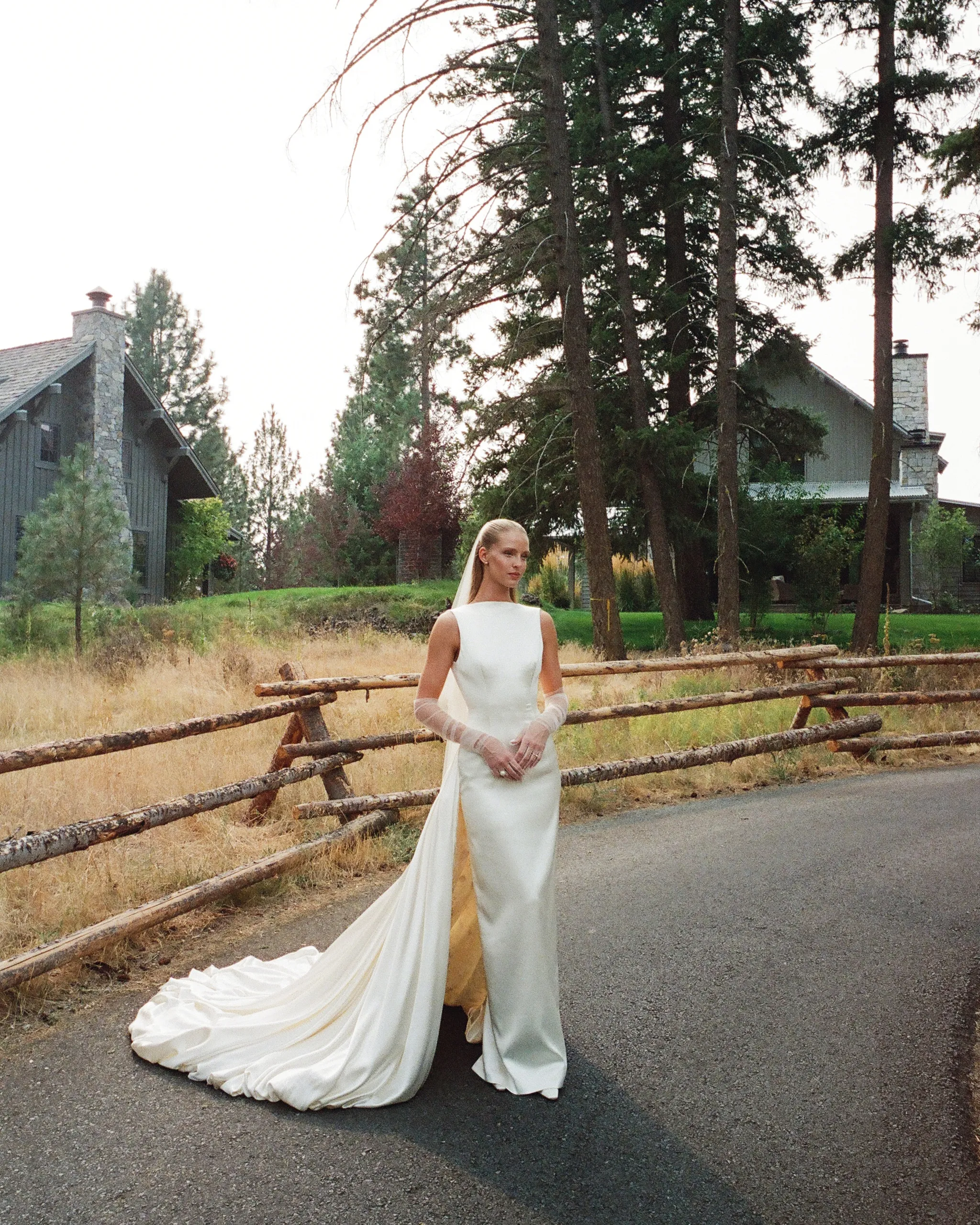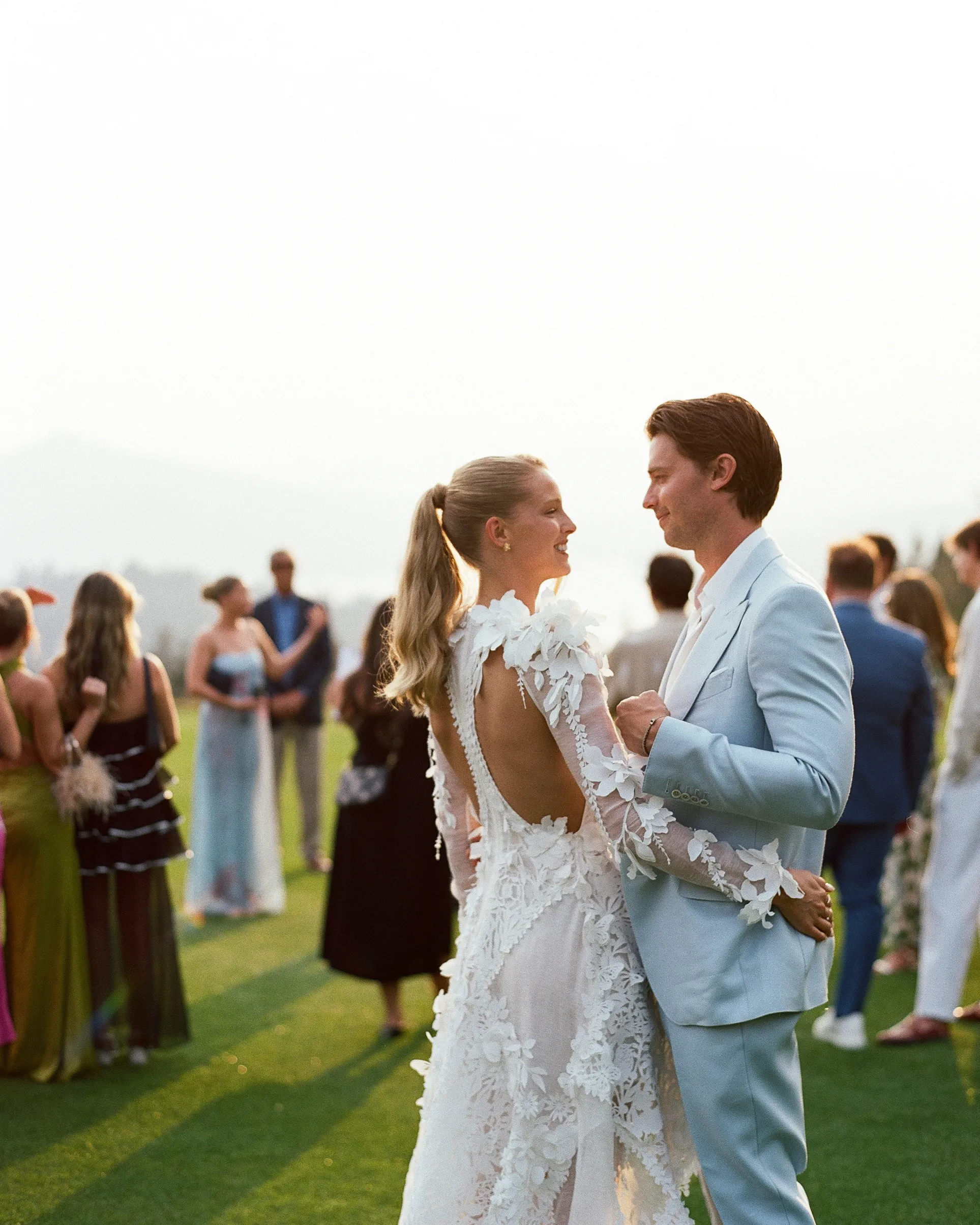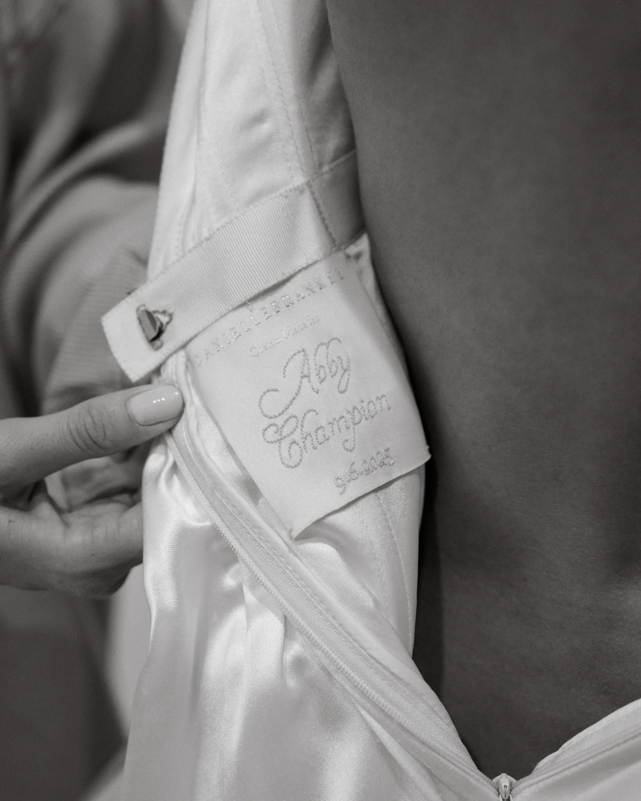 В субботу, 6 сентября, Эбби шла к алтарю в платье из шёлка и шерсти с высоким воротником и глубоким V‑образным вырезом на спине от Danielle Frankel. Вместо обычного шлейфа невеста выбрала шелковую юбку с ручной росписью на подкладке. Образ дополняли мягкие тюлевые перчатки и длинная фата.