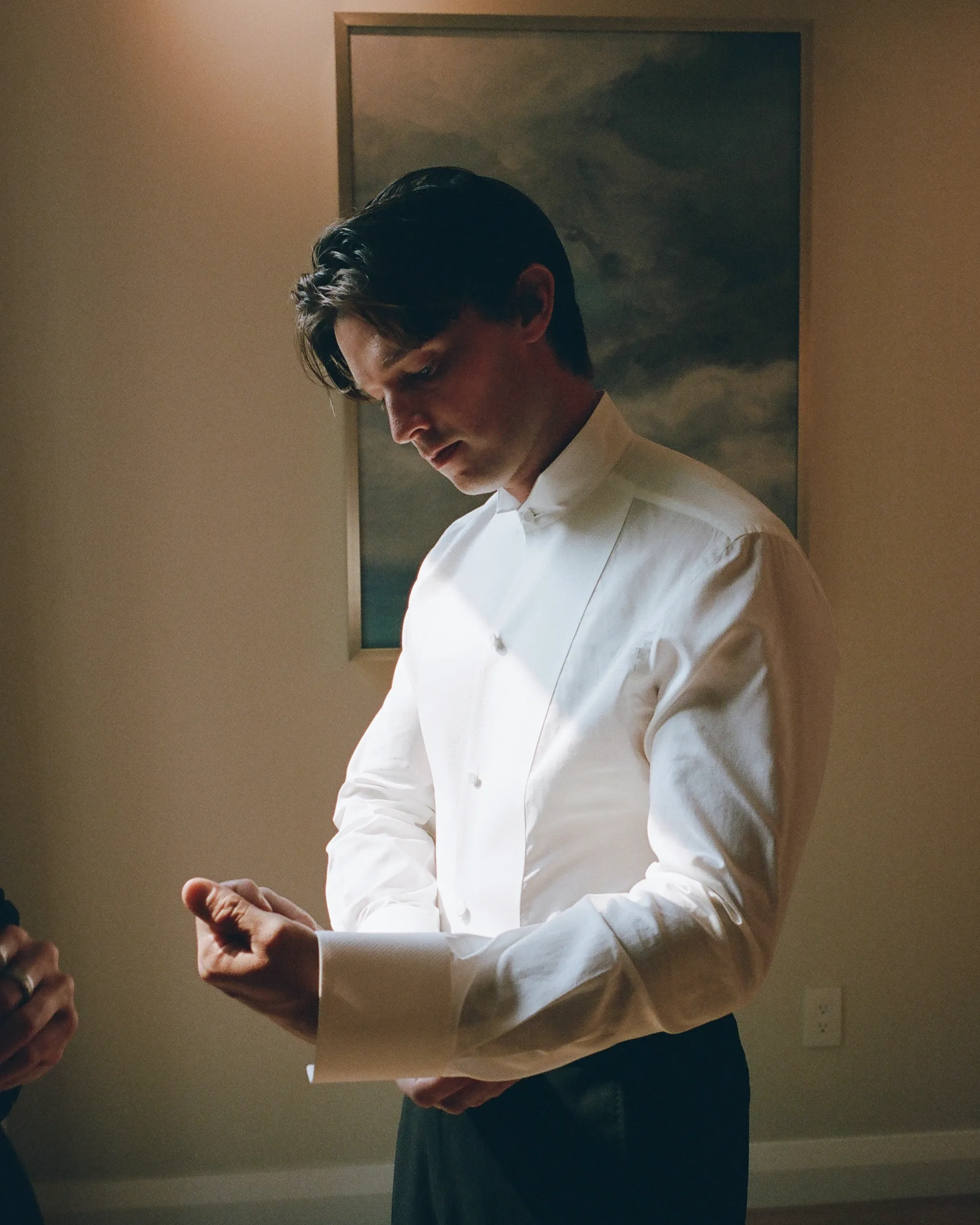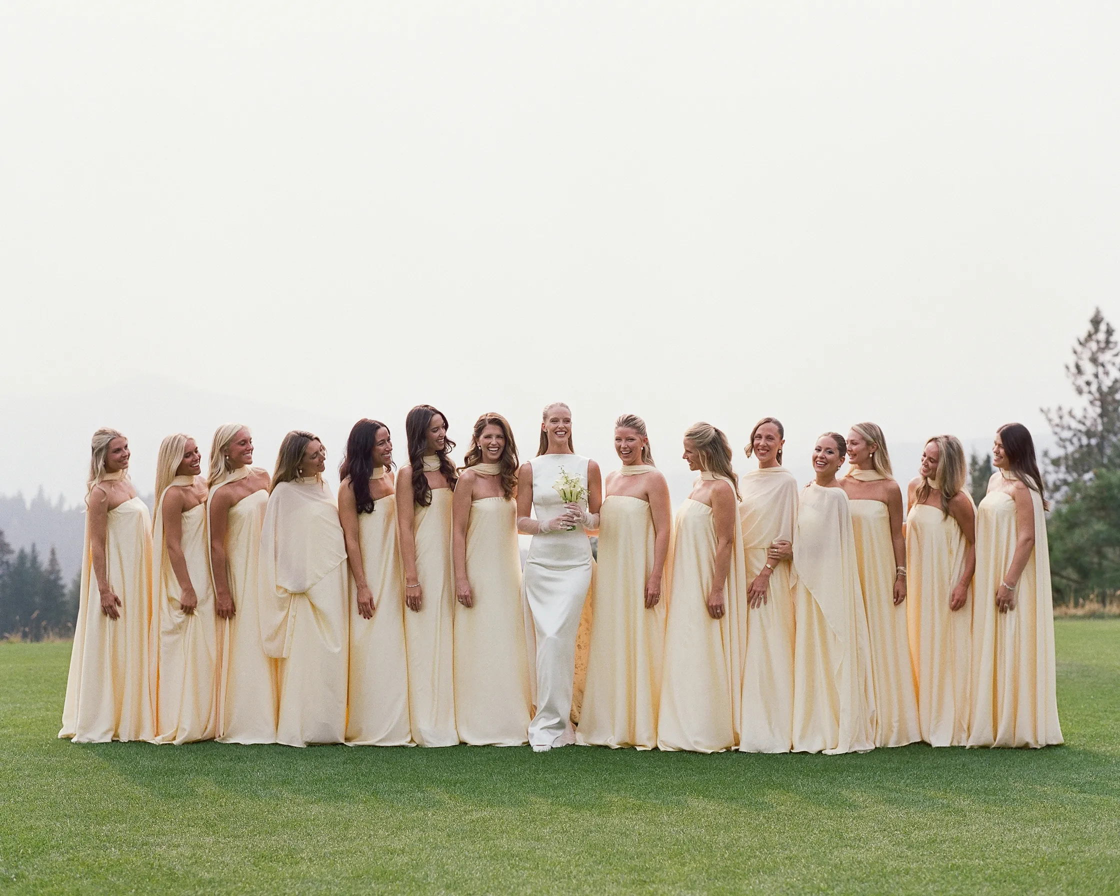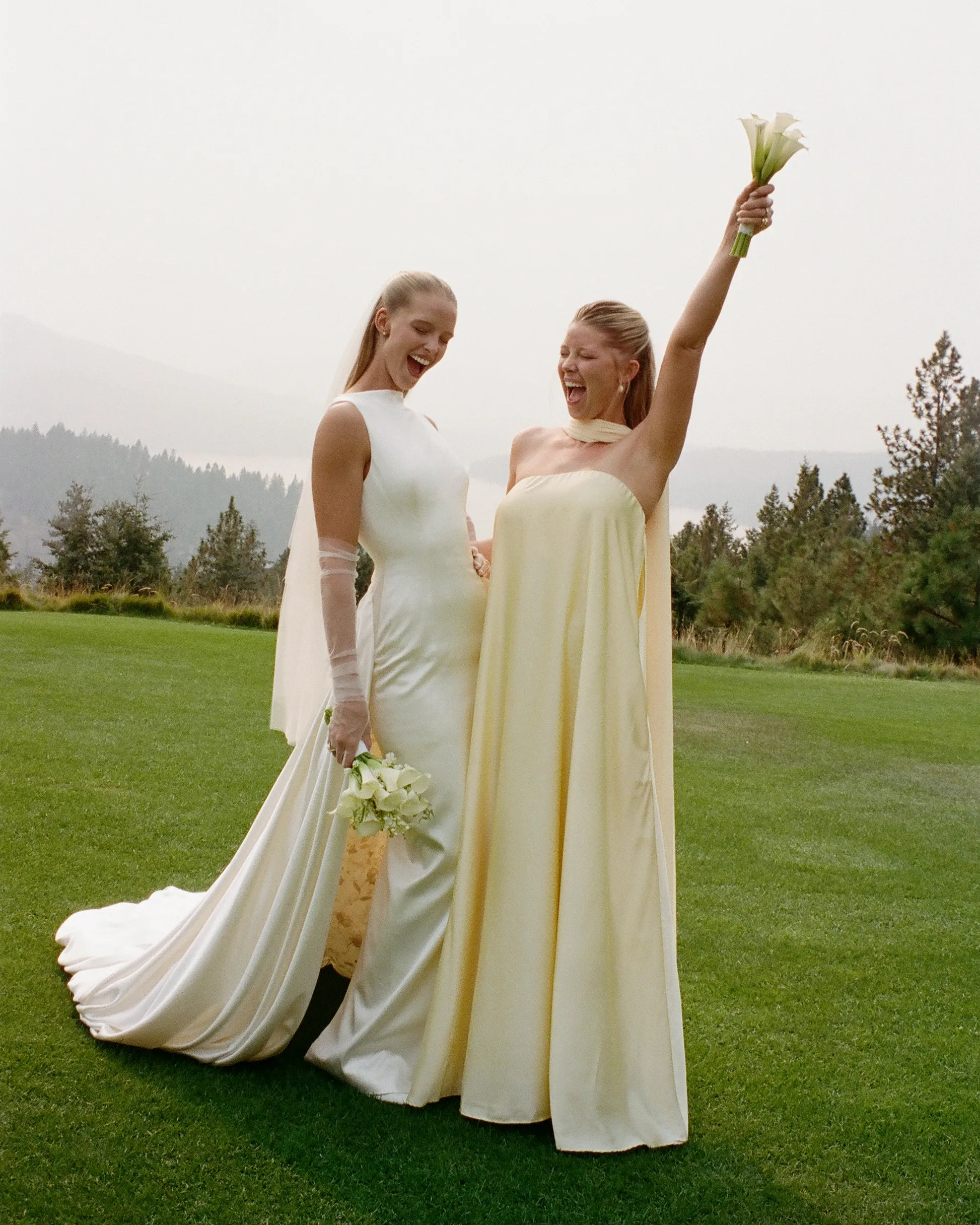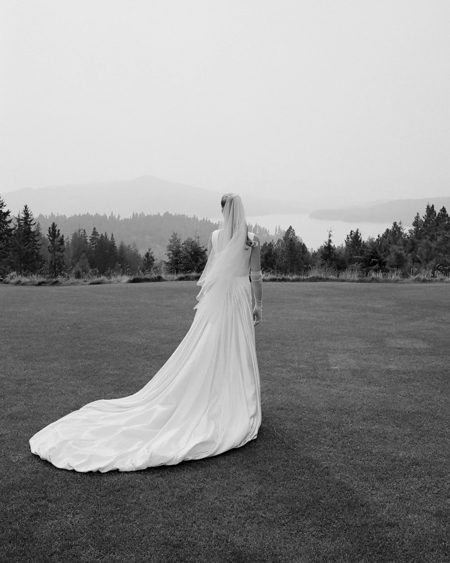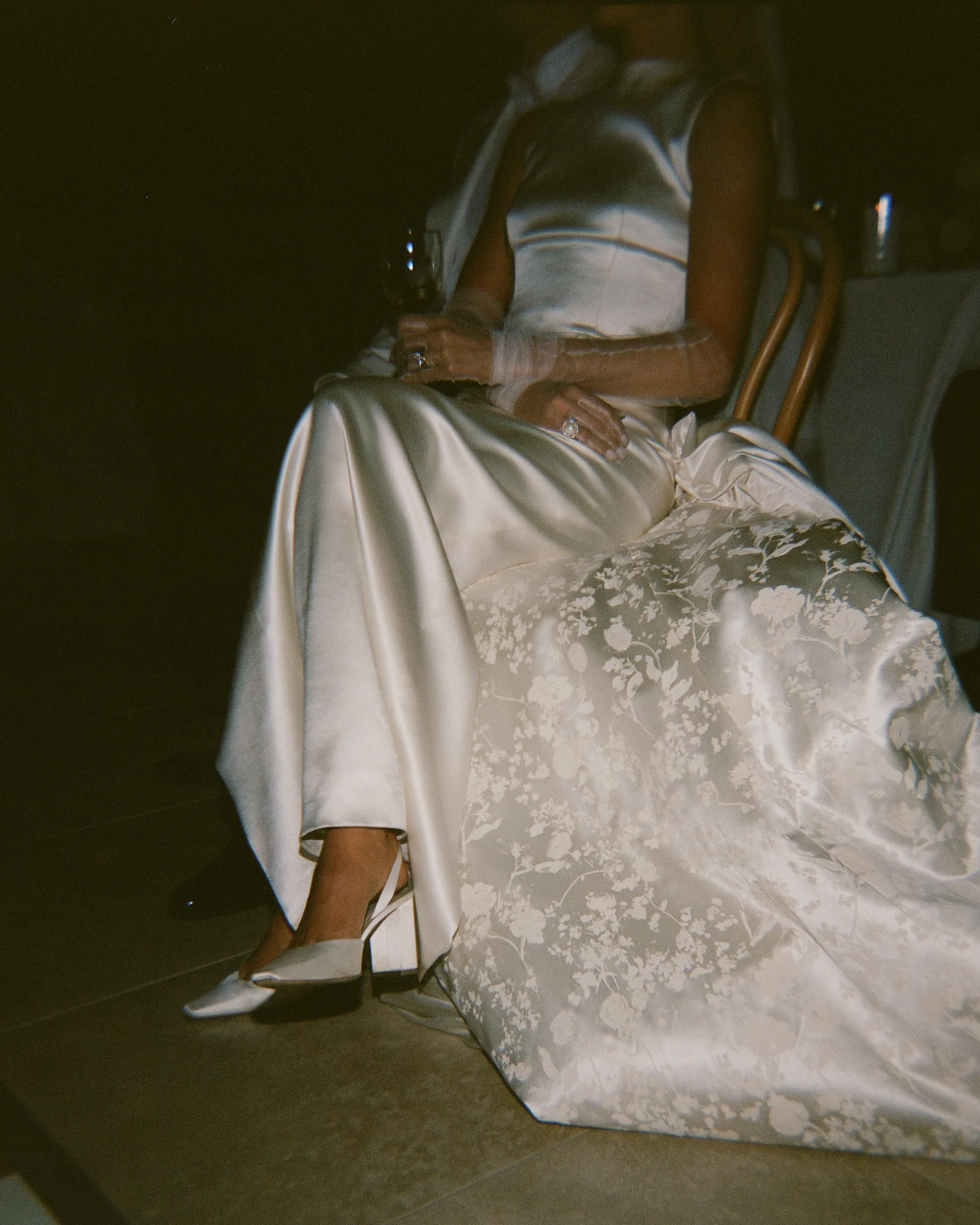 В субботу, 6 сентября, Эбби шла к алтарю в платье из шёлка и шерсти с высоким воротником и глубоким V‑образным вырезом на спине от Danielle Frankel. Вместо обычного шлейфа невеста выбрала шелковую юбку с ручной росписью на подкладке. Образ дополняли мягкие тюлевые перчатки и длинная фата.