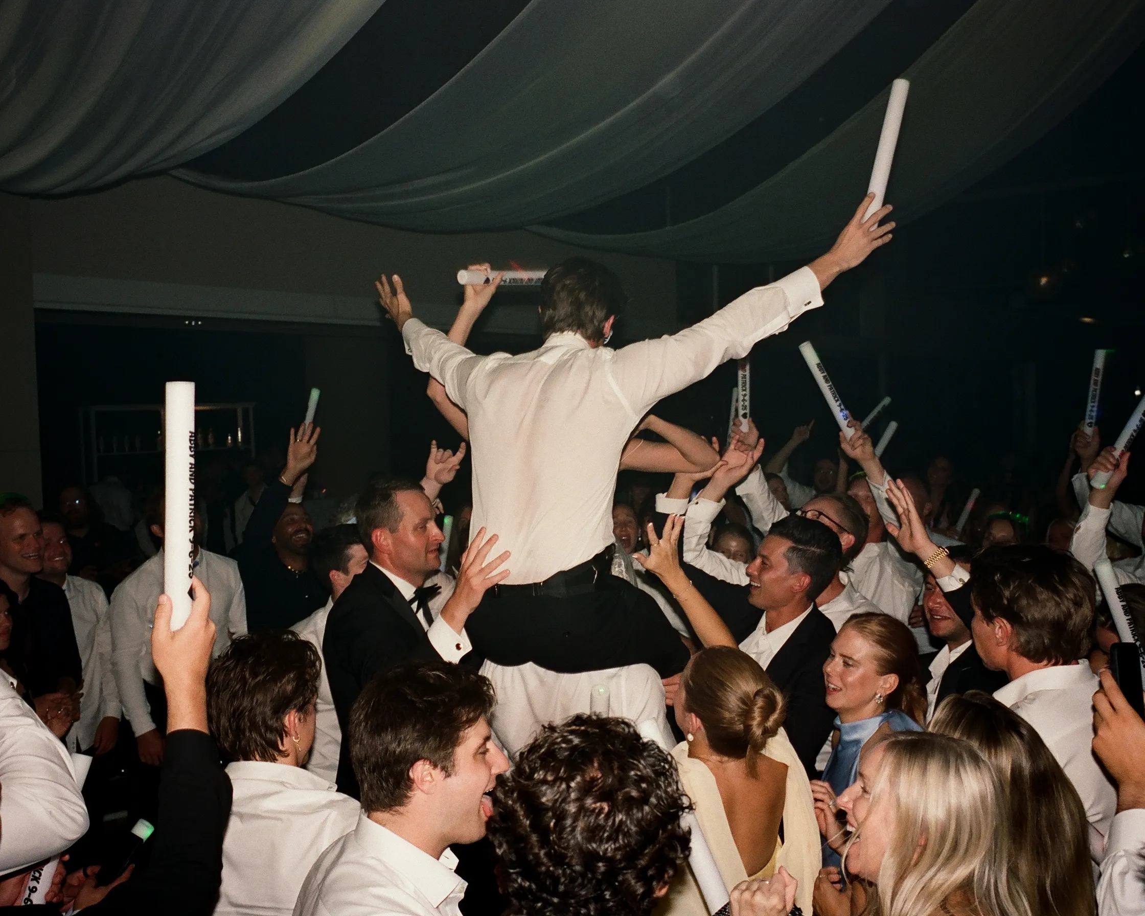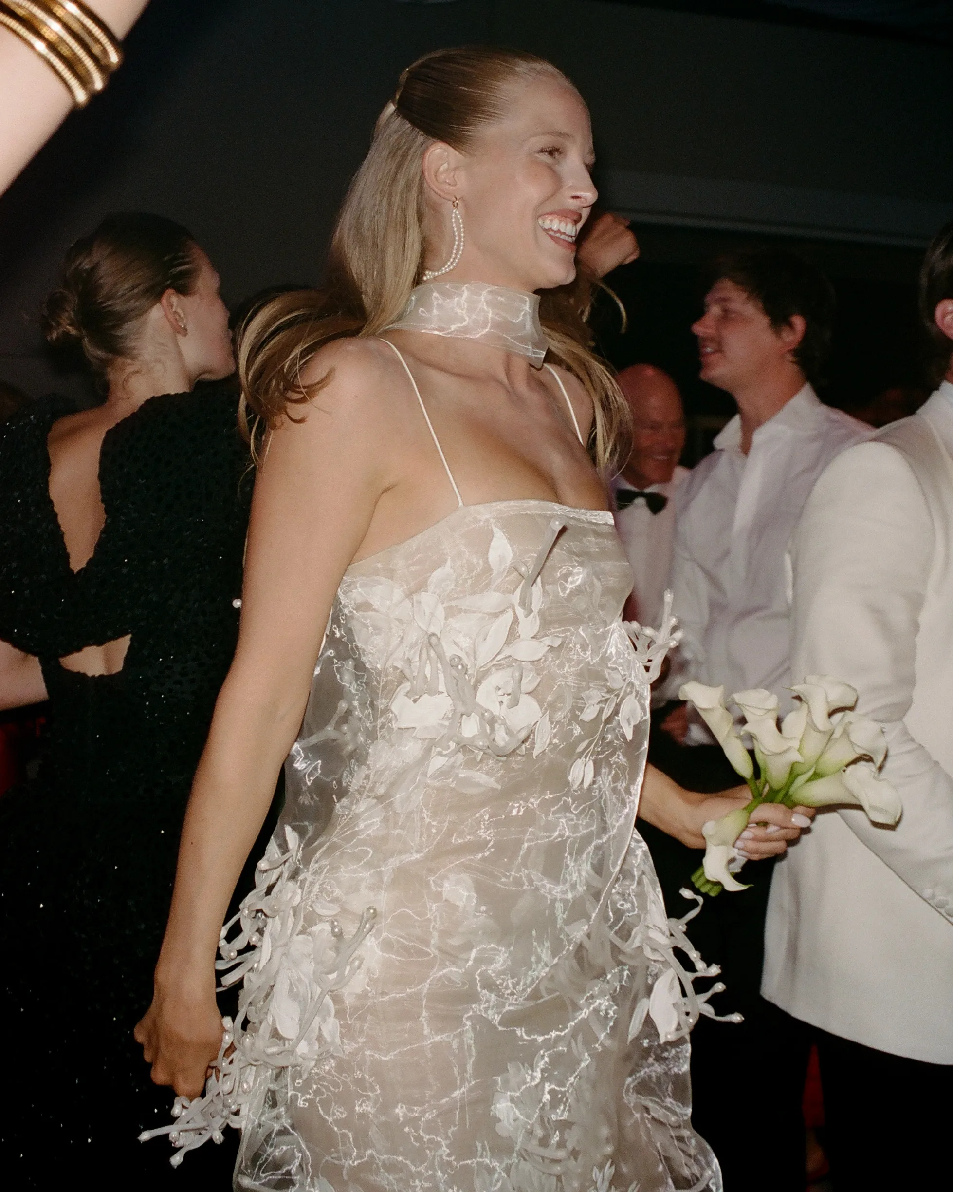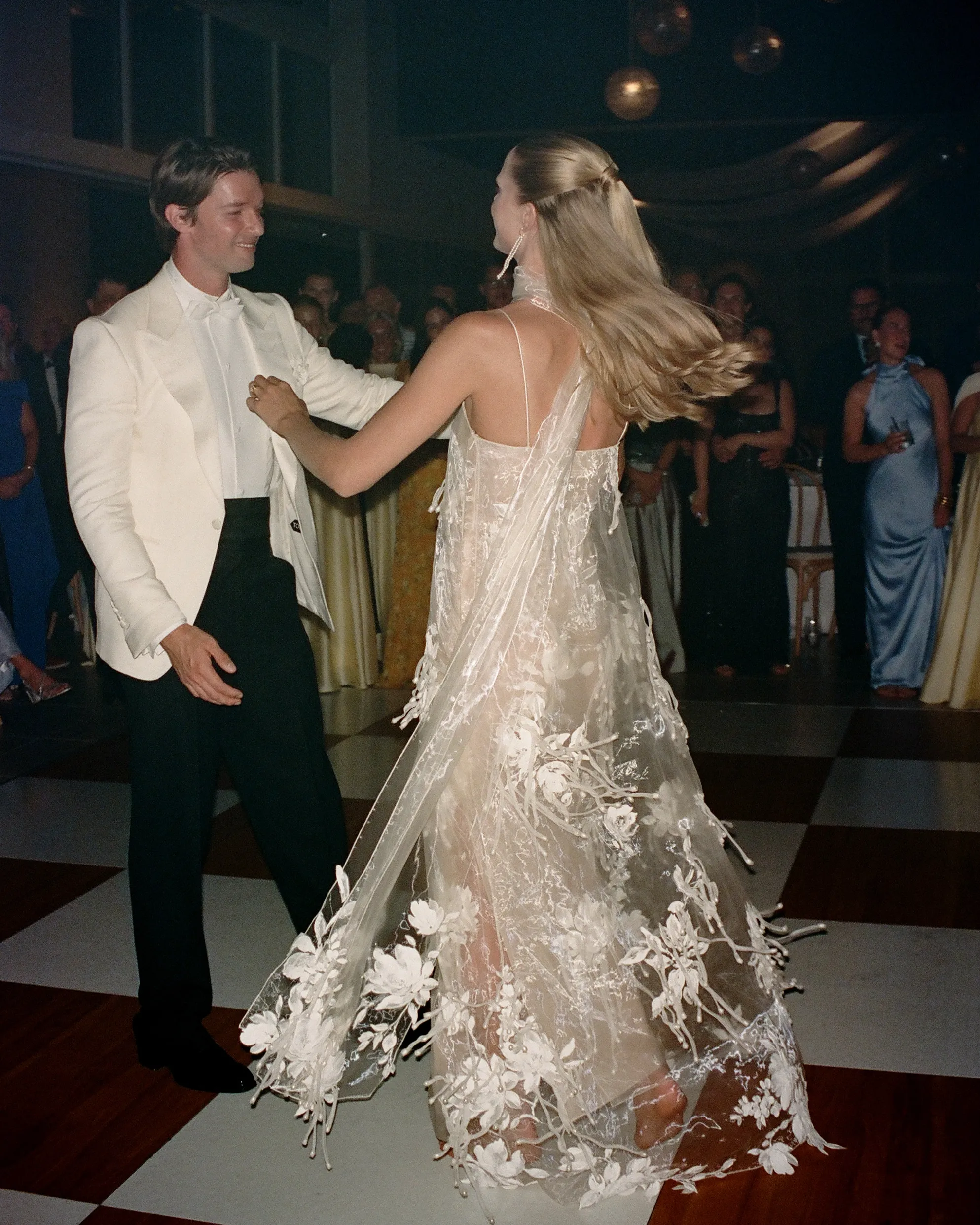 Гости же отправились на лодках к Hagadone Event Center. После тостов от семьи и друзей начались танцы. Эбби переоделась во второй образ от Danielle Frankel: в платье с ручной росписью, цветочным рисунком и жемчужной отделкой. Также Эбби надела длинные жемчужные серьги, которые были созданы по эскизу её подруги, дизайнера украшений Келси Кершнер, создавшей бренд Galley.