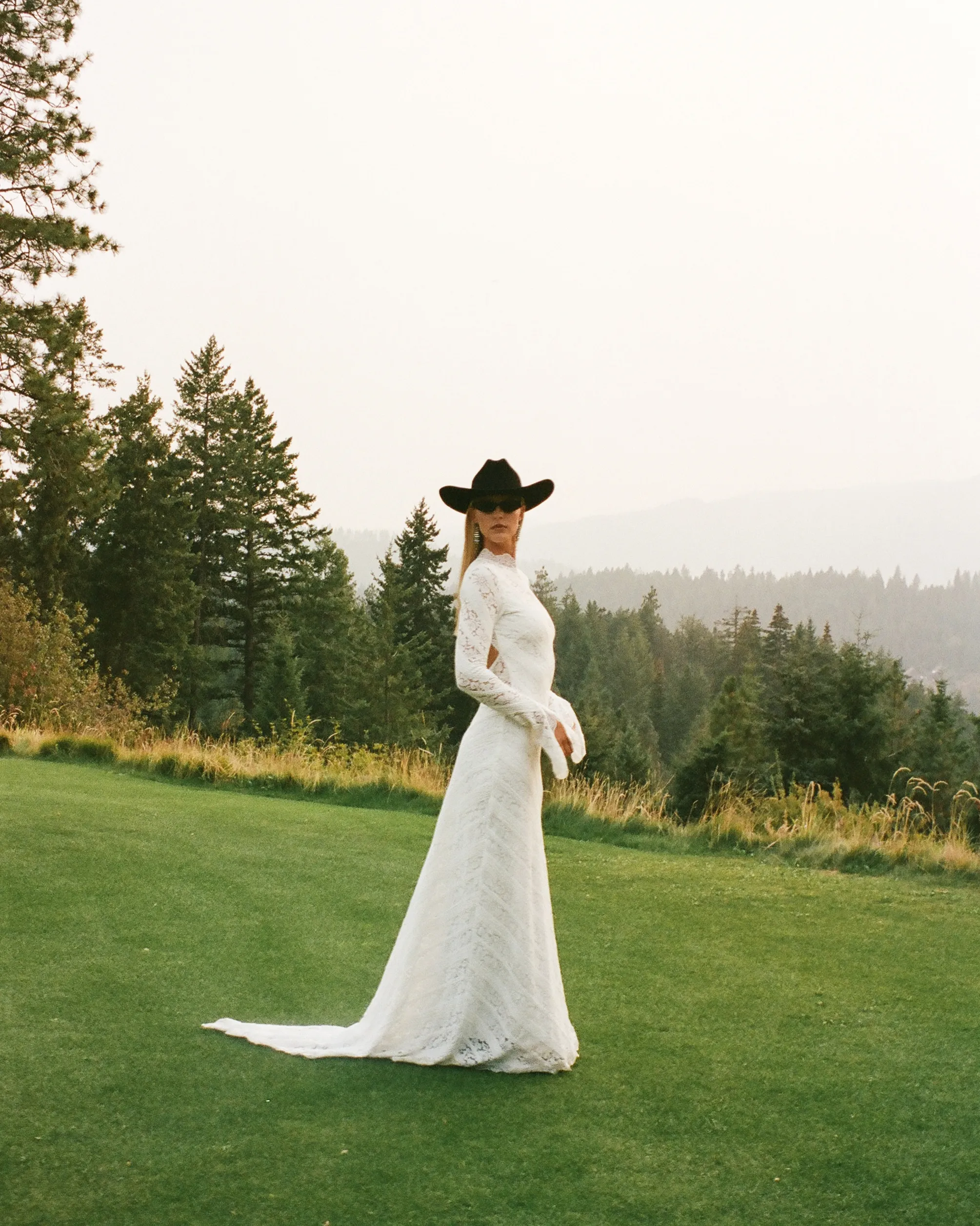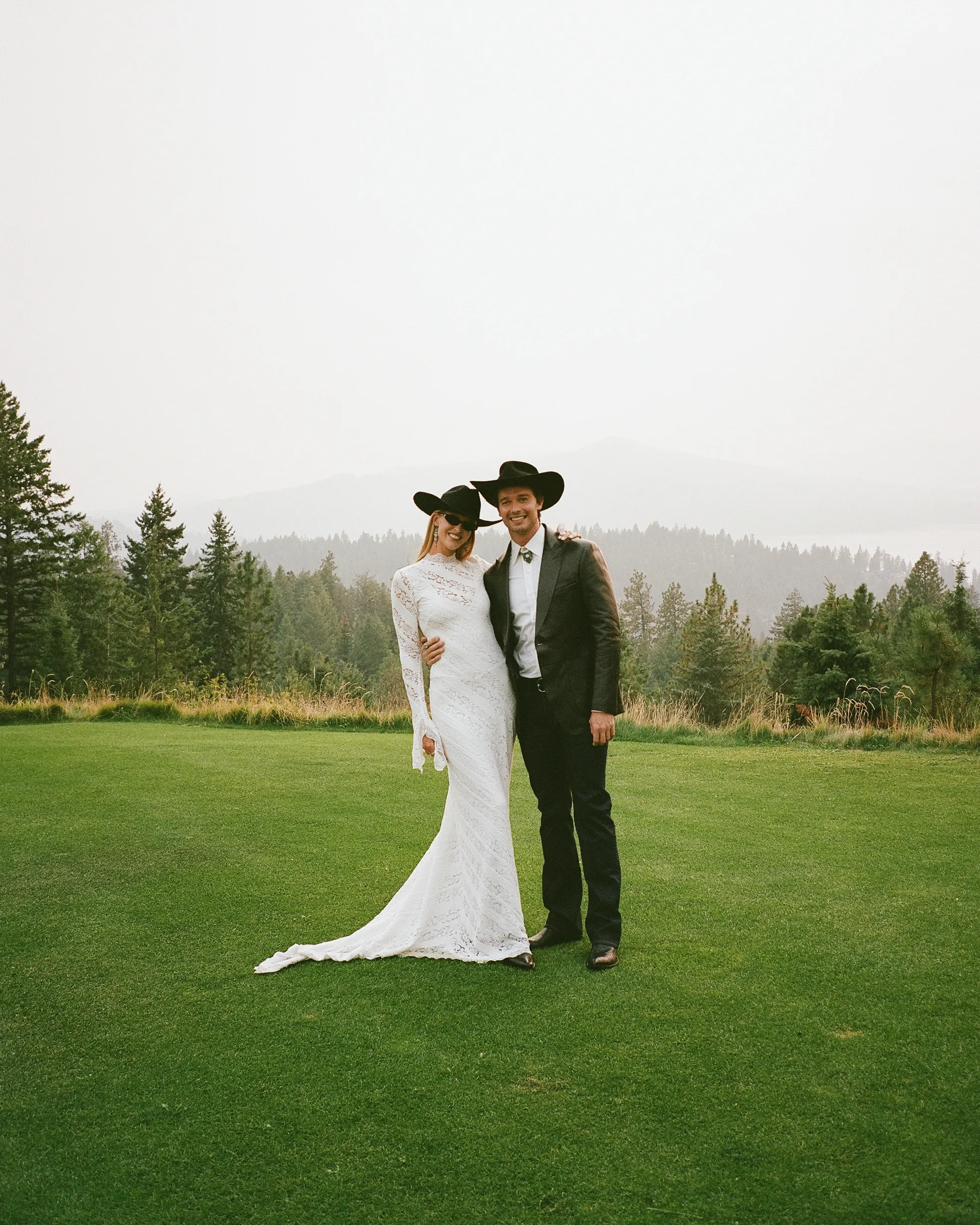 Невеста надела кружевное платье с длинными рукавами от Bec + Bridge, чёрные ковбойские ботинки и чёрную шляпу.