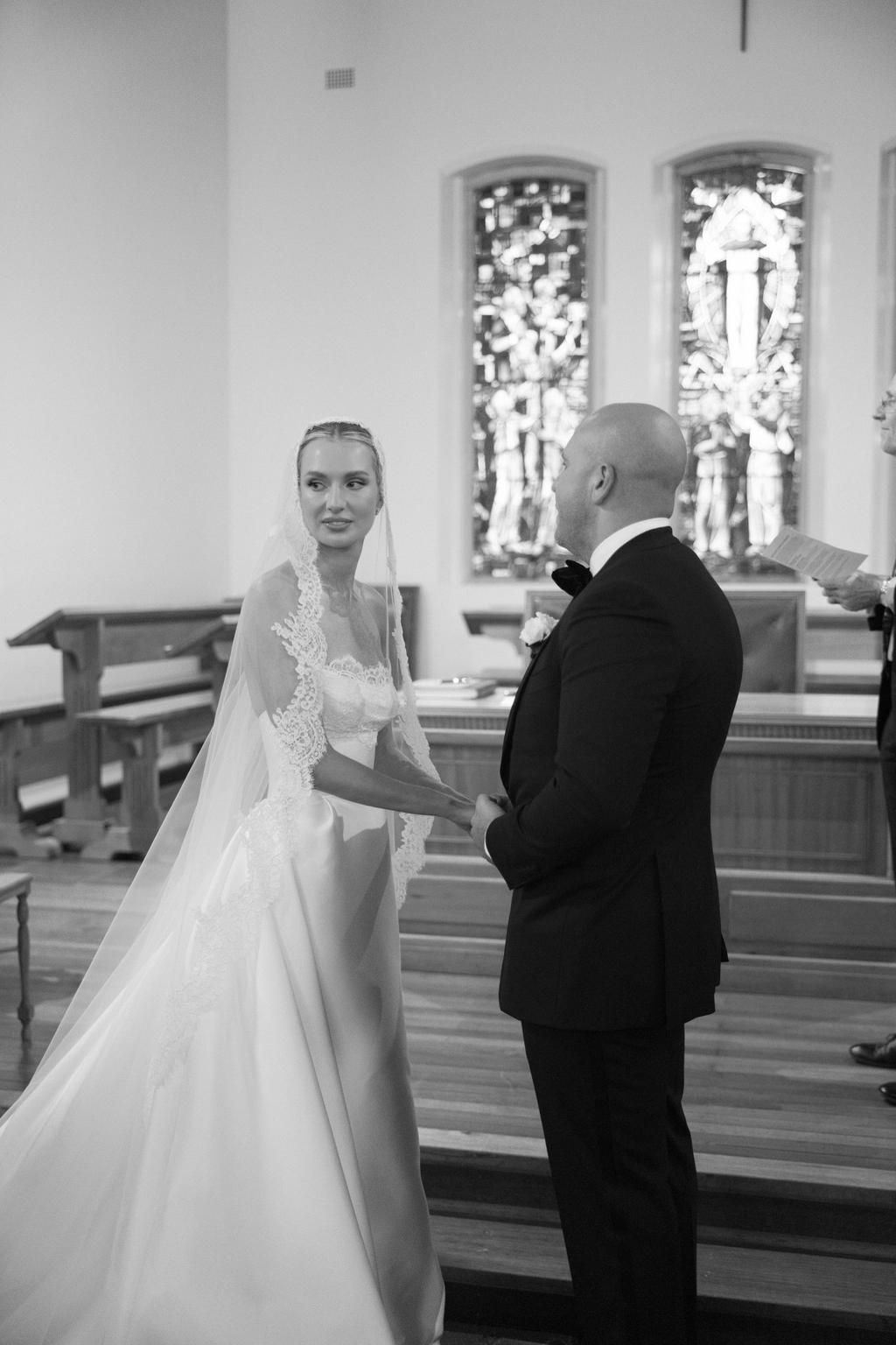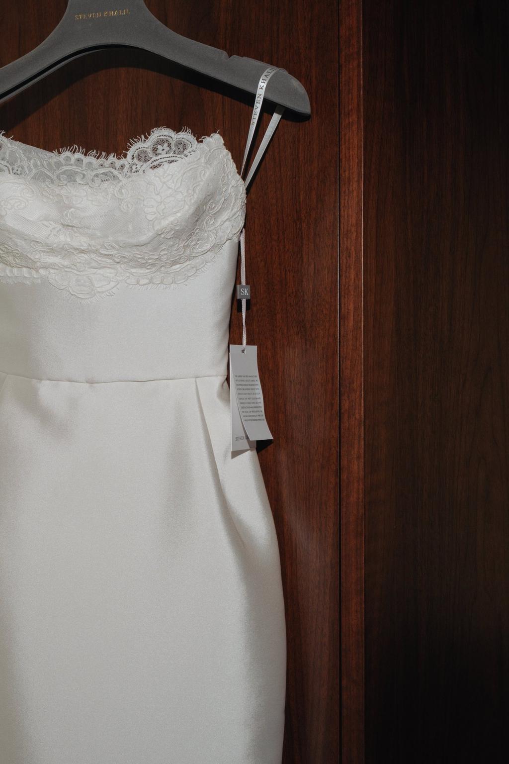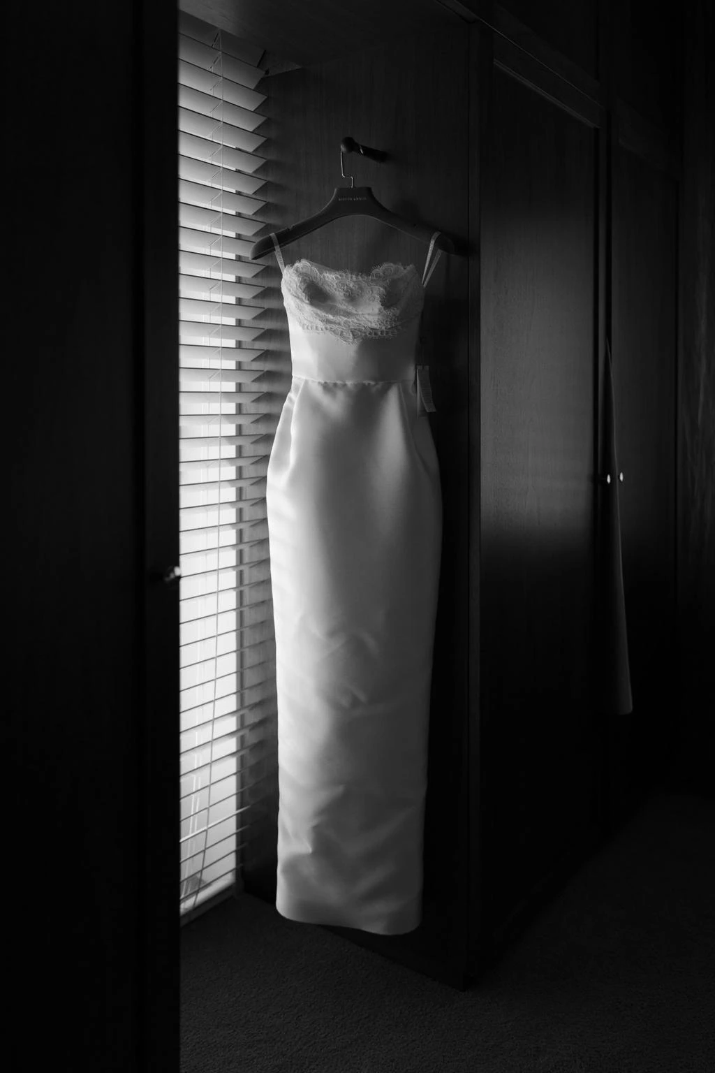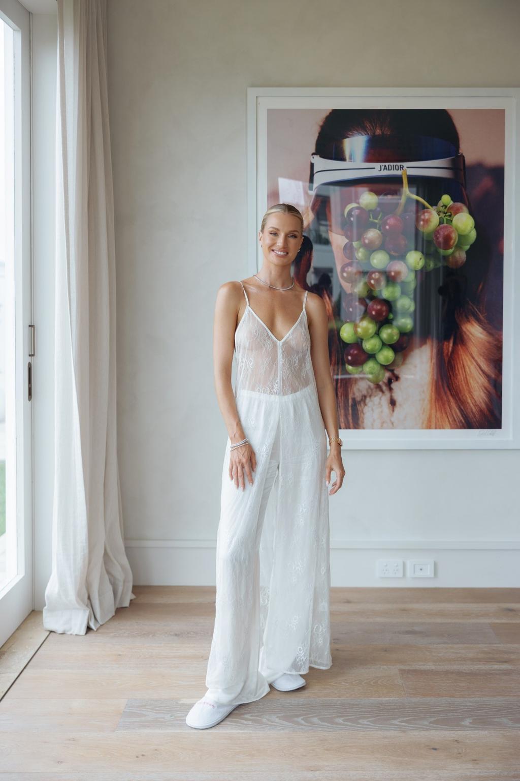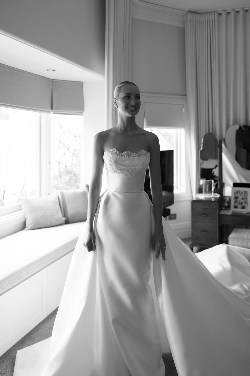 Для своего первого образа Бернадетт выбрала своего любимого свадебного дизайнера из Австралии — Стивена Халила. «Моей целью было воплотить старый голливудский гламур», — говорит Бернадетт. «Сексуально, но скромно».