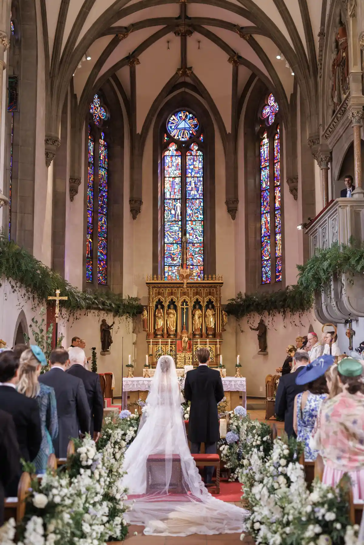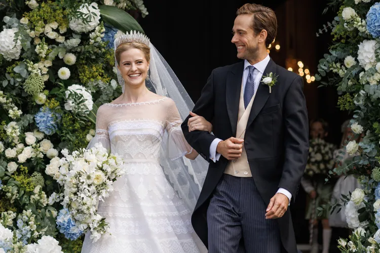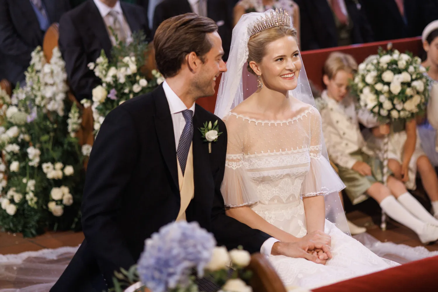 Мария Каролина прошла к алтарю в классическом белом платье. Её свадебный образ дополнили длинная фата, бриллиантовые серьги и тиара с бахромой Габсбургов, созданная в Вене придворным ювелиром около 1890 года.