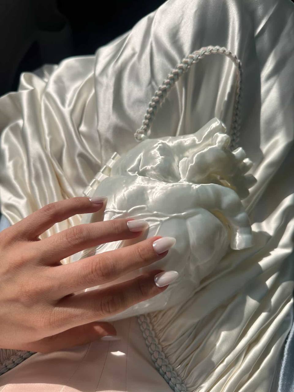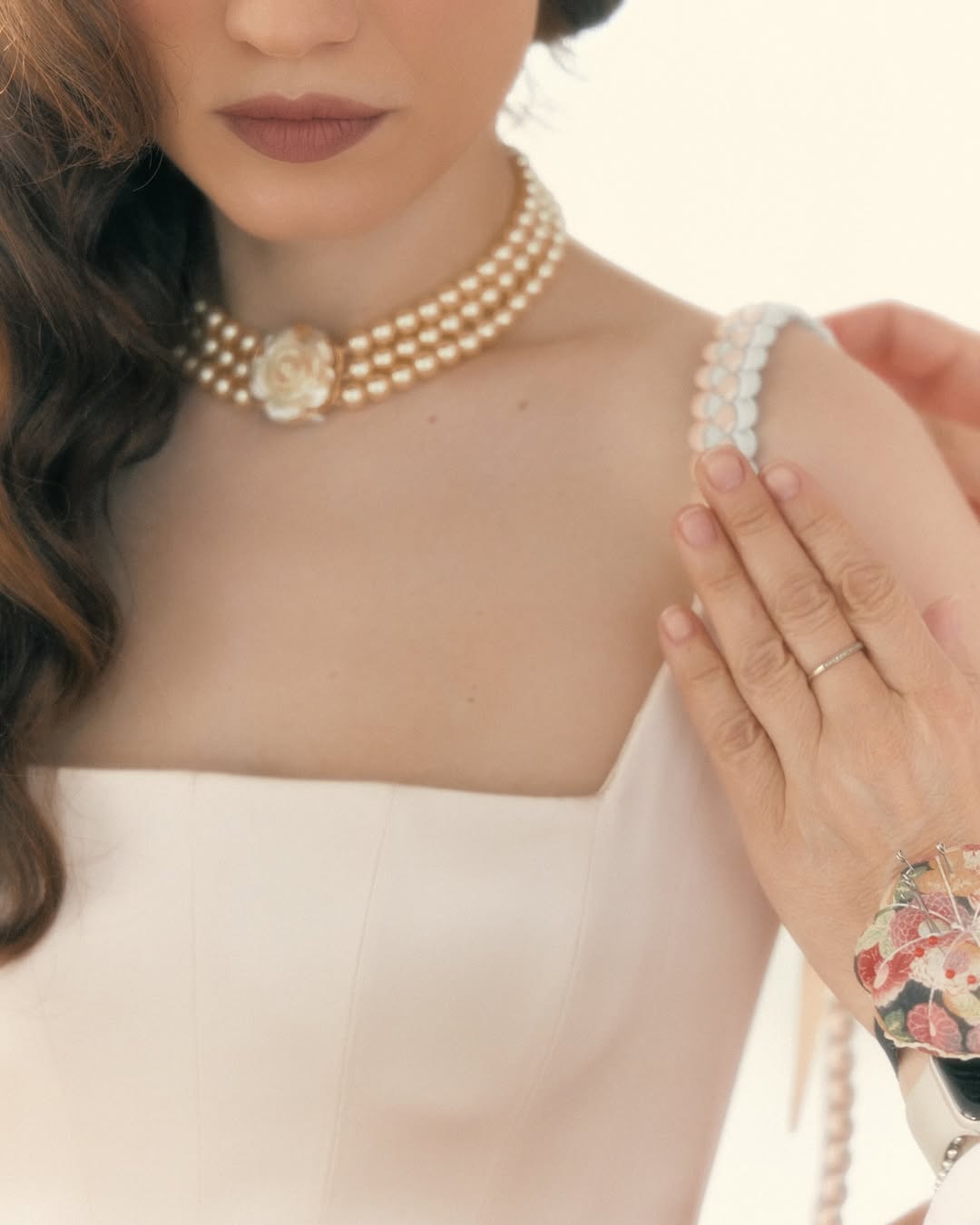 Изюминкой образа стали бретельки платья — косы из бархатных лент. Образ дополнили идеальные лодочки Dior, чокер Roseville, клатч Corsavelle и кольца Ocean Inside.