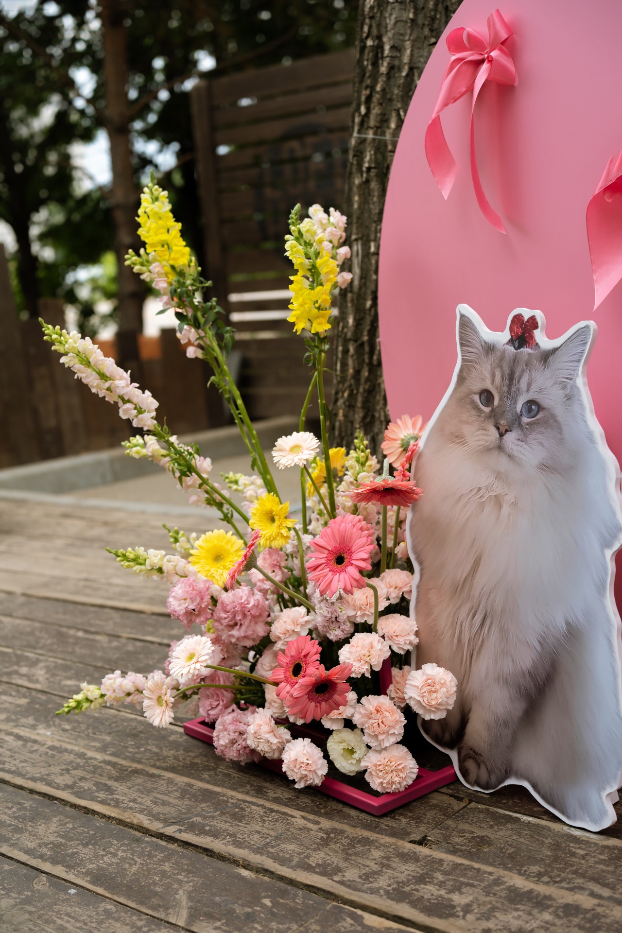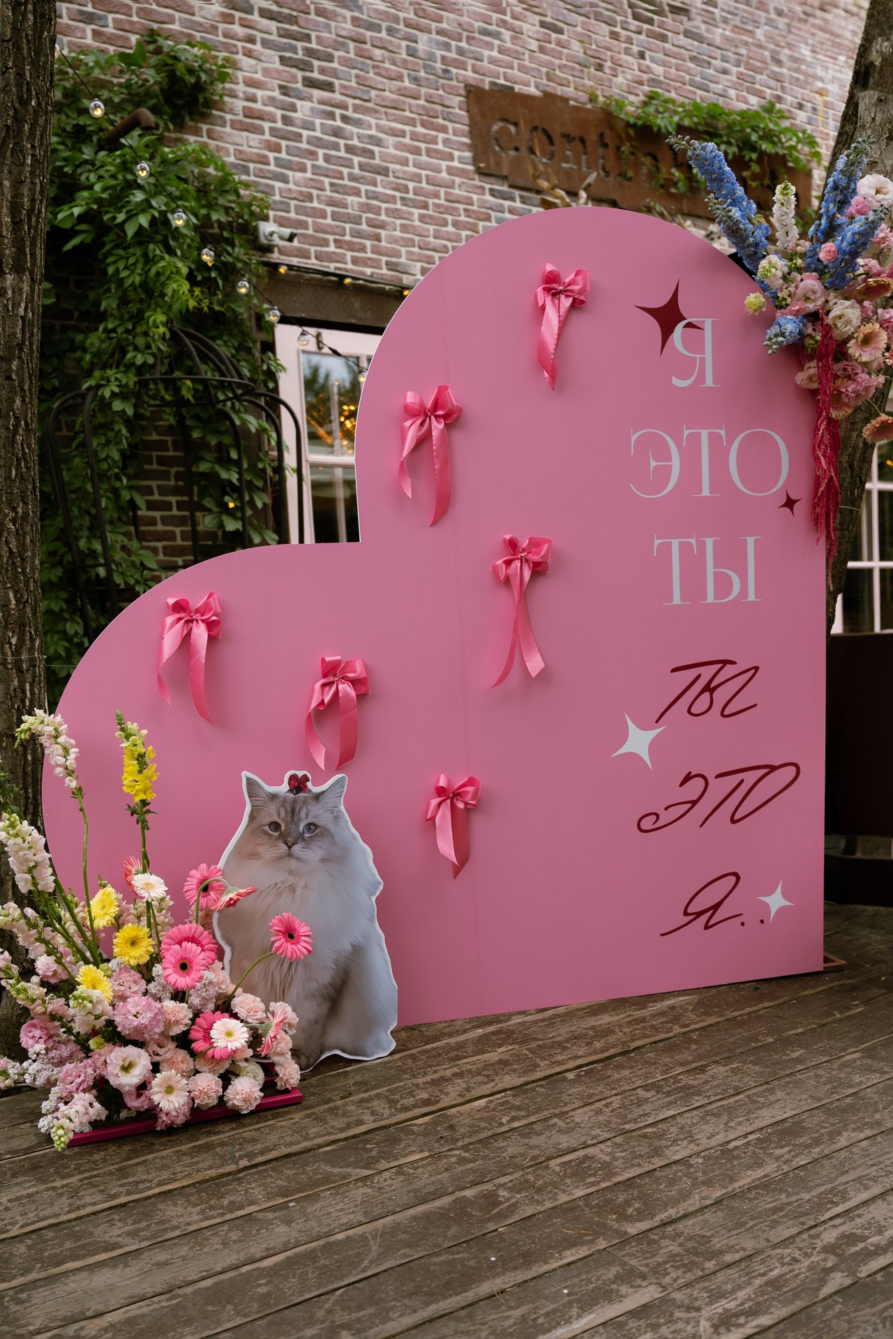 Нашего декоратора Эллу мы нашли также по отзывам, опыту работы на нашей площадке и любви к ярким нестандартным решениям в декоре. Так у нас появились детские фото на велкоме, большая фигура нашего кота в зоне церемонии, единый стол с ярким декором из фруктов и цветов и гирлянды над головой.