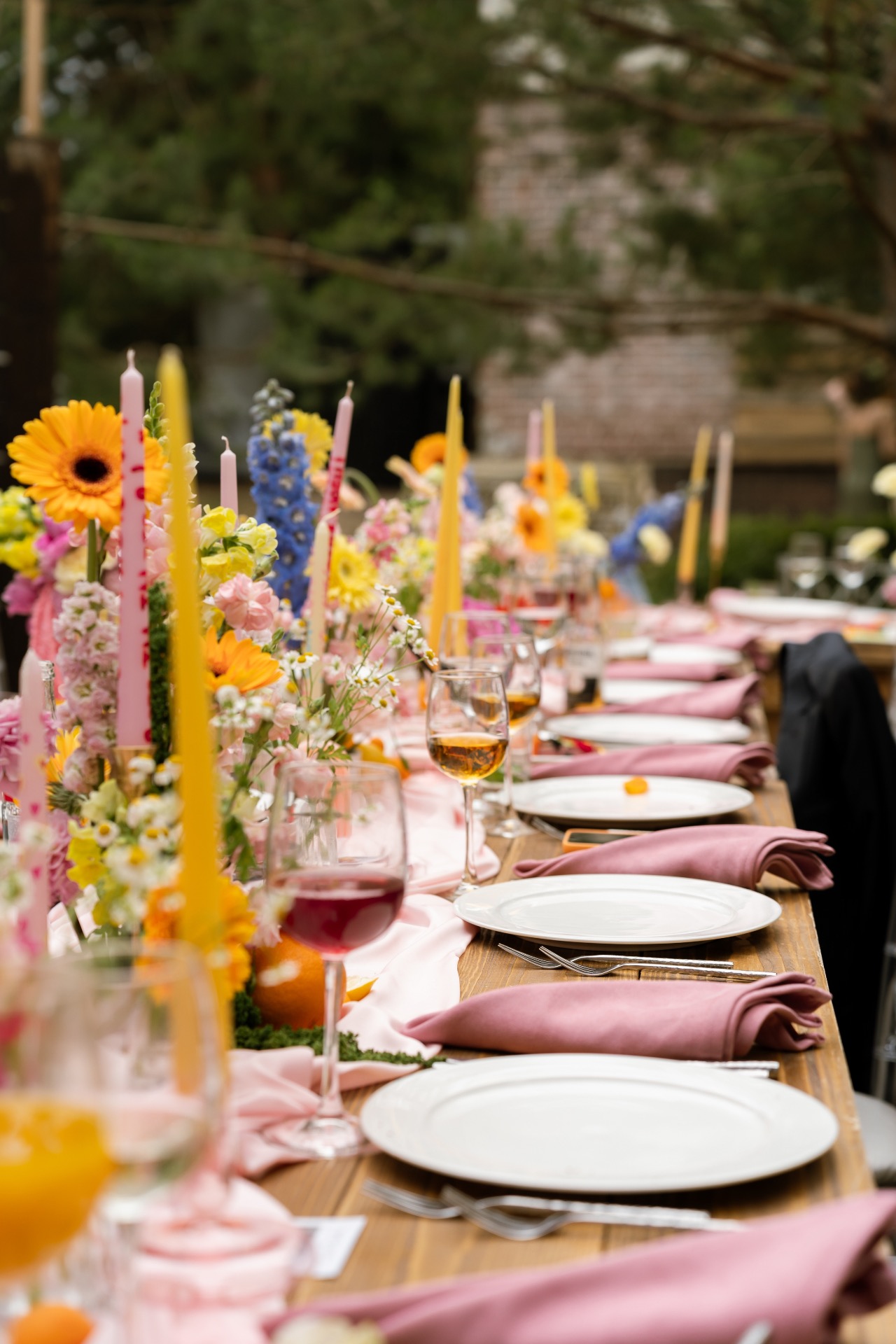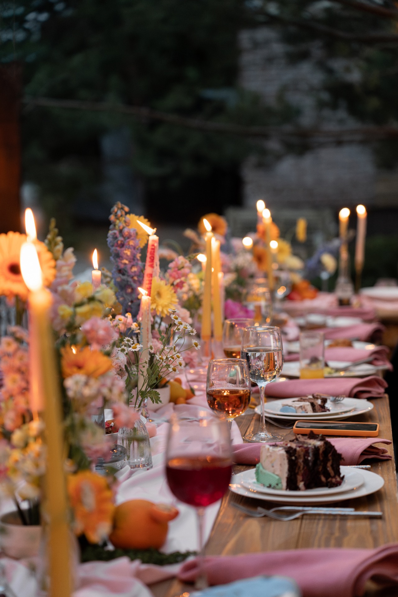 Торт нам сделали ребята Palette Dessert: он был прямоугольный, с яркими дорожками крема и цветами, сверху украшен свечками и отлично дополнял остальной декор.