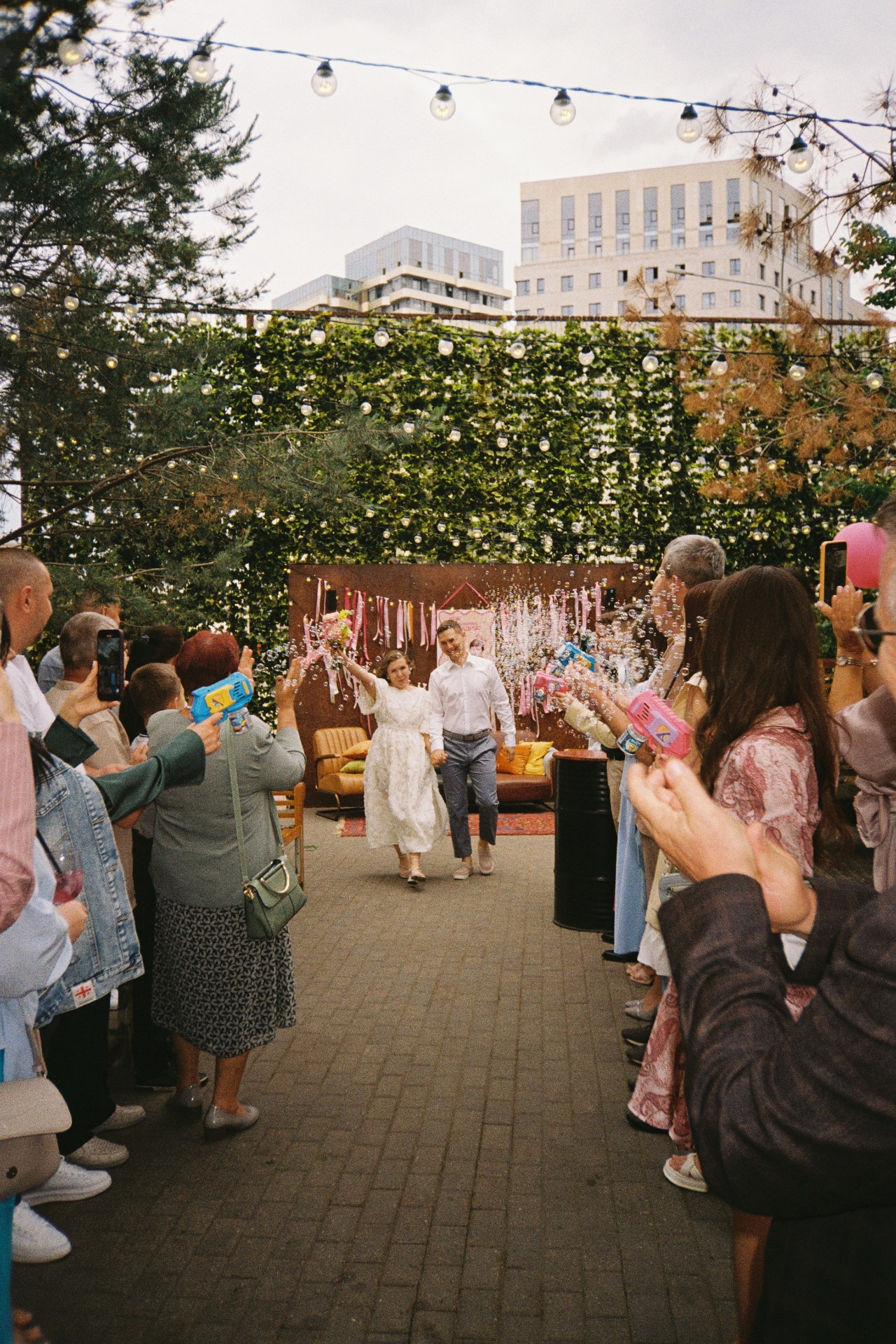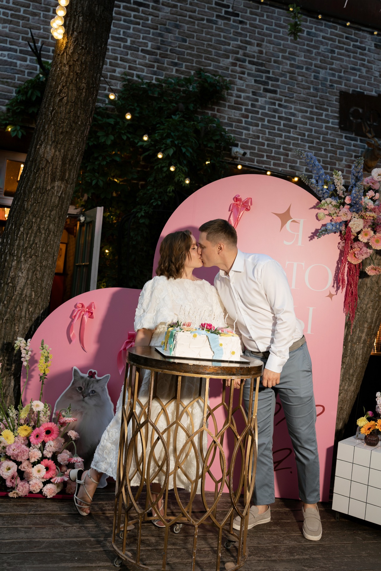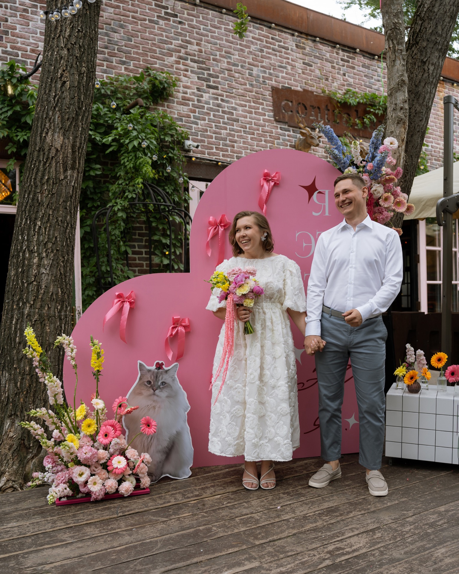 Мне очень запомнился наш совместный выход. Перед ним я очень волновалась, но как только мы зашли на площадку и пошли через живой коридор из гостей под залп мыльных пузырей и поддерживающие возгласы, я увидела, как нереально красиво всё украшено: зона церемонии, фигурка нашего кота, красиво одетые по дресс-коду гости. Всё волнение отпустило, и я почувствовала большое облегчение и счастье.