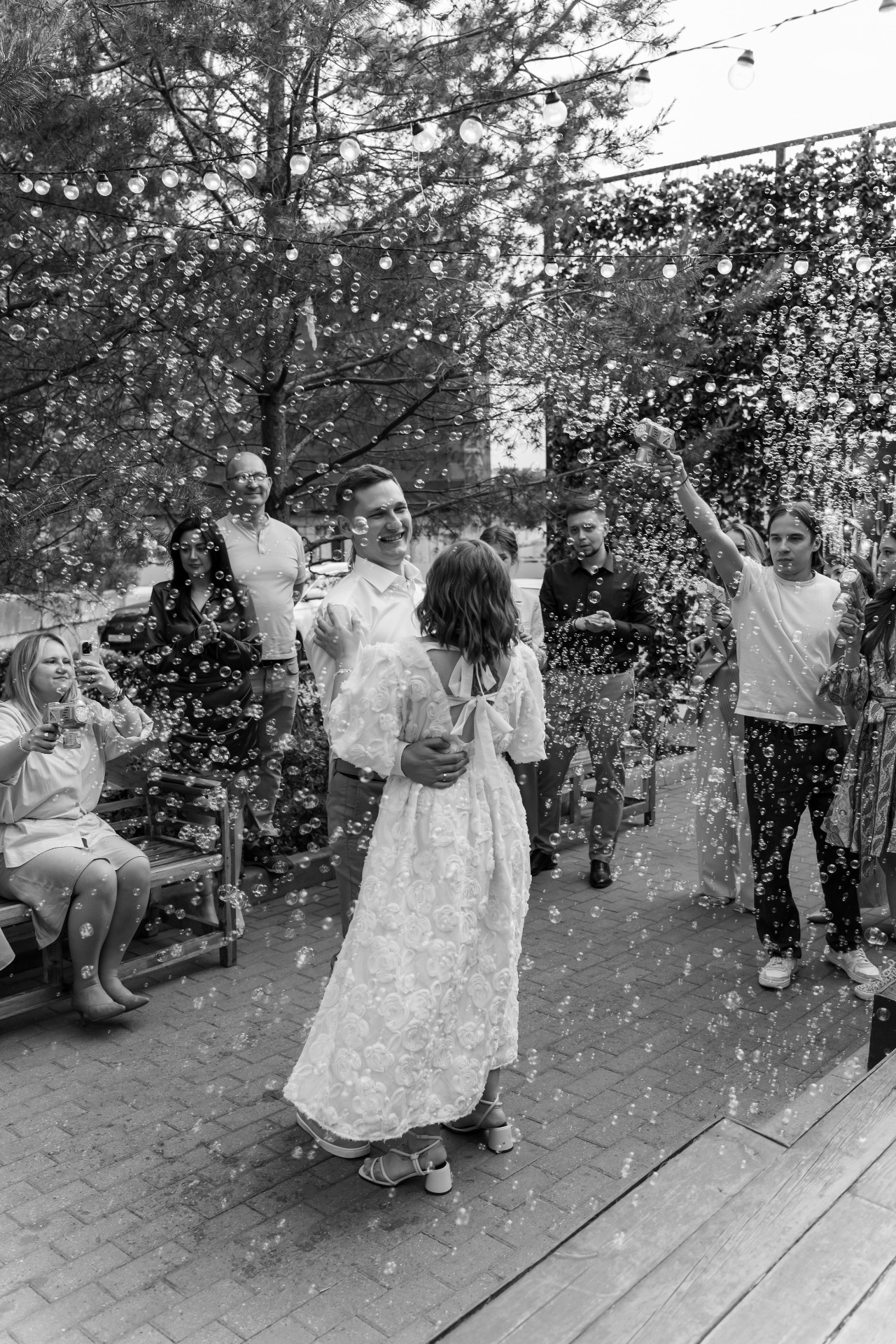 Наш первый танец был под залп мыльных пузырей и песню Мурата Насырова «Я — это ты, ты — это я». Эта же фраза была написана на большом сердце в зоне церемонии.