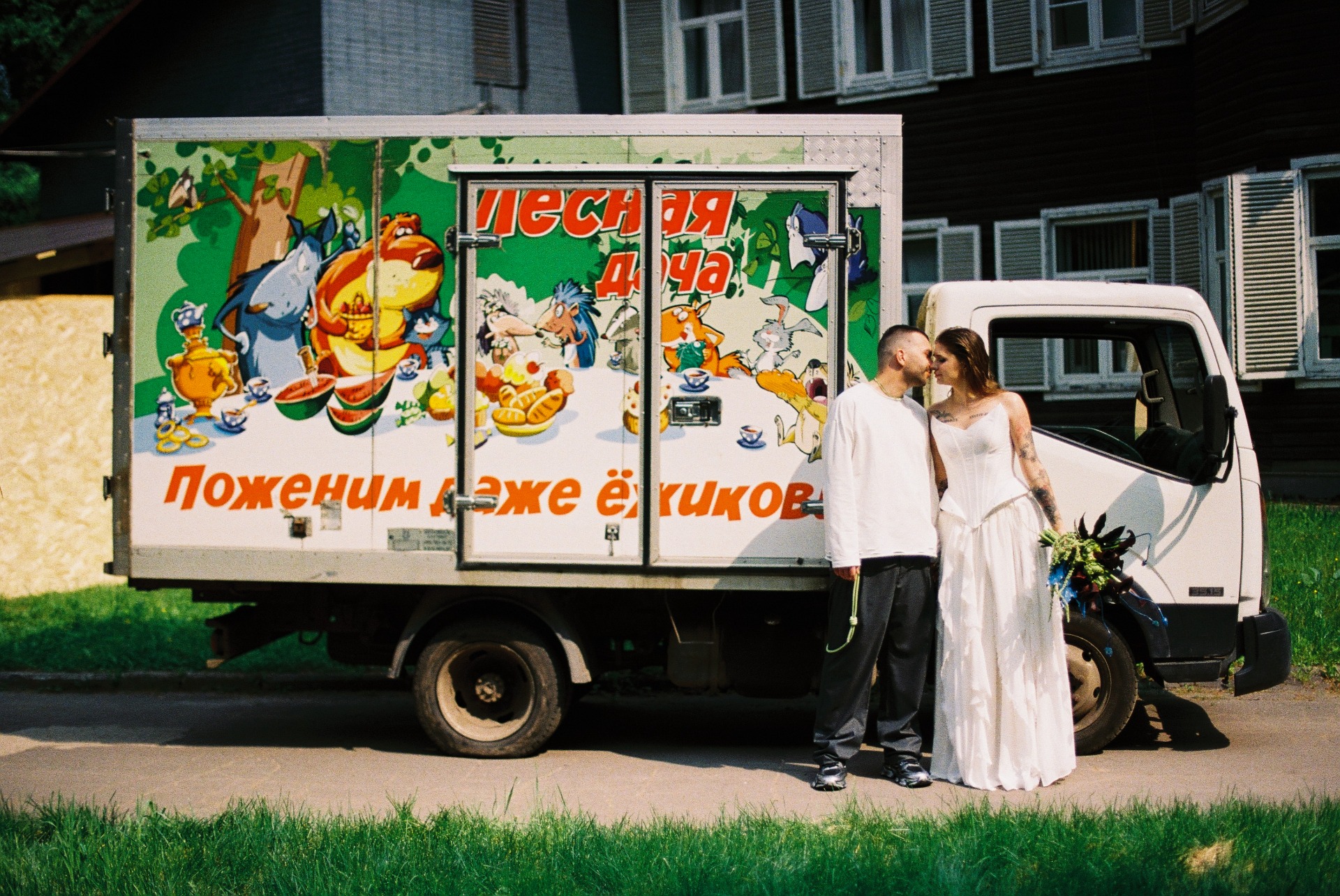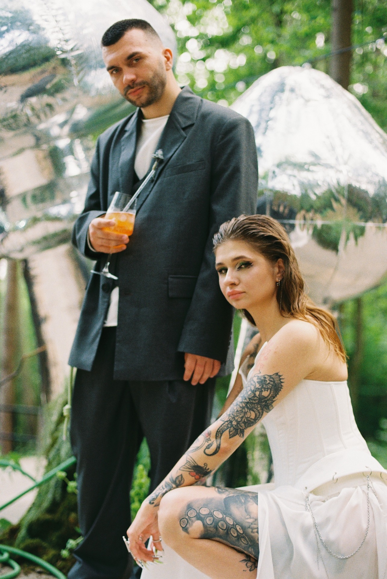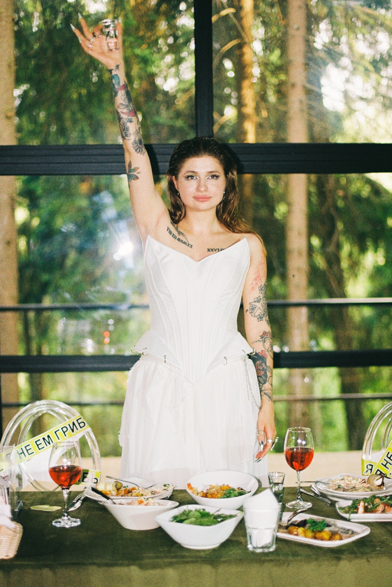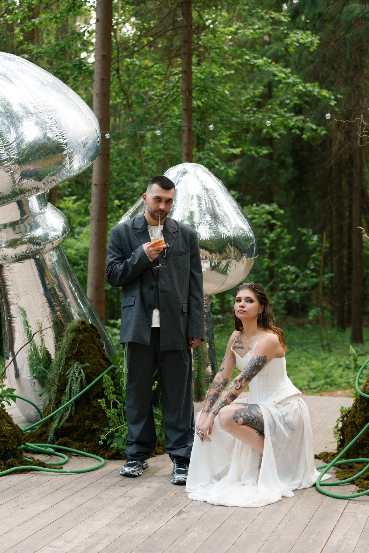 Потом мы начали думать, как отразить себя в свадьбе и вспомнили о наших кислотных рейвах, любви к техно, фестивалям и документалкам про грибы. Так родилась идея ростовых грибов на церемонии. Ключевая фраза всей свадьбы: «Я не ем грибы» — шутка из жизни, фраза под видео, которое Влад снял, когда готовил грибы-эноки в Таиланде. Эта реплика стала нашей фирменной.