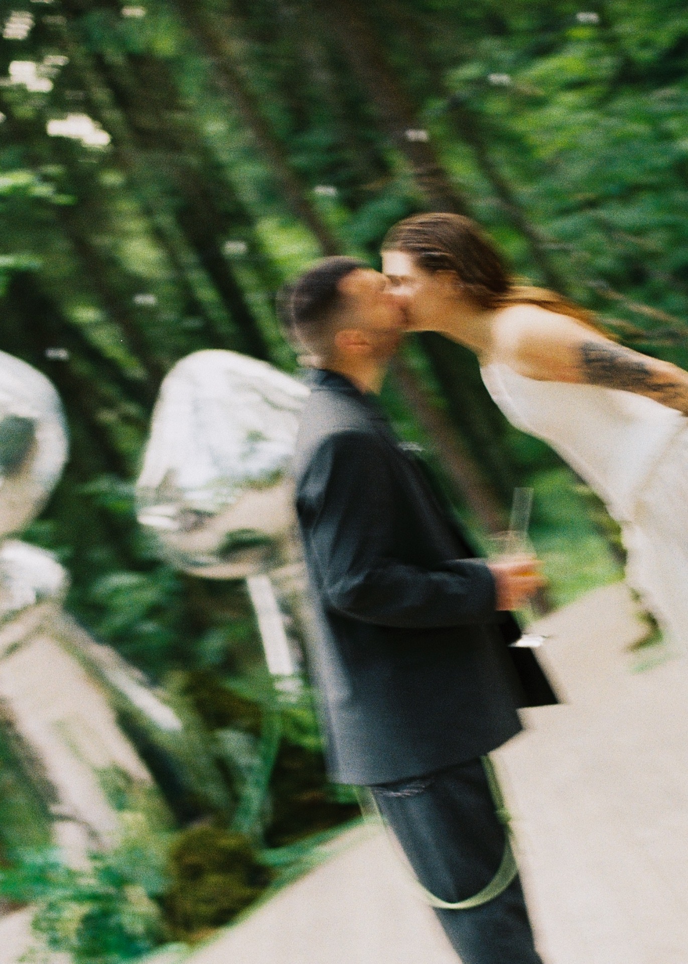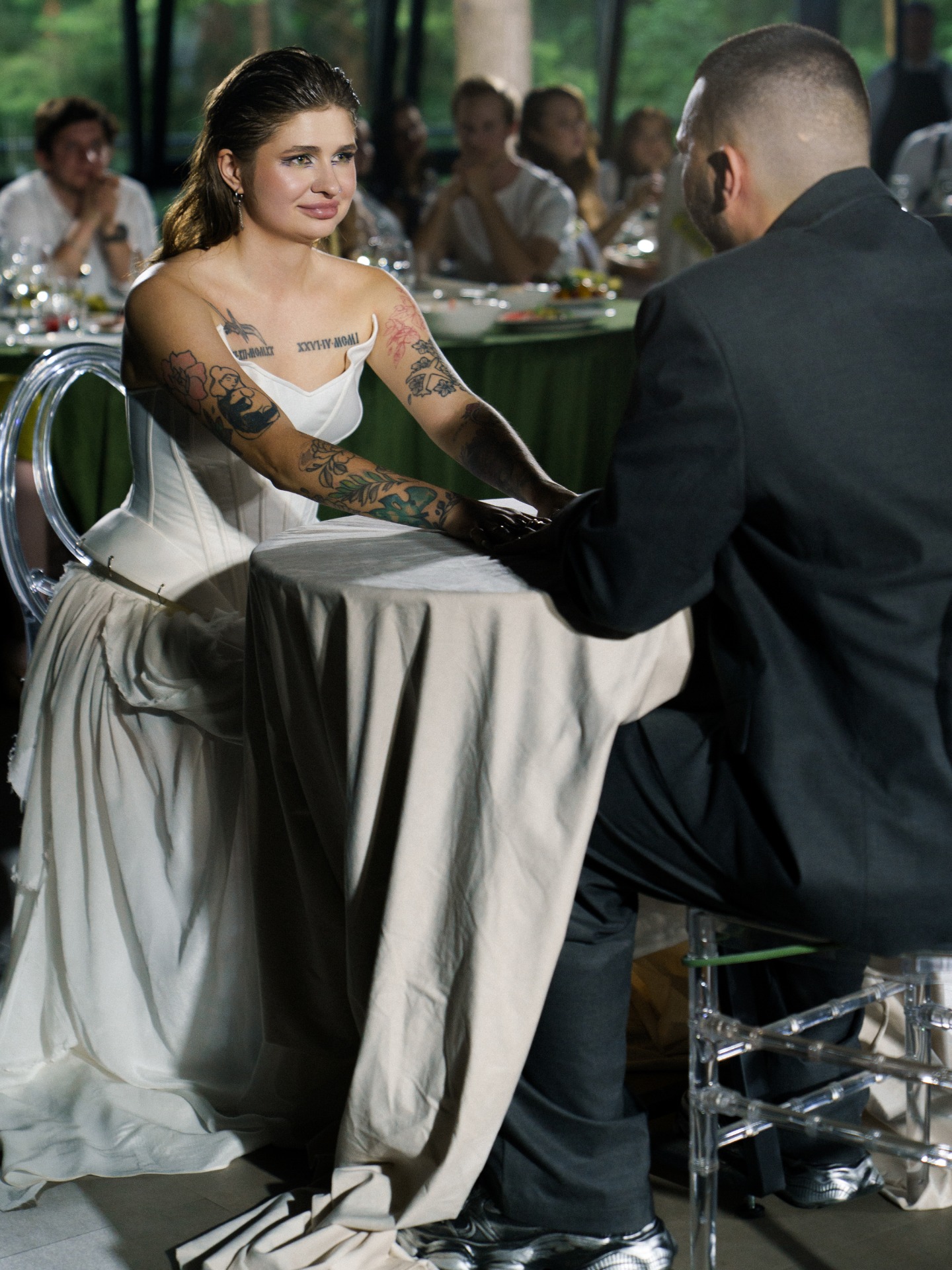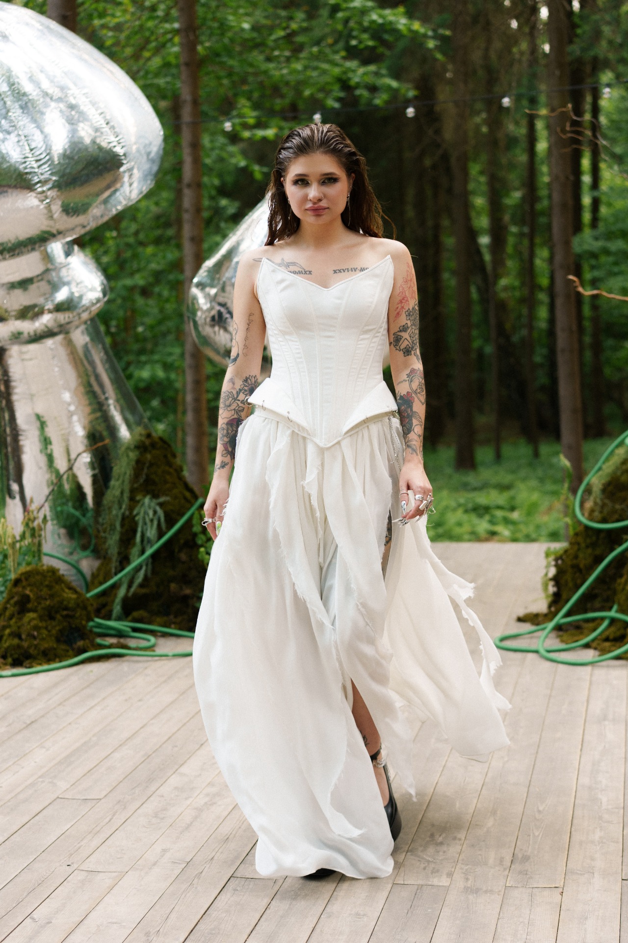 Потом мы начали думать, как отразить себя в свадьбе и вспомнили о наших кислотных рейвах, любви к техно, фестивалям и документалкам про грибы. Так родилась идея ростовых грибов на церемонии. Ключевая фраза всей свадьбы: «Я не ем грибы» — шутка из жизни, фраза под видео, которое Влад снял, когда готовил грибы-эноки в Таиланде. Эта реплика стала нашей фирменной.