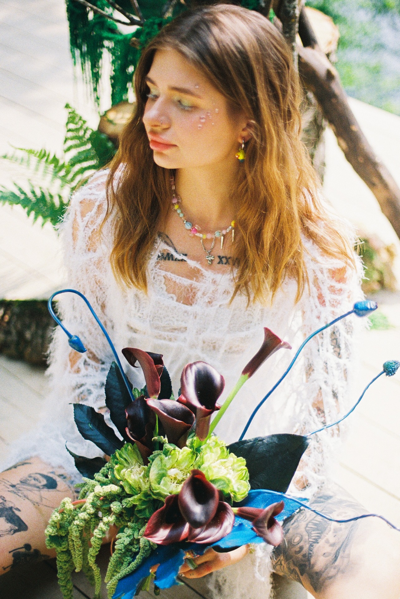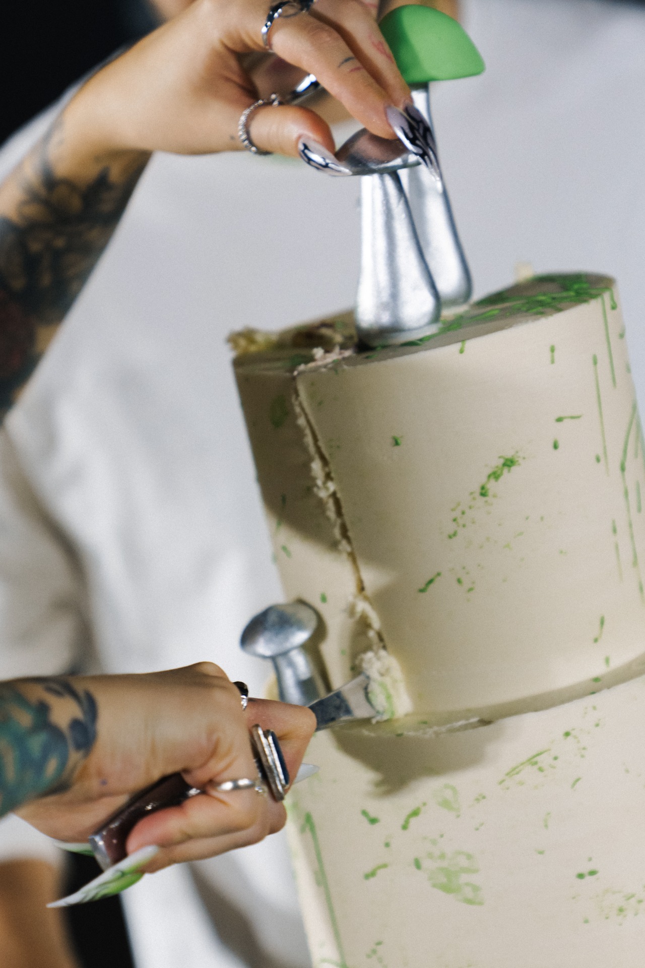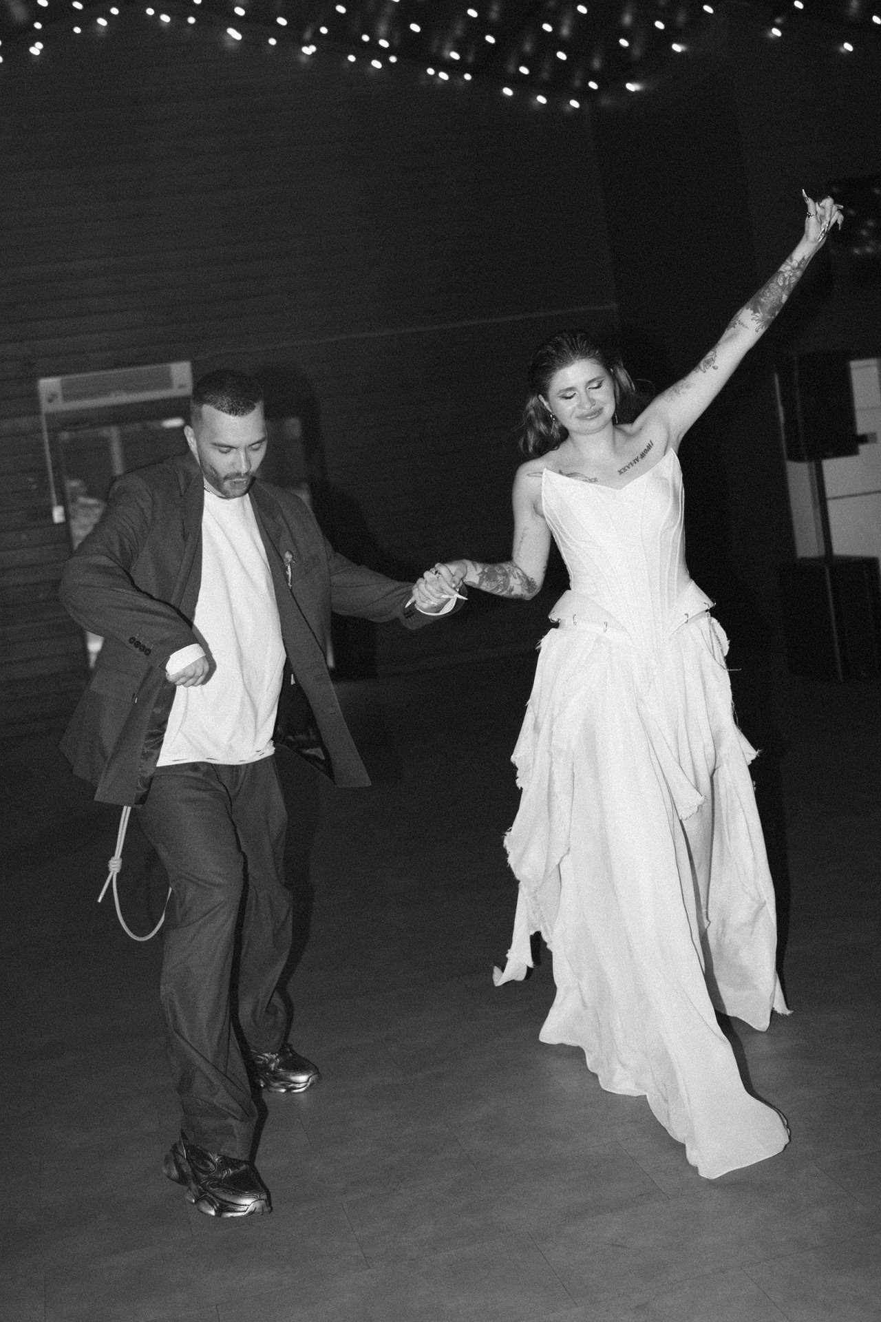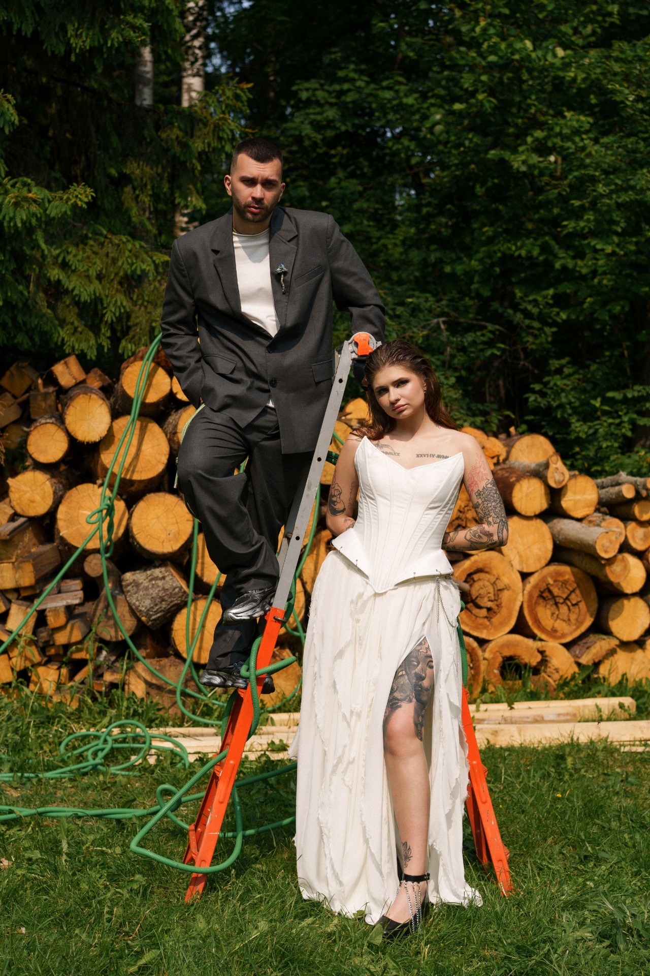 Потом мы начали думать, как отразить себя в свадьбе и вспомнили о наших кислотных рейвах, любви к техно, фестивалям и документалкам про грибы. Так родилась идея ростовых грибов на церемонии. Ключевая фраза всей свадьбы: «Я не ем грибы» — шутка из жизни, фраза под видео, которое Влад снял, когда готовил грибы-эноки в Таиланде. Эта реплика стала нашей фирменной.