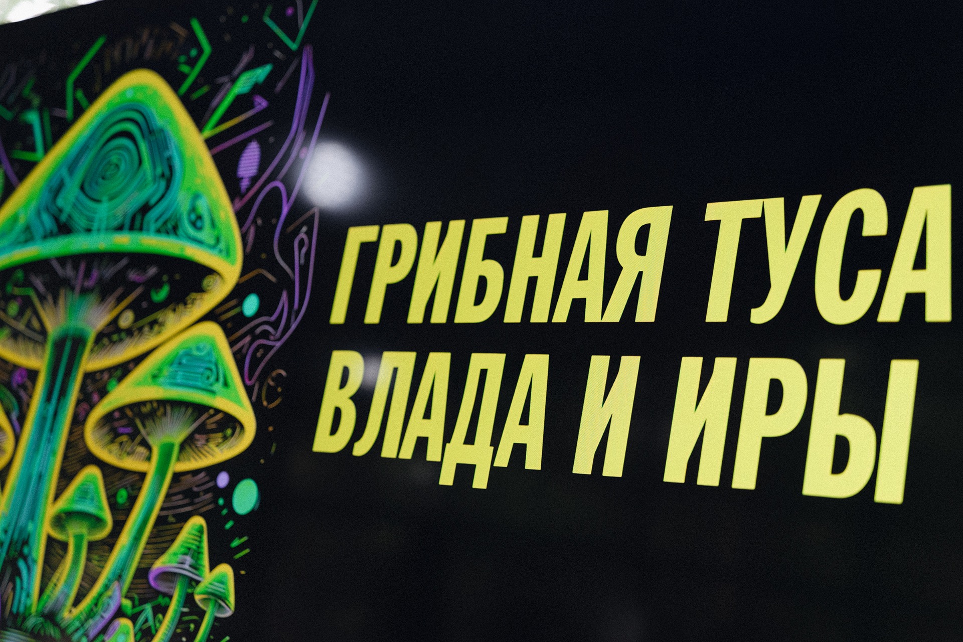 А ещё мы волонтёры в приюте для животных «Зов предков» уже 6 лет. Поэтому я попросила включить в декор фото наших подопечных собак. Остальное мы отдали в руки декоратора. Считаю, что Таня из студии «Колибри» почувствовала нас до тончайших деталей. Идею для торта мы, кстати, сгенерировали с помощью GPT, запрос был: «кислота и грибы».