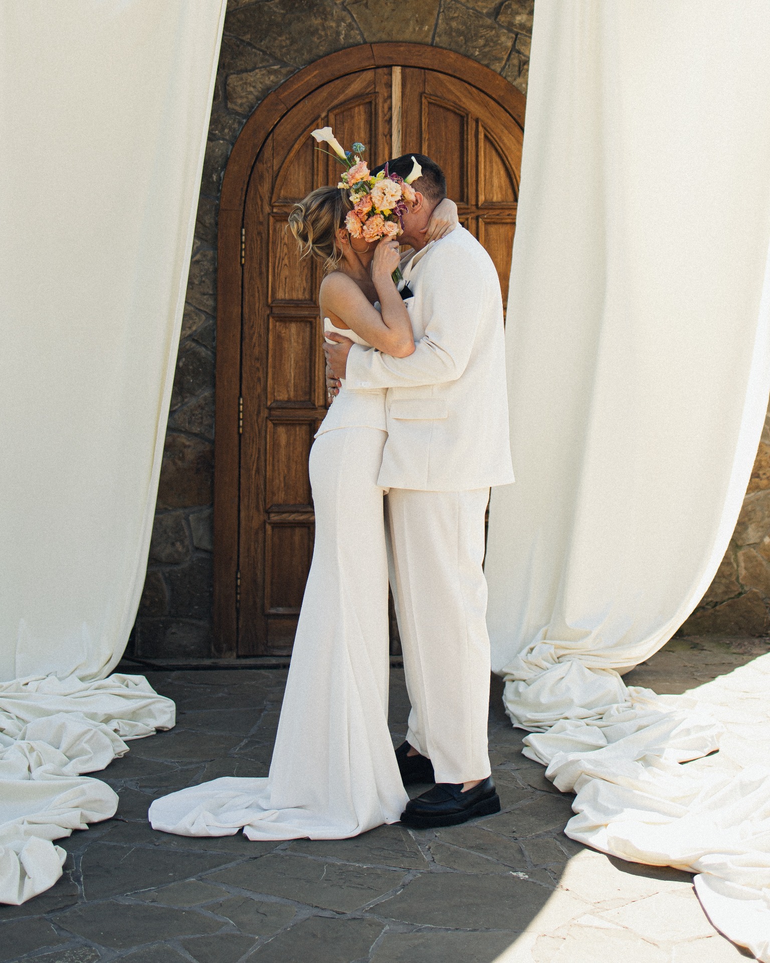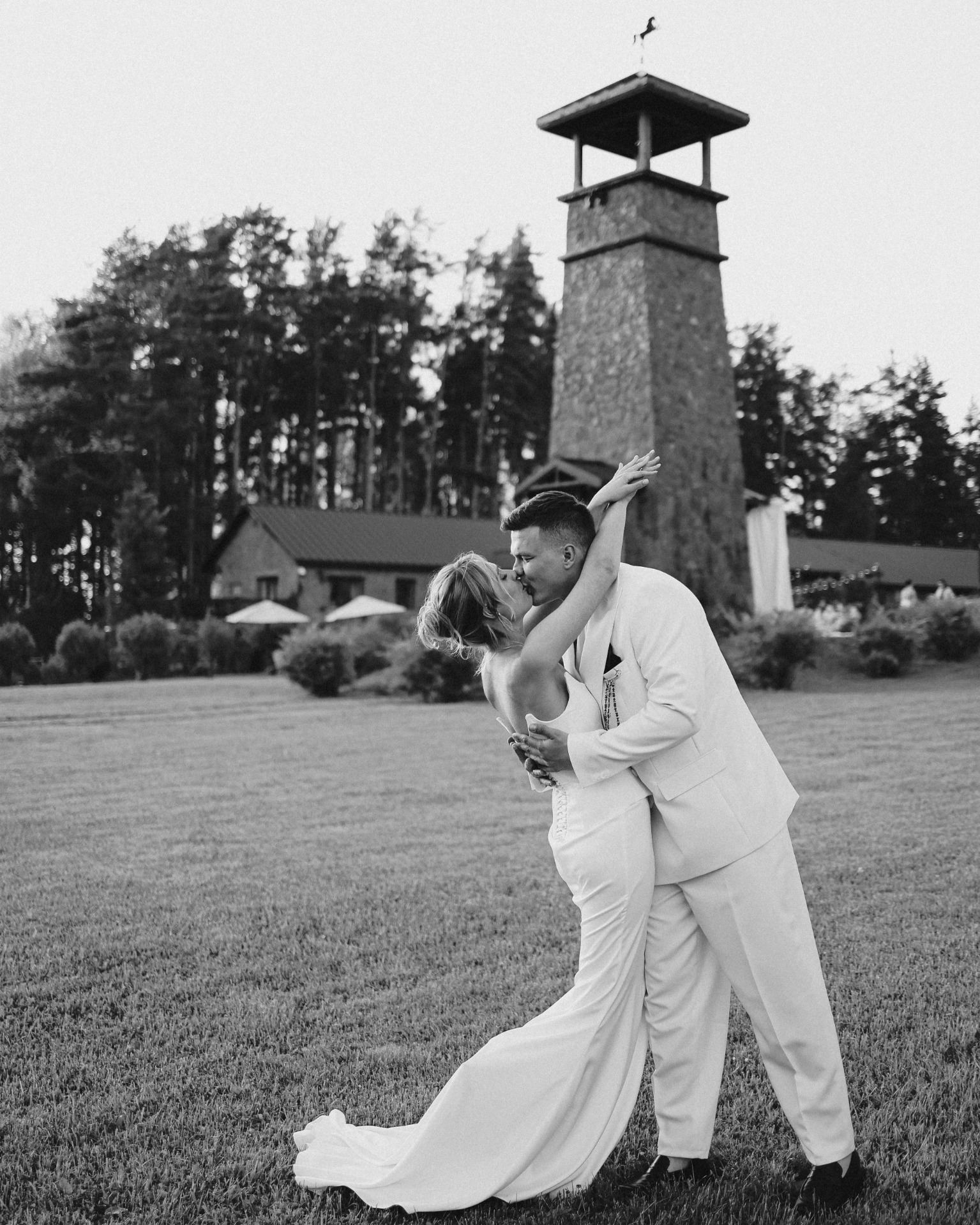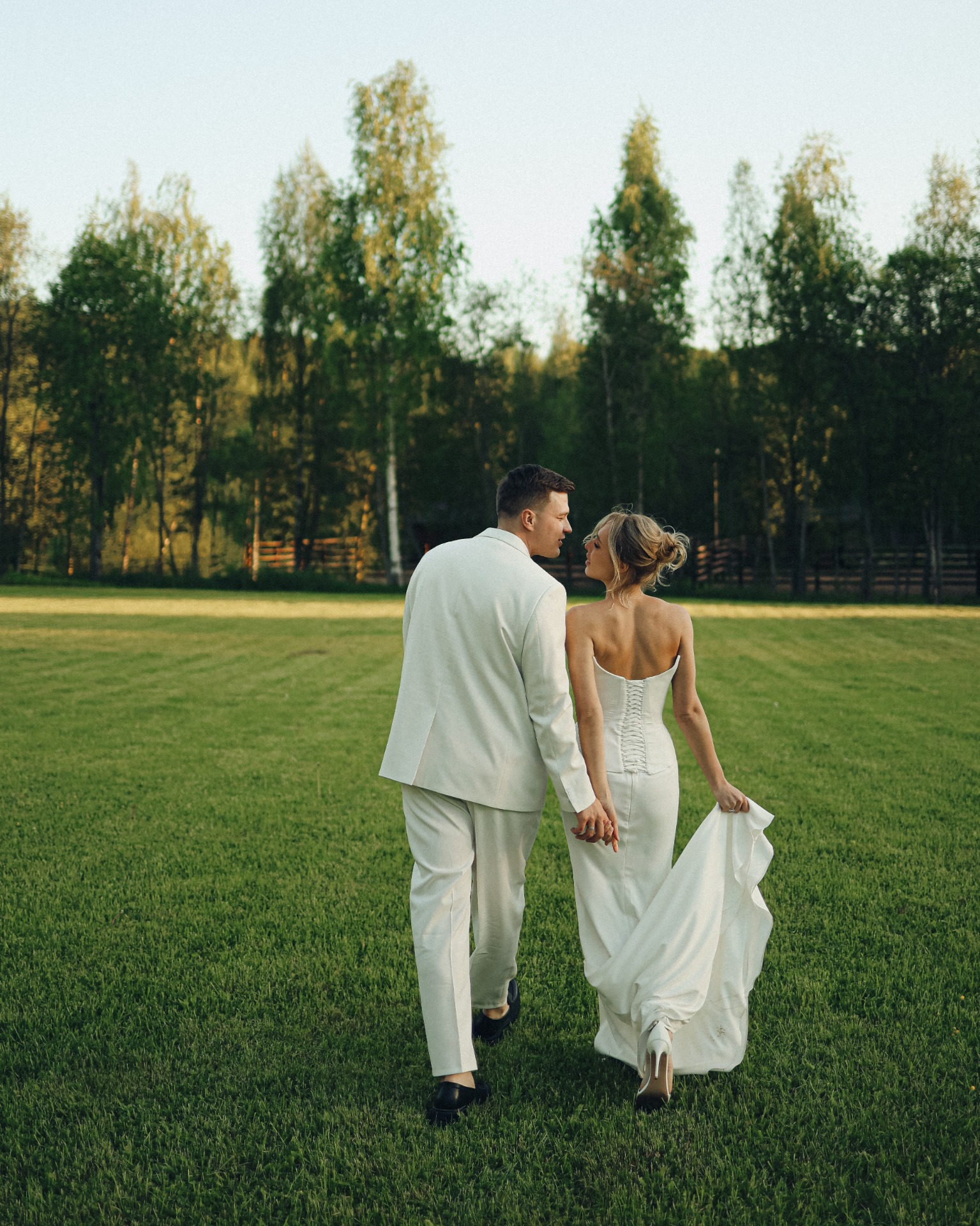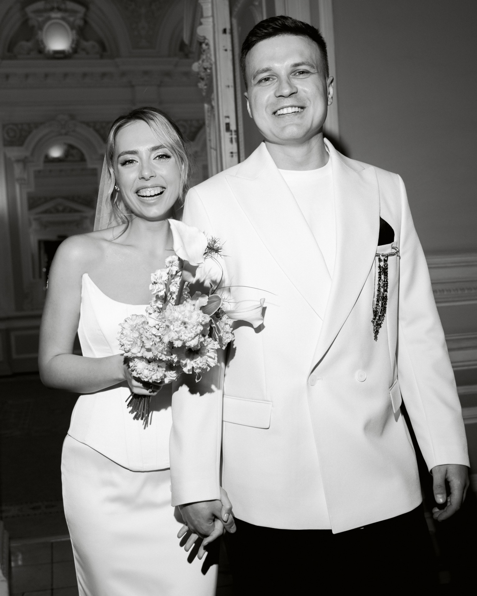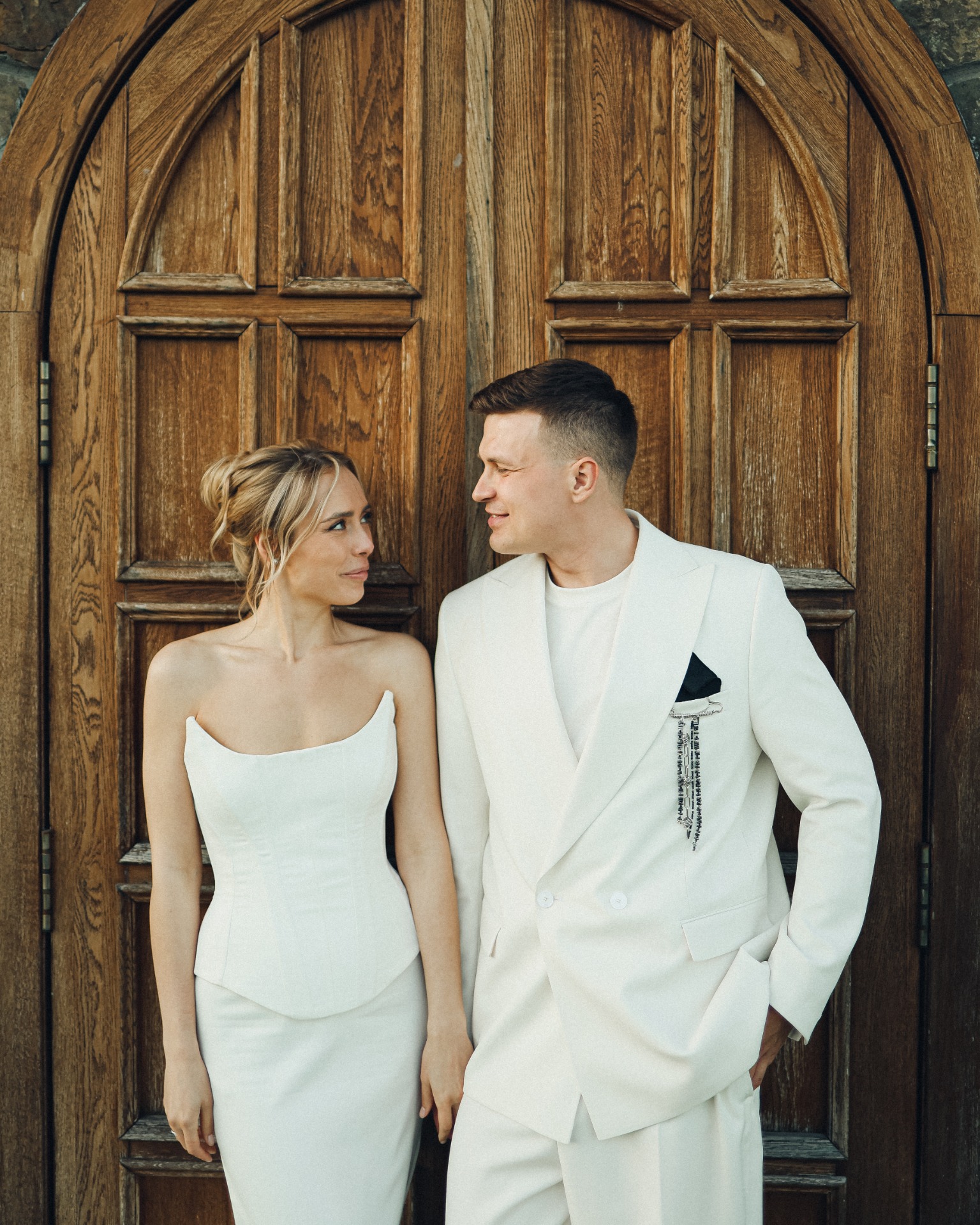 Мы сразу знали, что оба хотим быть в белых нарядах. Вася выбрал костюм молочного оттенка — не самое очевидное решение, но идеально подходящее нам.