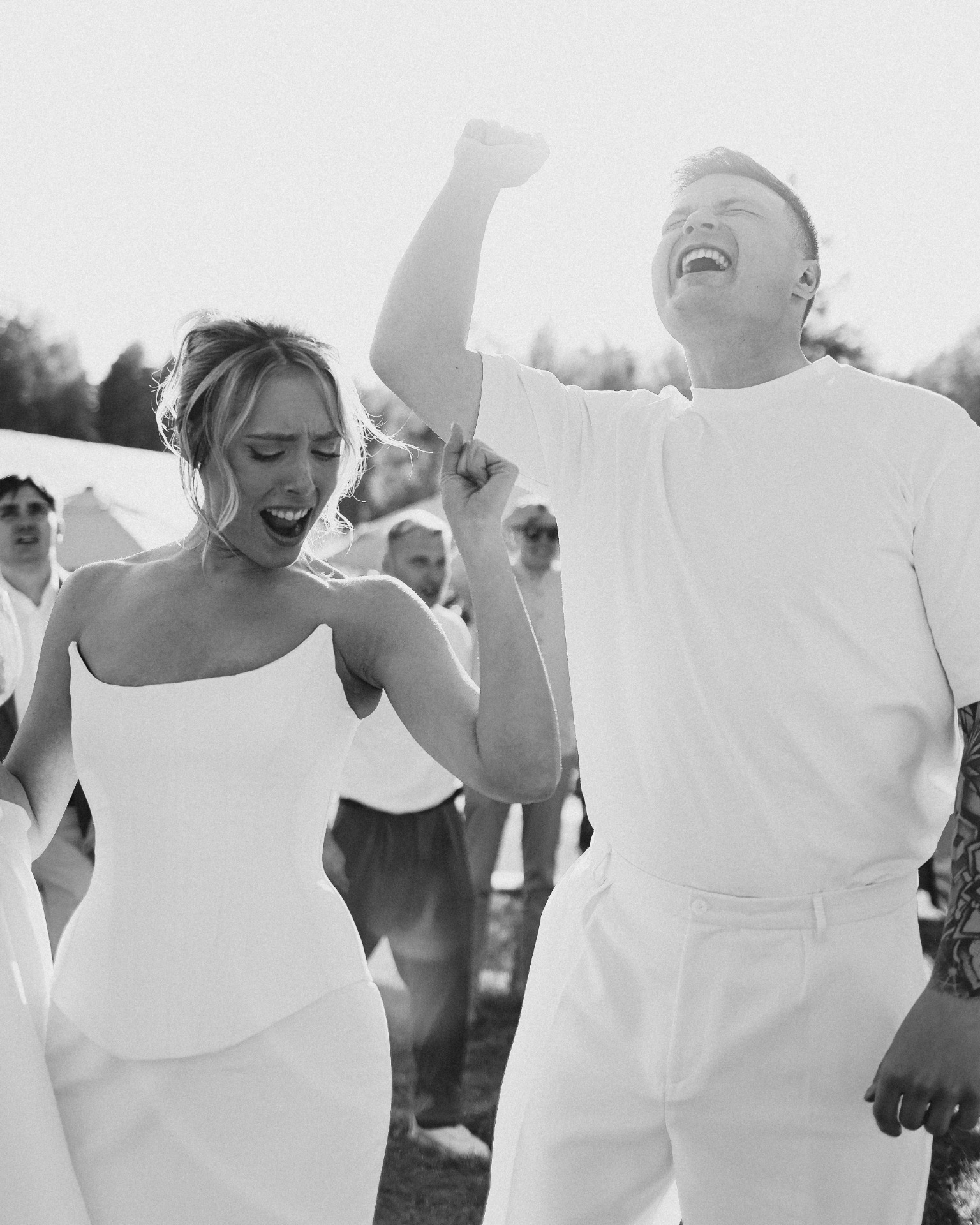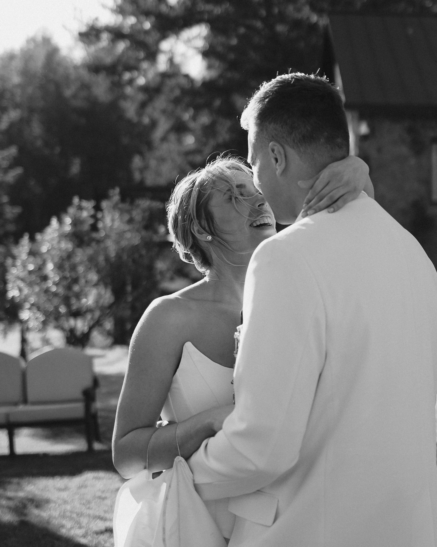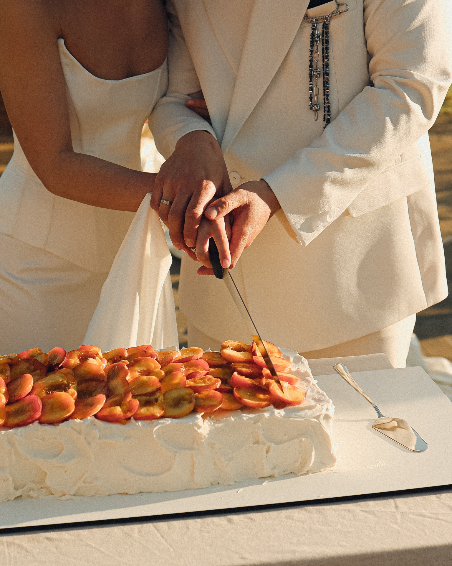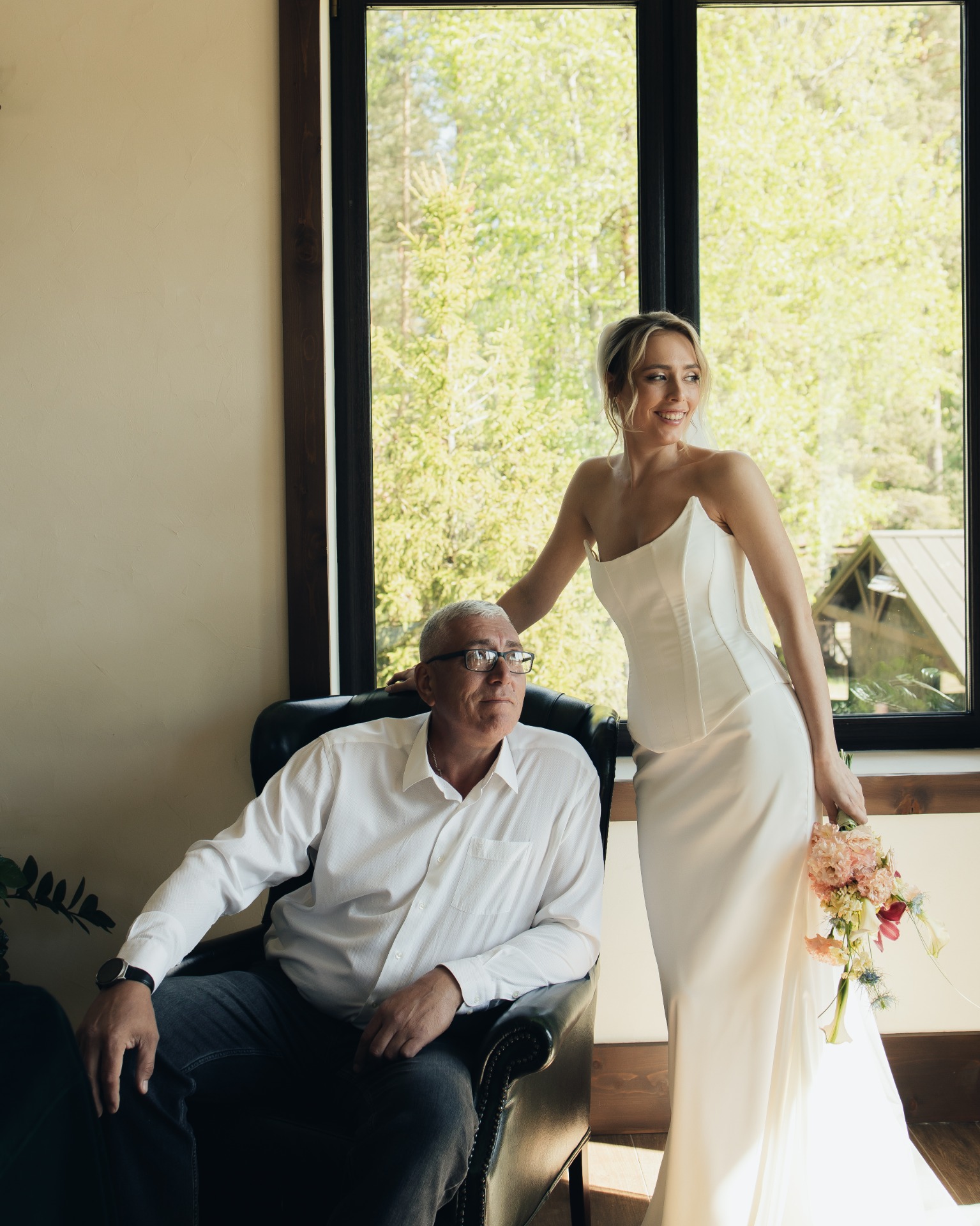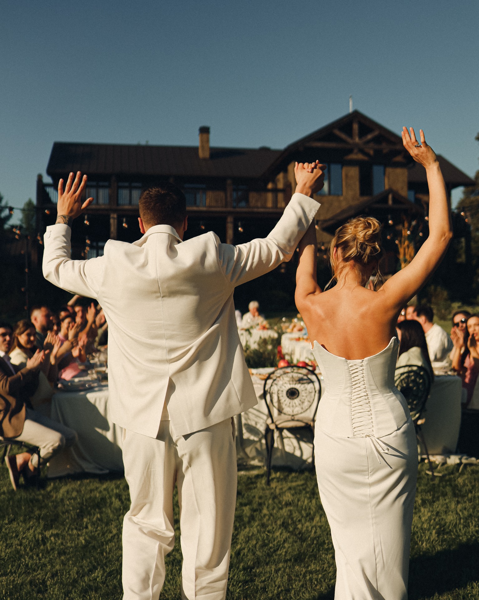 Мы сразу знали, что оба хотим быть в белых нарядах. Вася выбрал костюм молочного оттенка — не самое очевидное решение, но идеально подходящее нам.