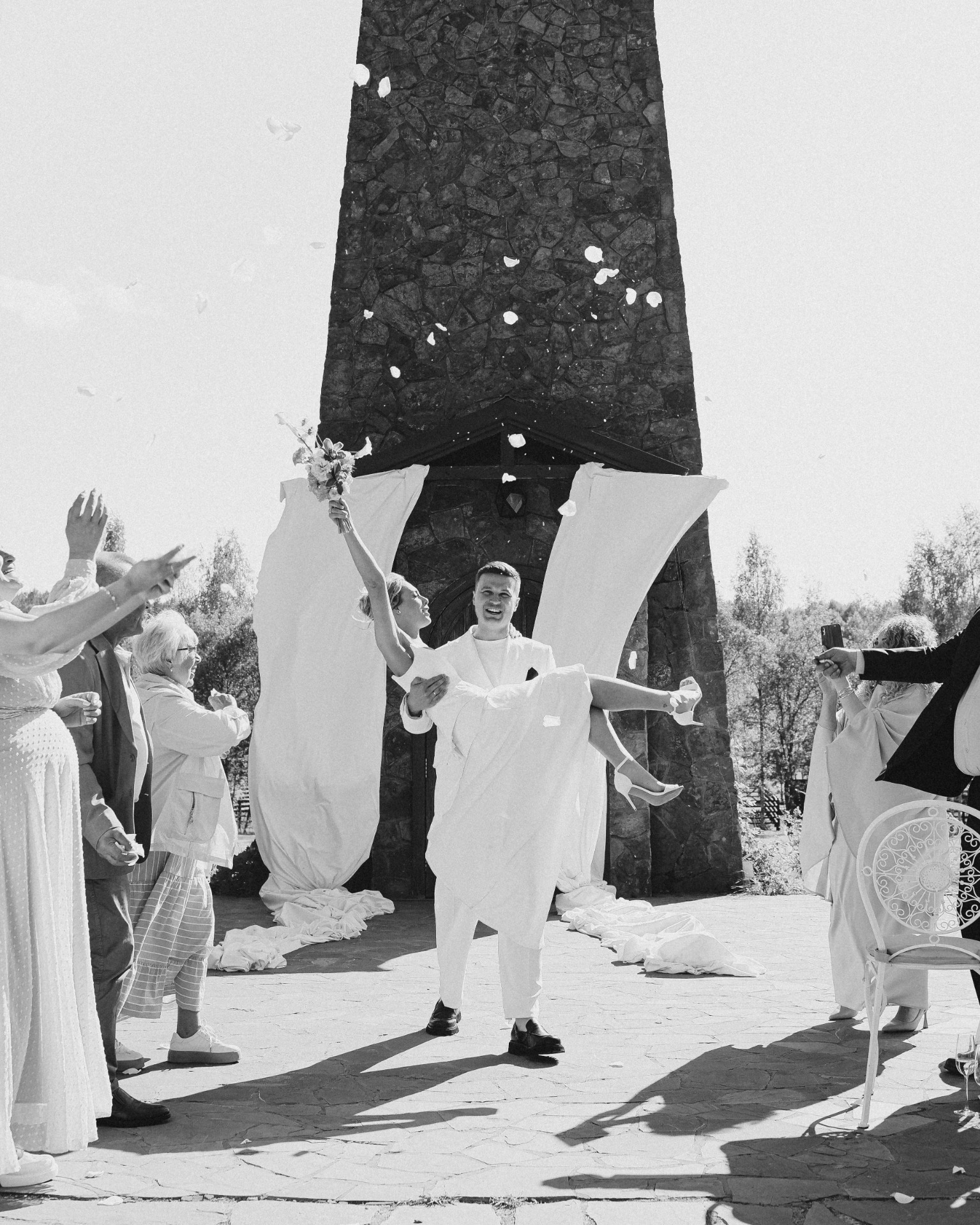 После ЗАГСа мы приехали на площадку, где нас ждали друзья. Перед церемонией каждому гостю мы вручили персональное письмо со словами благодарности и нашими воспоминаниями о них. Когда приглашённые читали их, многие не смогли сдержать слёз. Атмосфера была по-настоящему трогательной. Церемония получилась наполненной теплом, искренними словами и большим смыслом.