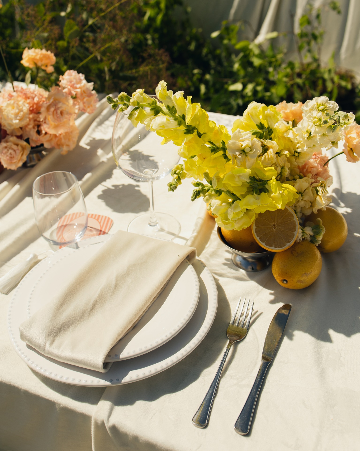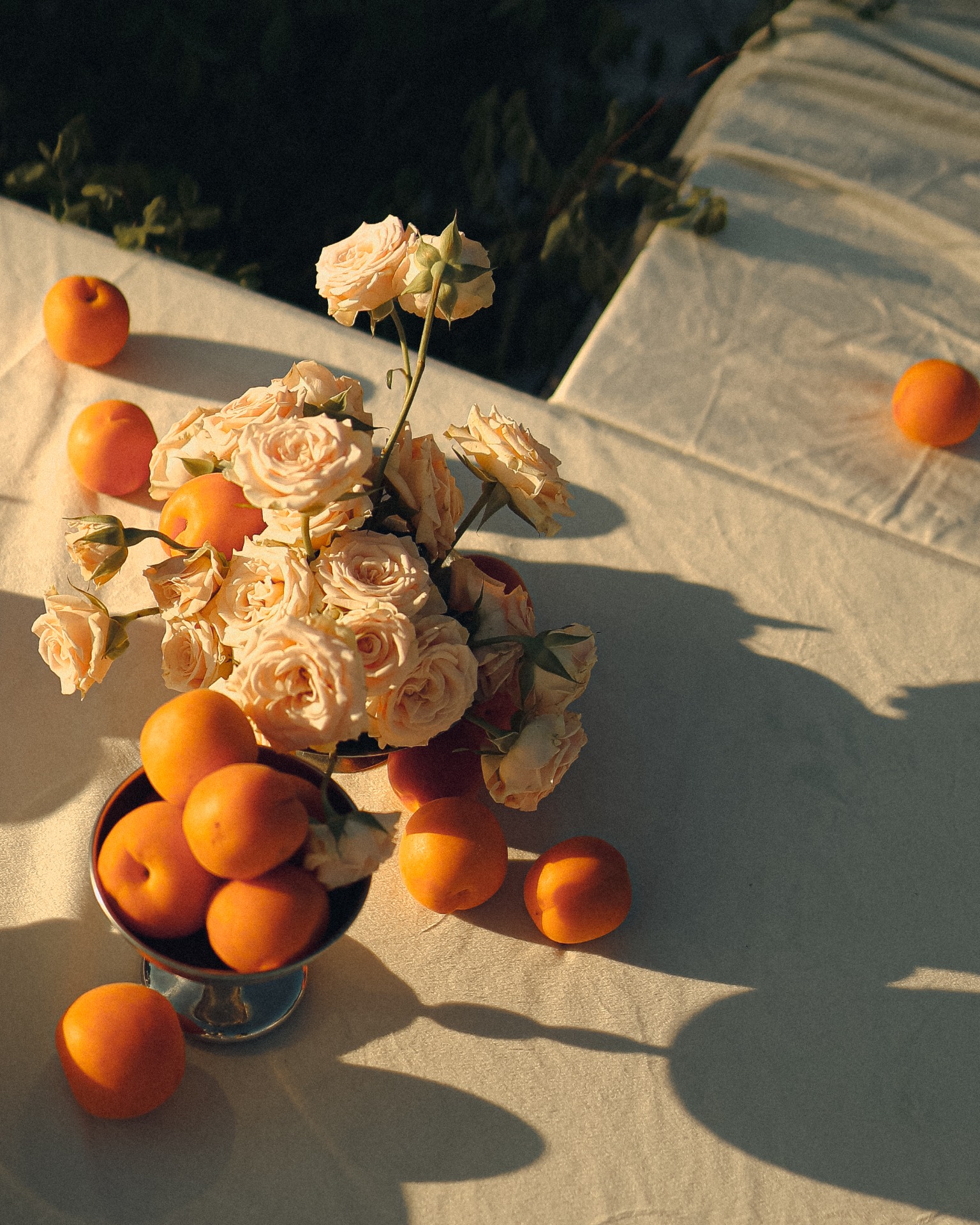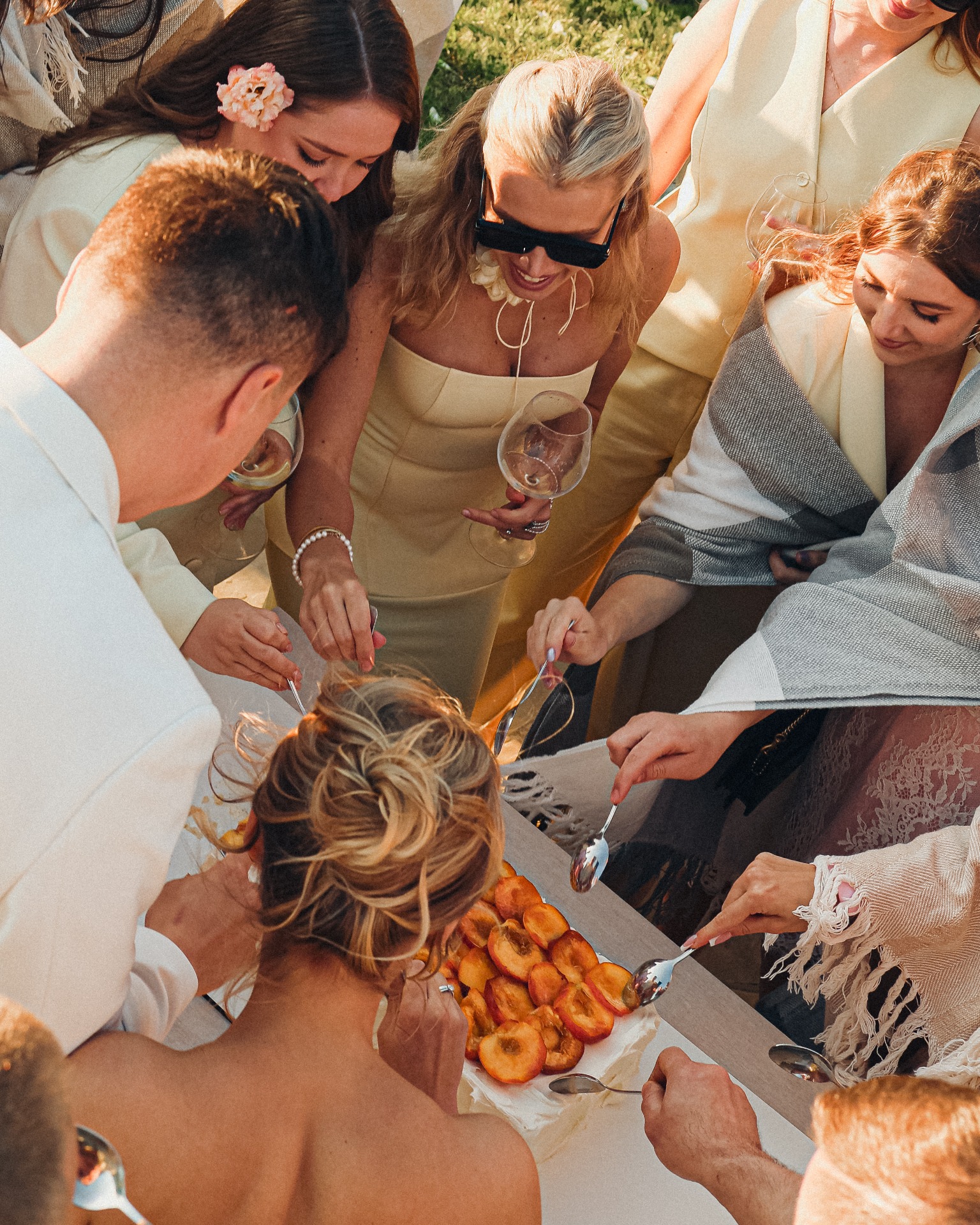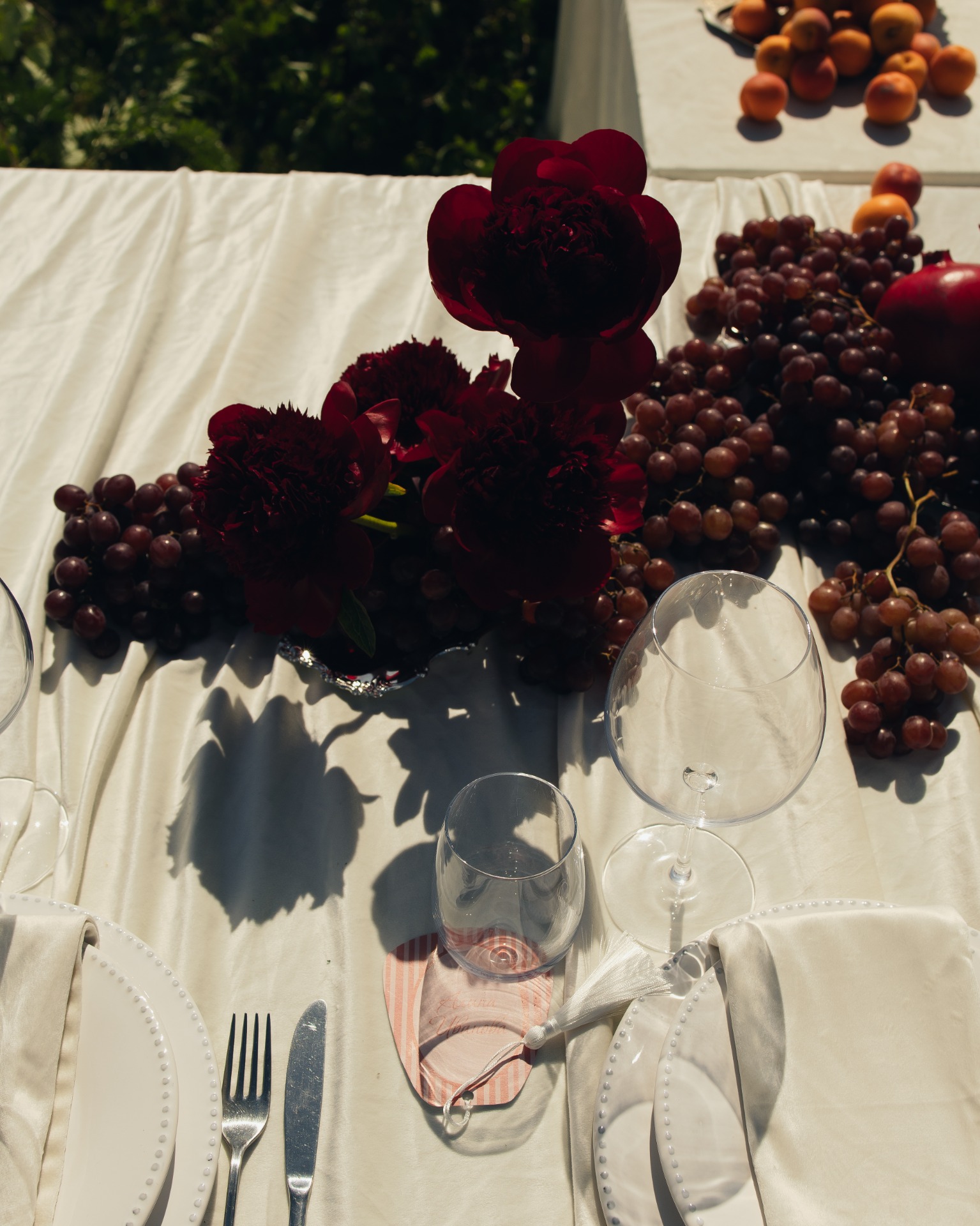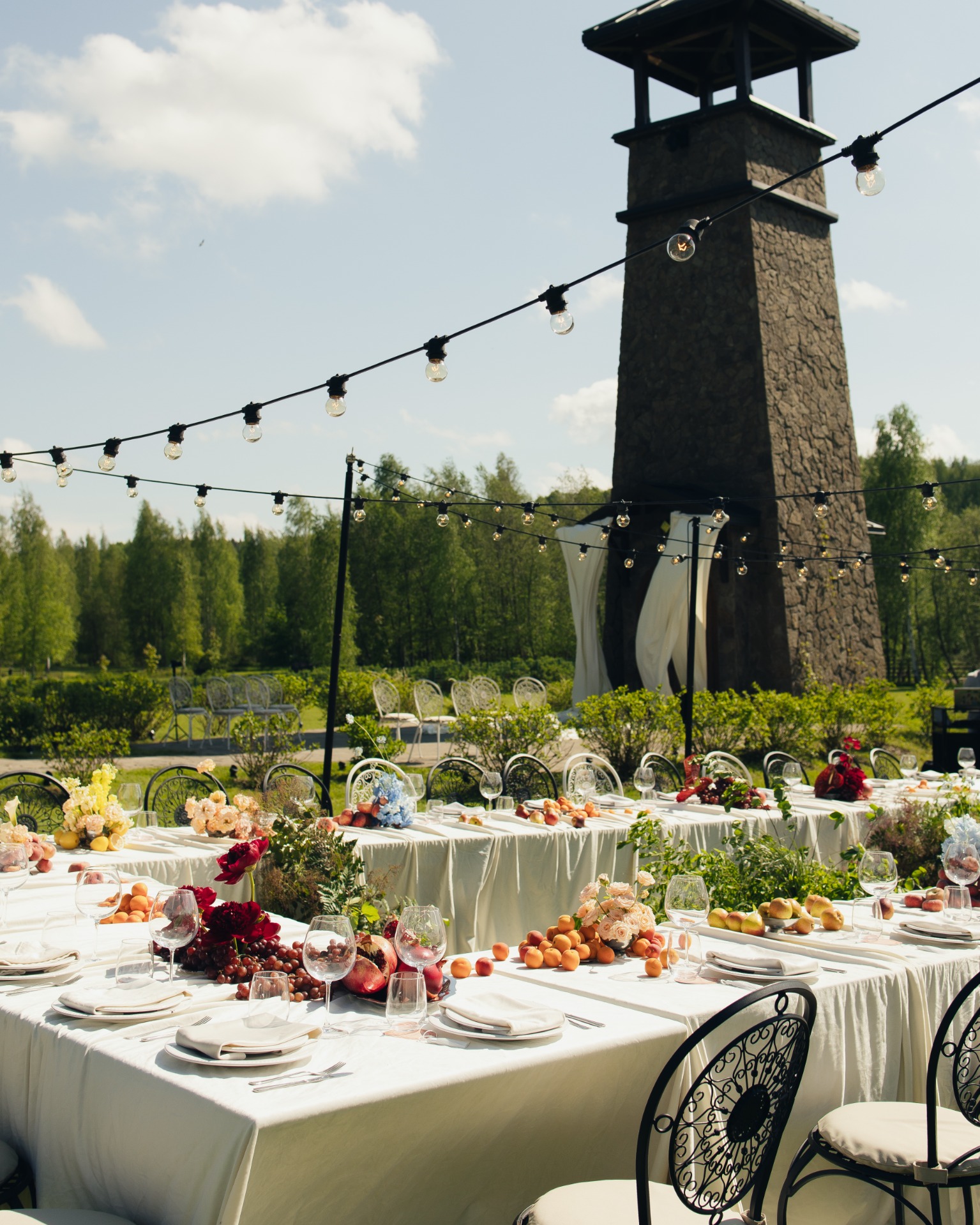 В основу декора легли акварельные оттенки: голубой, розовый, персиковый, лавандовый, оливковый, лимонный. Эта нежная палитра проходила через все детали: от флористики до полиграфии. На столах было много фруктов, а главным акцентом стал торт, украшенный сочными персиками, которые стали символом тепла, лёгкости и радости.