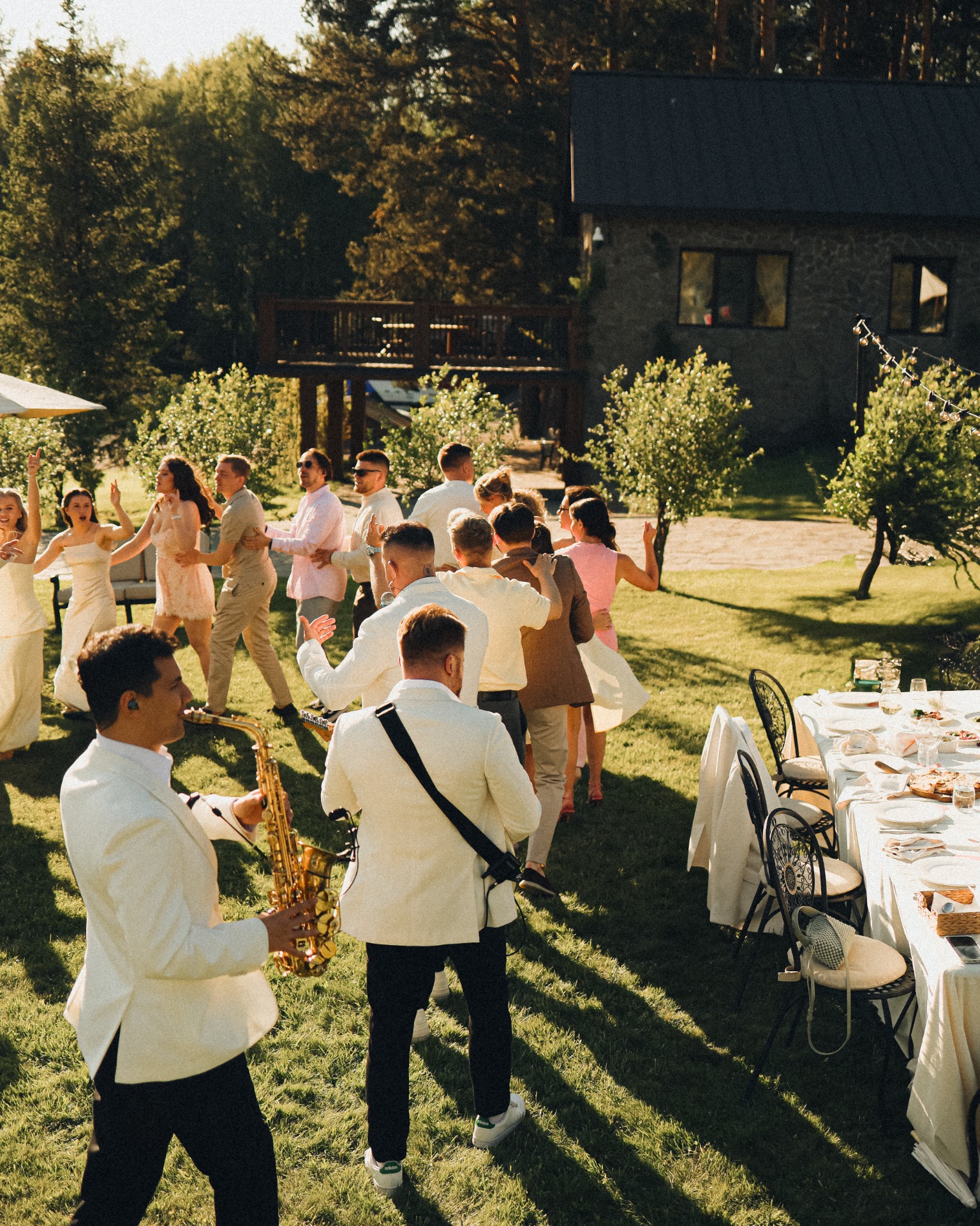 Вечер прошёл легко и очень весело. Мы отказались от длинных конкурсов и решили сделать акцент на танцах и музыке. Поэтому пригласили кавер-группу и организовали игру в «угадай песню» с заранее записанными треками, которые мы подготовили вместе с Васей.