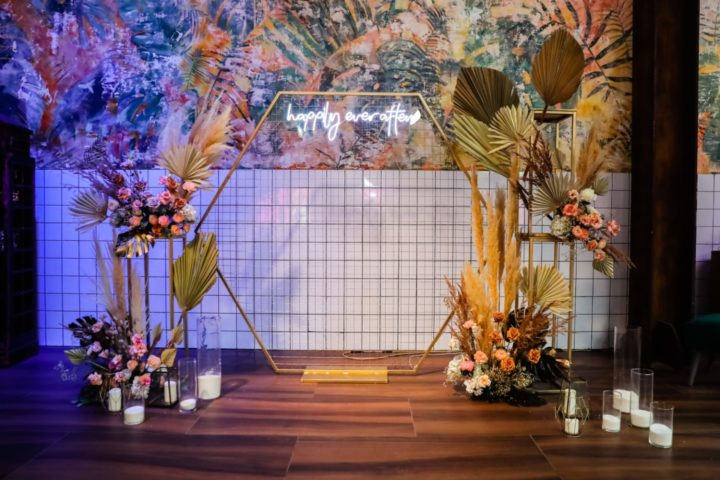Наш выбор пал на зал Andy, это была однозначно любовь с первого взгляда. Высокие потолки, кирпичные стены, большие и нестандартные окна, зеркала, люстры, огромная сцена + светодиодный экран во всю стену. В оформлении зала за основу брали серые тона, дополненные нюдово-бежевой флористикой с сухоцветами и пампасной травой. Плюс к этому черные и золотые детали в декоре. Для фотозоны использовали асимметричные колонны, композиции в нашей стилистике и неон. Декораторы учли каждую деталь, все было стильно и гармонично.