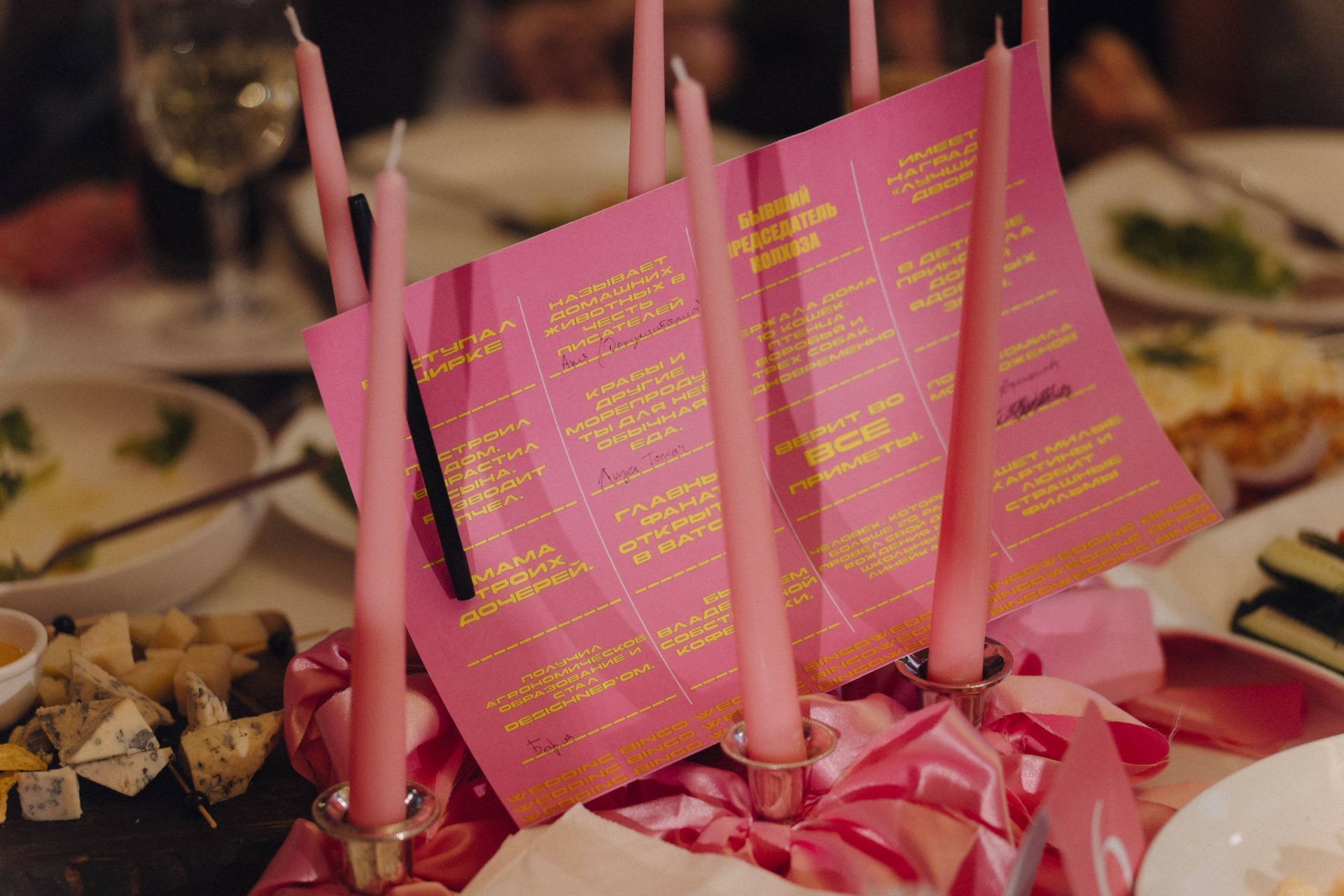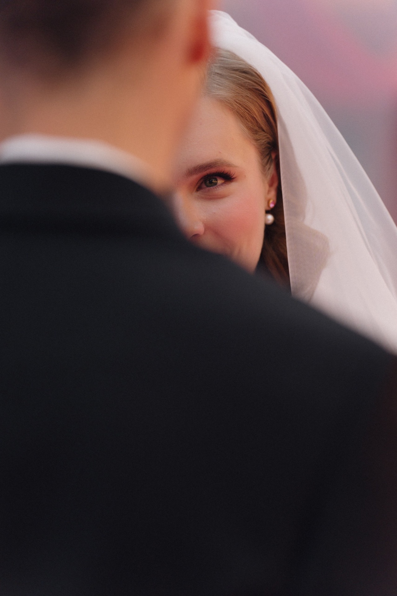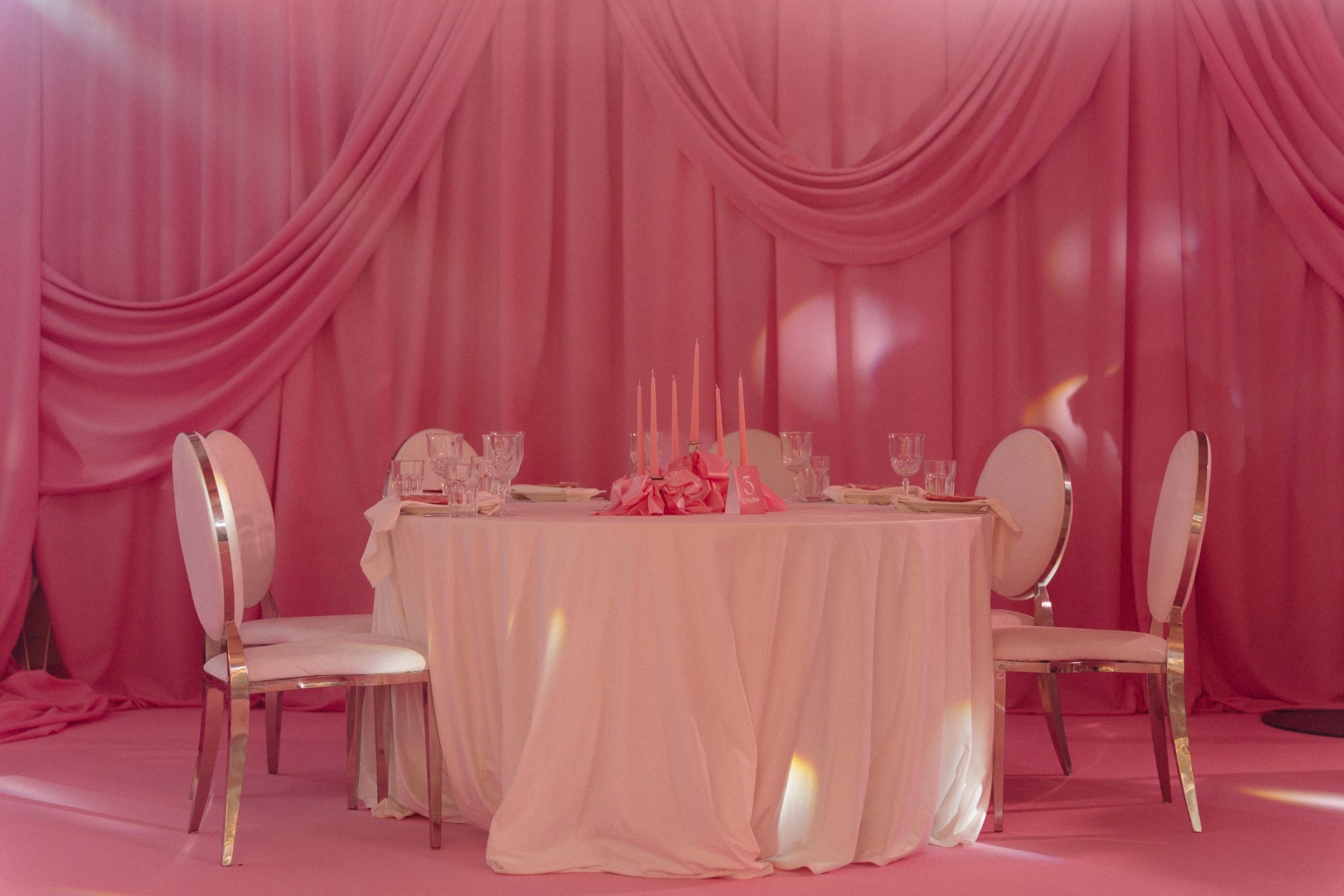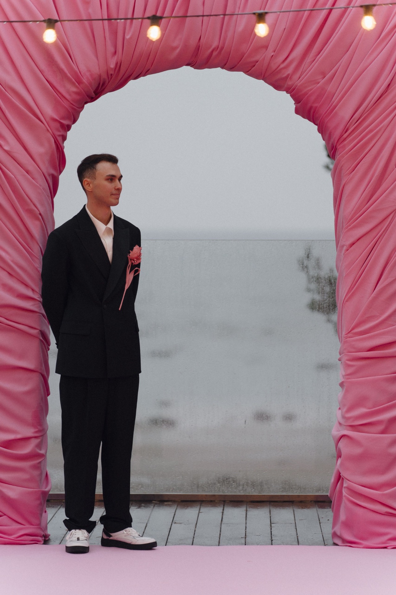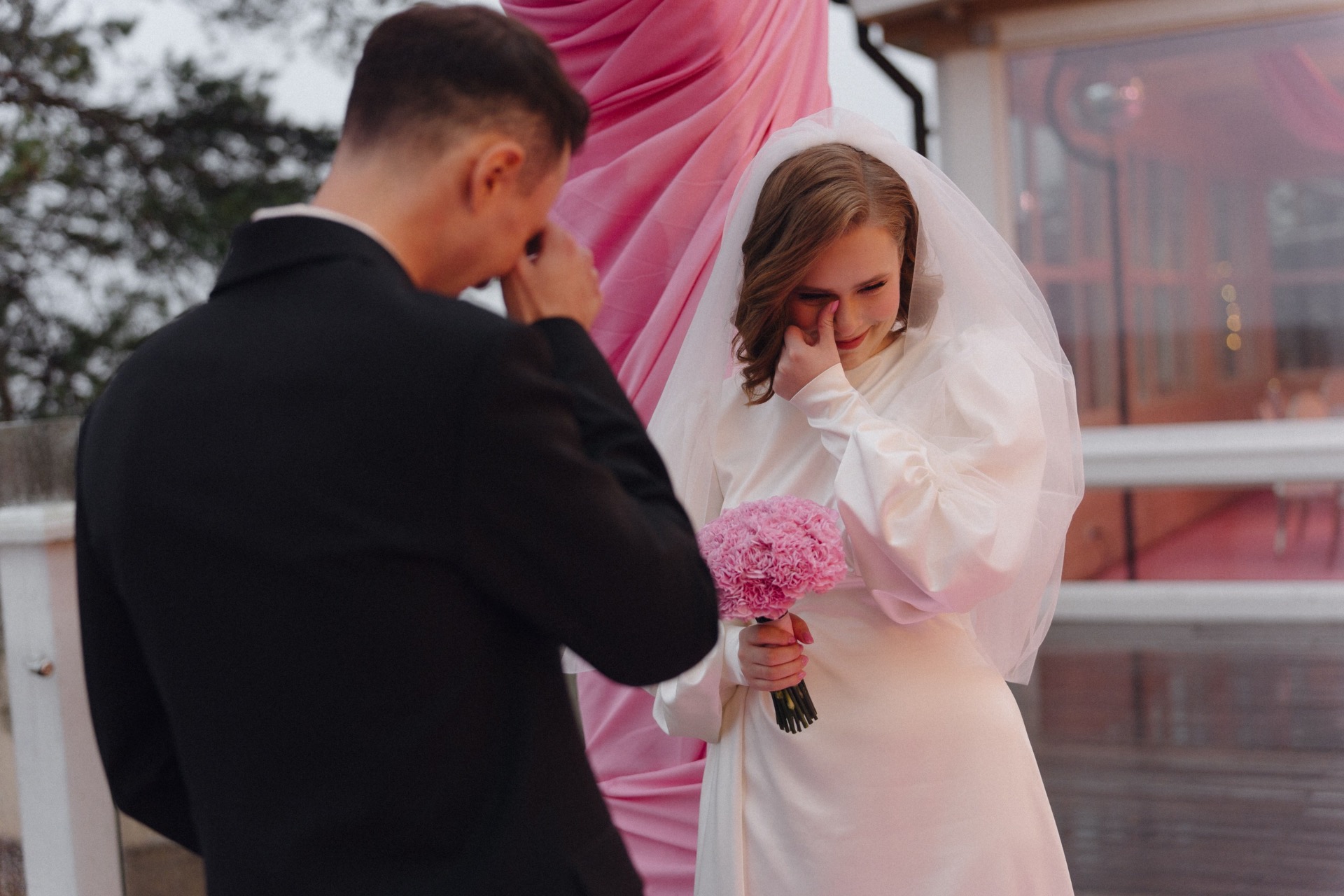 Концепция свадьбы появилась у нас сразу: мы хотели драпировки, место у воды и никаких живых цветов. Единственное, что изменилось уже в процессе — появился розовый цвет. Его предложил Глеб, когда узнал, что теперь это мой новый любимый оттенок.