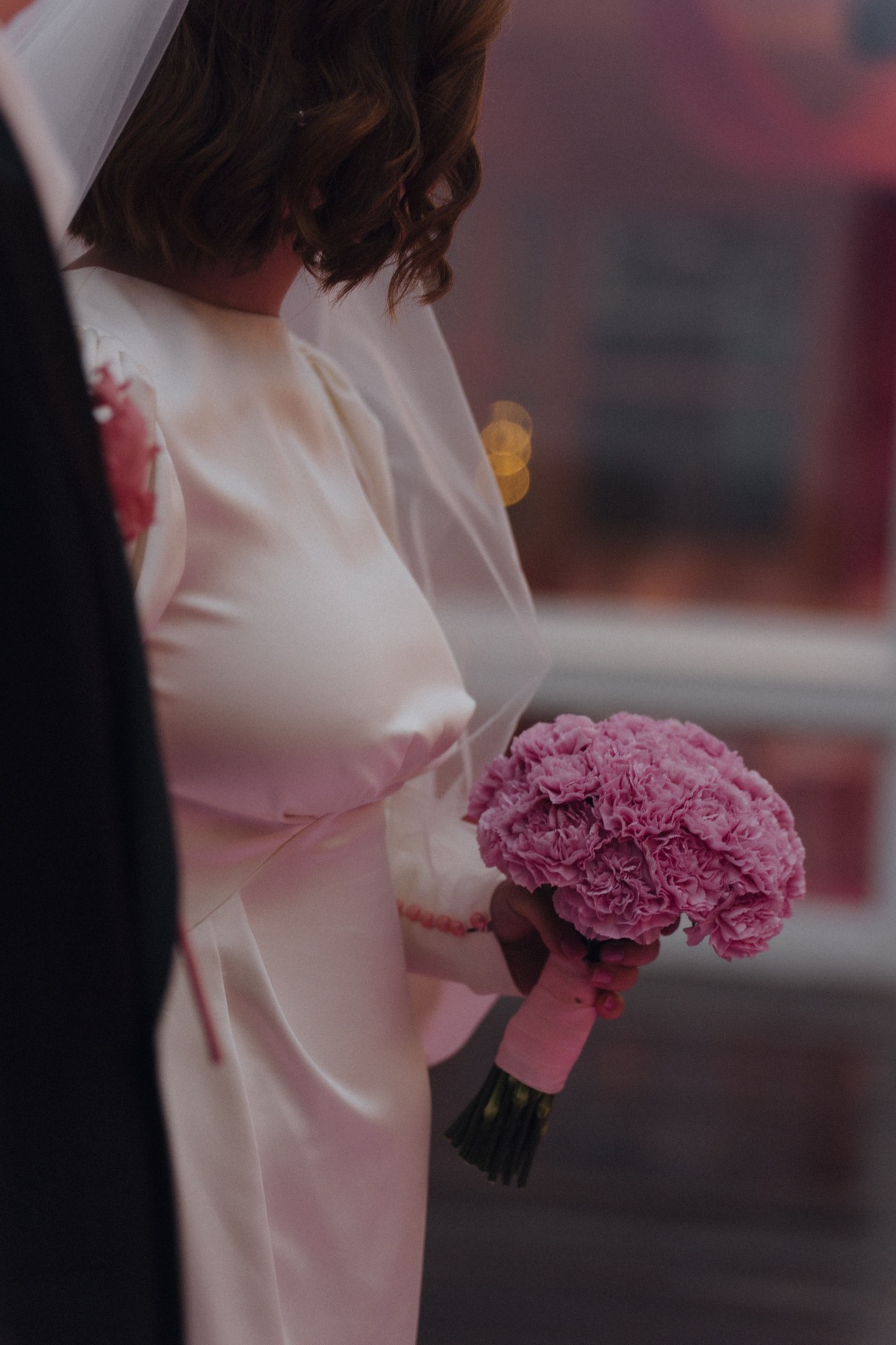 Мы хотели классику, но с легкими отсылками к деталям декора. Так у меня появились розовые пуговицы и розовые туфли, а у Глеба — розовый тканевый цветок. Моё платье было от бренда Seashell, а костюм для Глеба мы сшили в House of Leo.