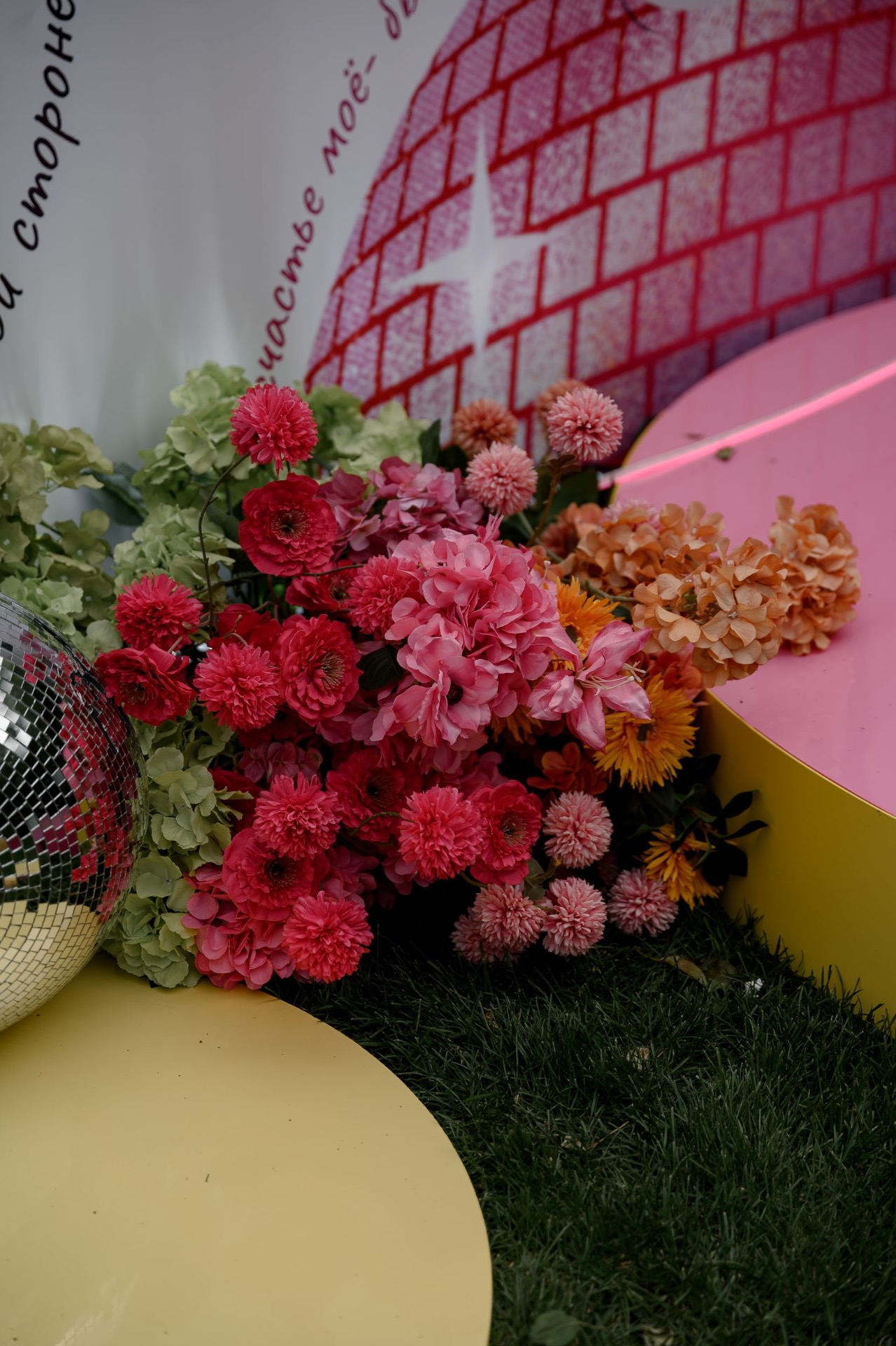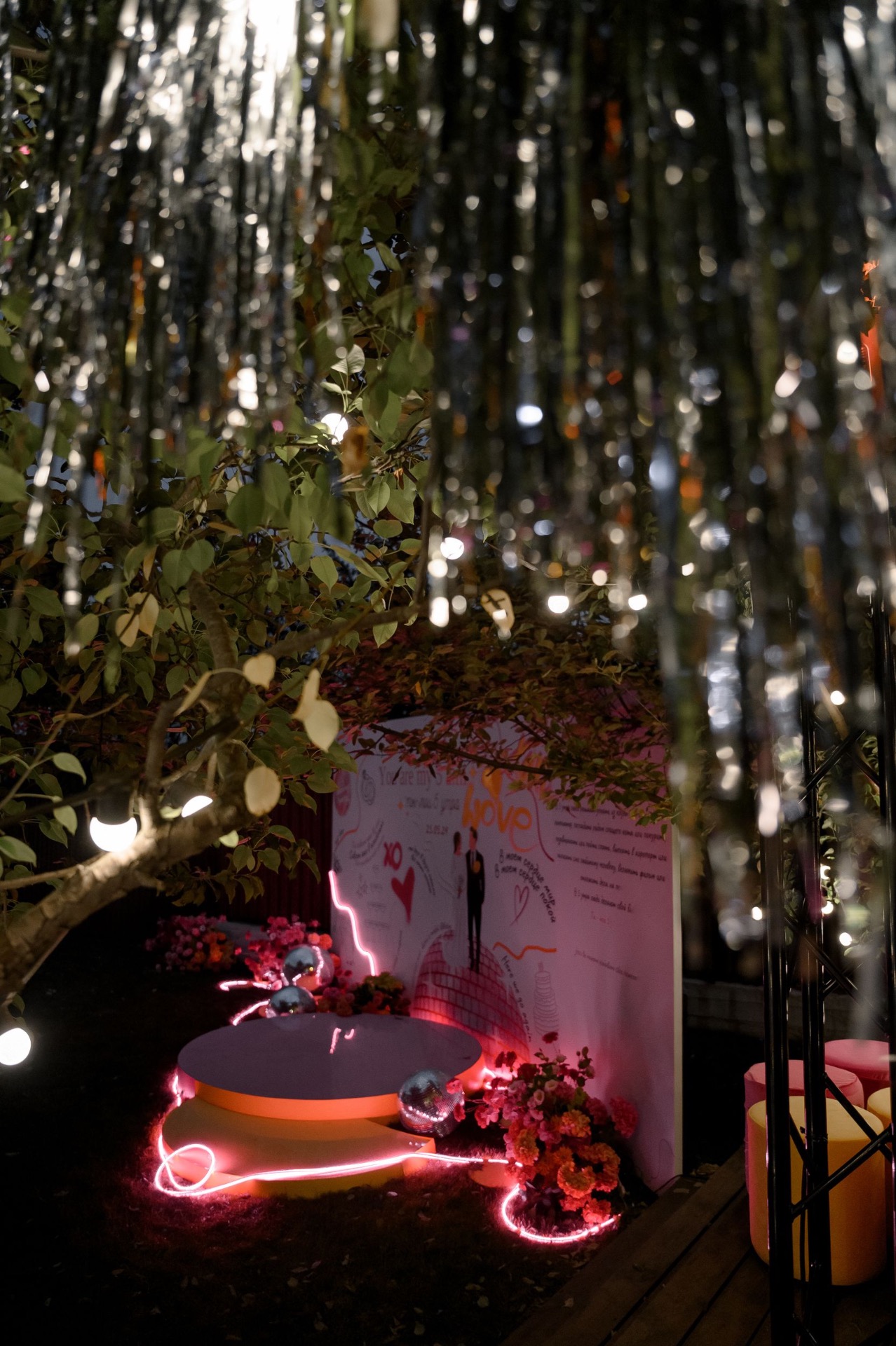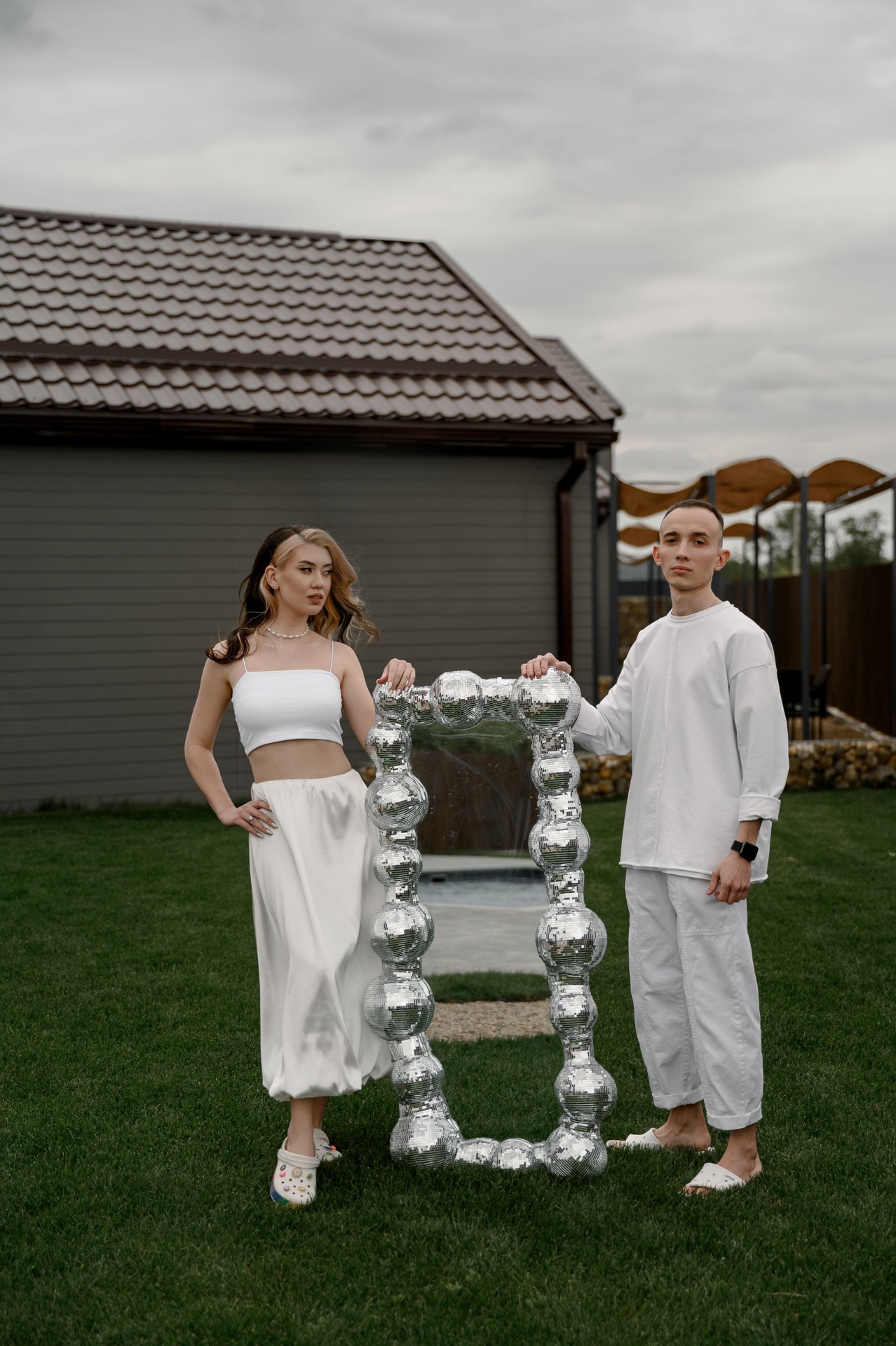 Нам хотелось яркую вечеринку с диско шарами. Мы даже сами сделали зеркало из диско-мозаики для нашего дня. Также я сама сделала макет баннера, который служил выездной церемонией и фотозоной. На нём были написаны строчки из песен, которые описывают нашу пару и пингвины-неразлучники.
