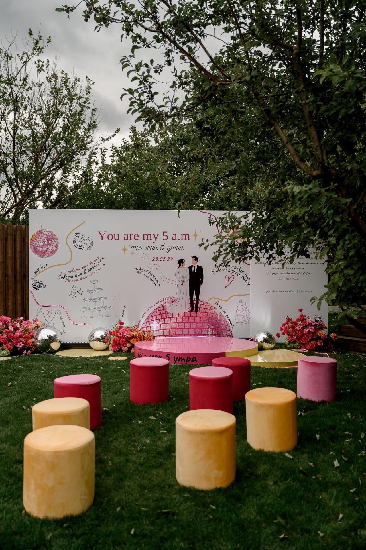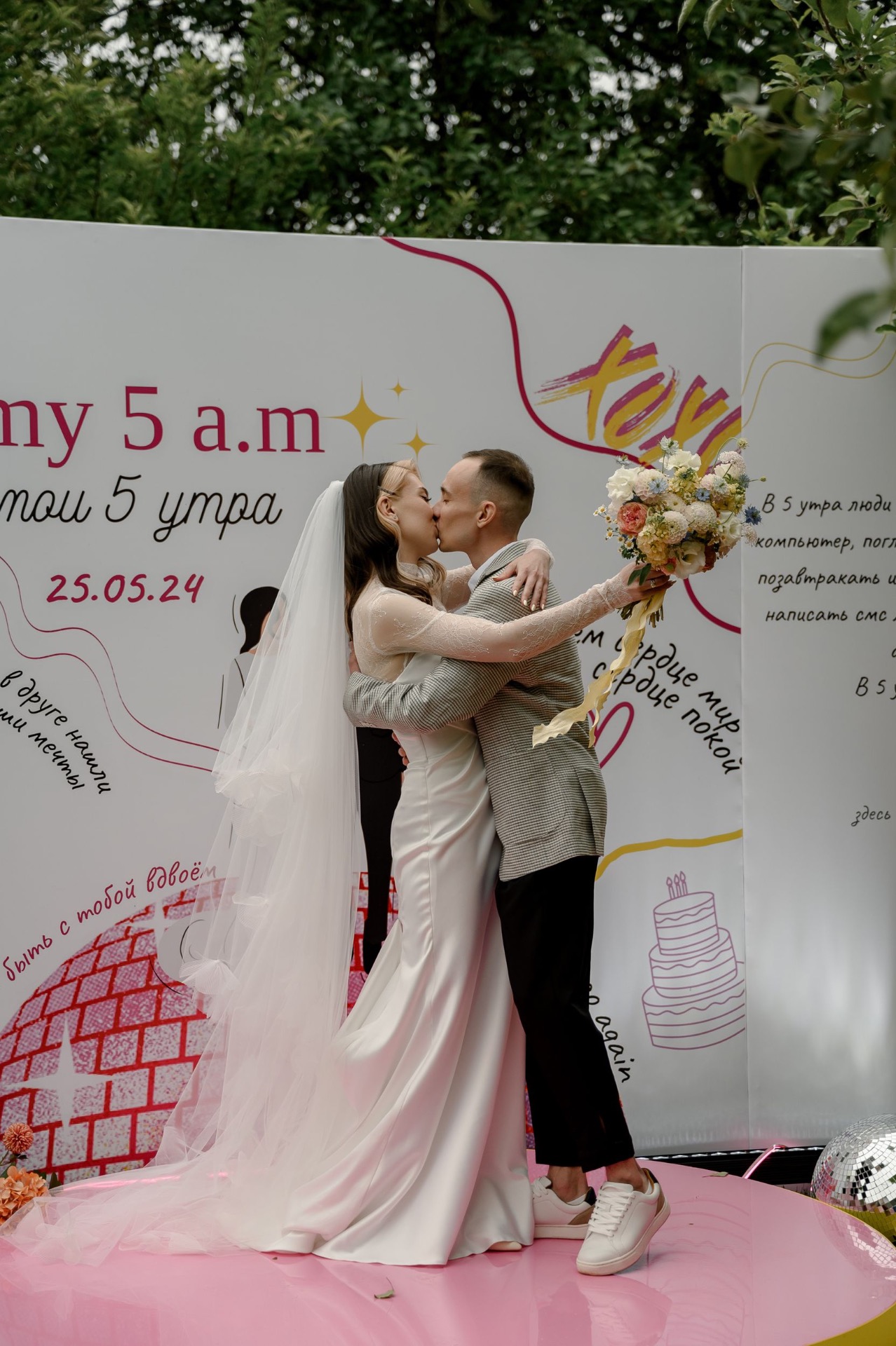 Название у свадьбы появилась не сразу. Я показала организатору карточку, которую всё время носила под чехлом телефона, её подарил Максим, на ней было написано: «you are my 5 a.m», так и родилась концепция. «Ты мои 5 утра» для нас обозначает выбор. В 5 утра люди решают уехать из клуба или отключить компьютер, погладить спящего рядом кота или покурить, позавтракать или пойти спать.