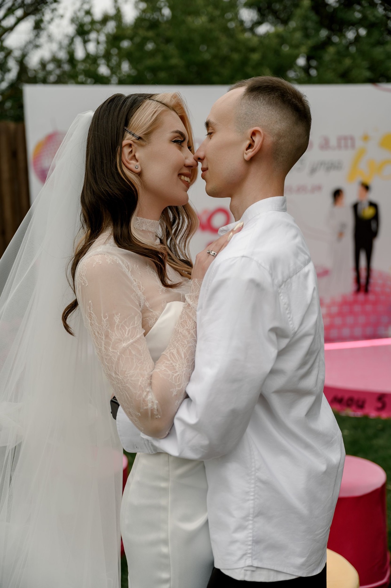 Это был самый ветреный день за весь май. Сдувало всё, шёл дождь, становилось холодно. Но всеми силами визуализации мы немного прогнали тучи и смогли провести церемонию. Кольца вынесла моя сестра. А в финале церемонии мы сами расписали баннер баллончиками, сделав отсылку к тому, что Макс как-то рисовал для меня граффити.