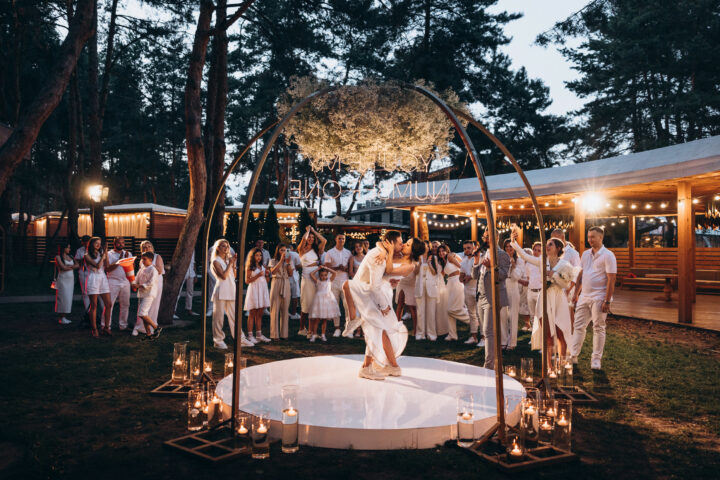 Все гости должны были быть в белом. Так мы разорвали шаблон: «Белый – только цвет невесты». Я очень хотела одеть гостей в один цвет. Но понимала, что розовый, голубой и любые другие цвета имеют разные оттенки. Но с белым все было легче и красивее. Это стало одной из «фишек» свадьбы. Флористику решили тоже делать белого цвета: выбрали гипсофилу для украшения зала, столов и торта.