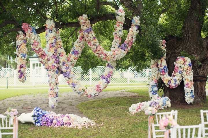 К месту церемонии вели белоснежные кованые ворота, словно открывая для молодоженов и их гостей двери в невероятную сказку. Благодаря взрыву цветов, небрежно раскиданных по всей зоне церемонии, создавалось впечатление, что гости попали в цветущий сказочный сад, где живут диковинные животные и неведомые сказочные существа!