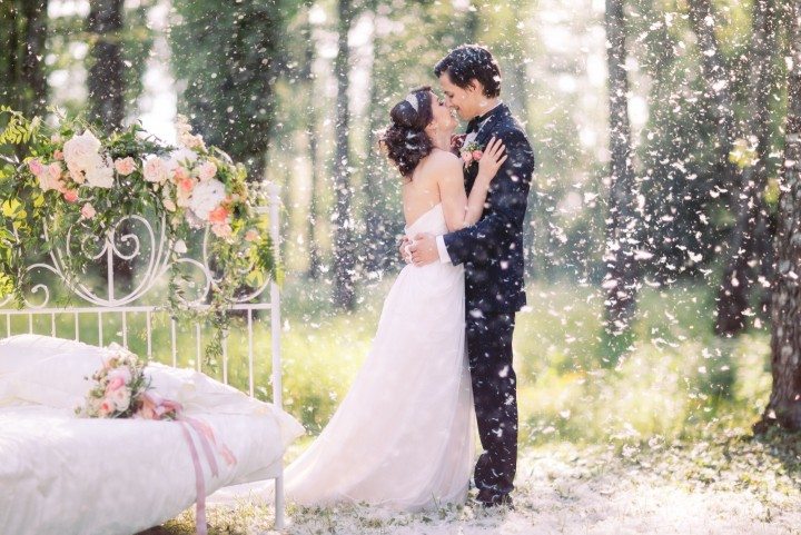 Когда все были готовы, мы отправились на фотосессию. Для начала решили протестировать дым и тут случился первый непредвиденный момент — ветер был совершенно не на нашей стороне. Дым плавно прошёл через всю территорию минут за 10, мы успели сделать буквально несколько кадров. Получилось красиво, но мало. А потом пошел дождь, но у нас под рукой были зонтики и пледы. И вот настал важный момент — вспарывание подушек. Очень сложно найти подушки с белым пухом, но нам это удалось! Сначала всё было очень здорово, словно зима летом, но к концу фотосессии ребята были с ног до головы в перьях. К счастью, визажист у нас рядом, она быстро привела Юлю и Лёшу в порядок, от перьев не осталось и следа и никто из гостей ничего даже не заподозрил.